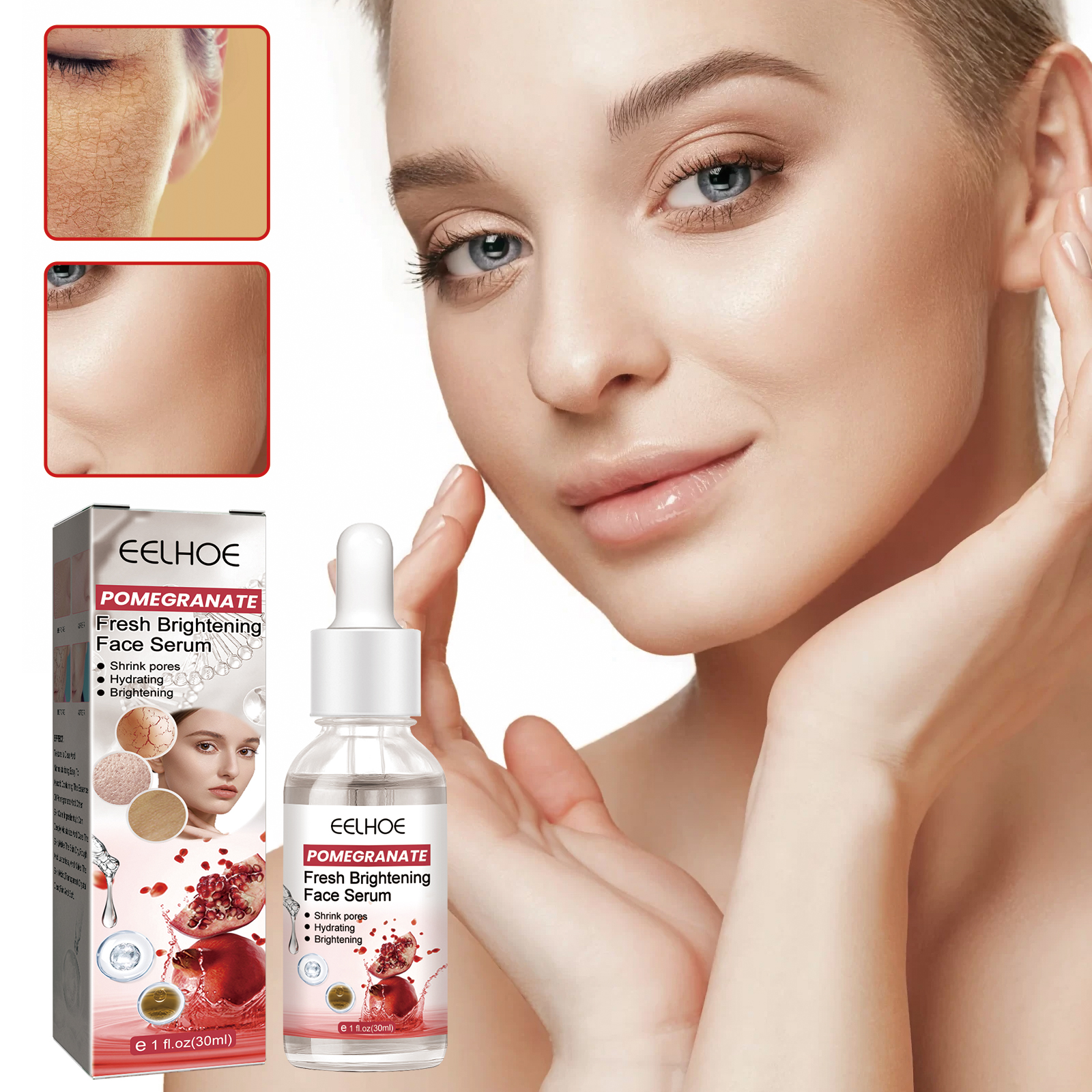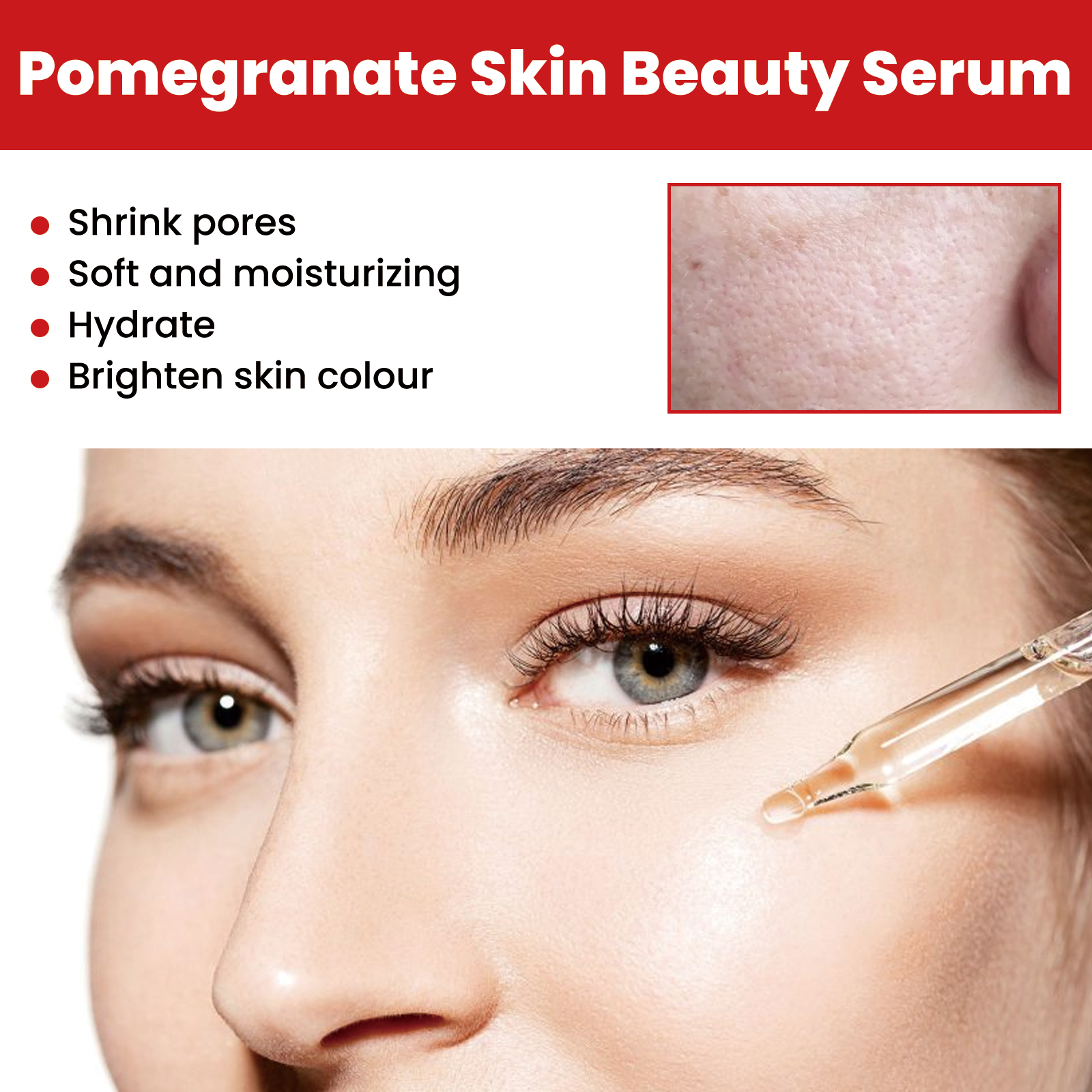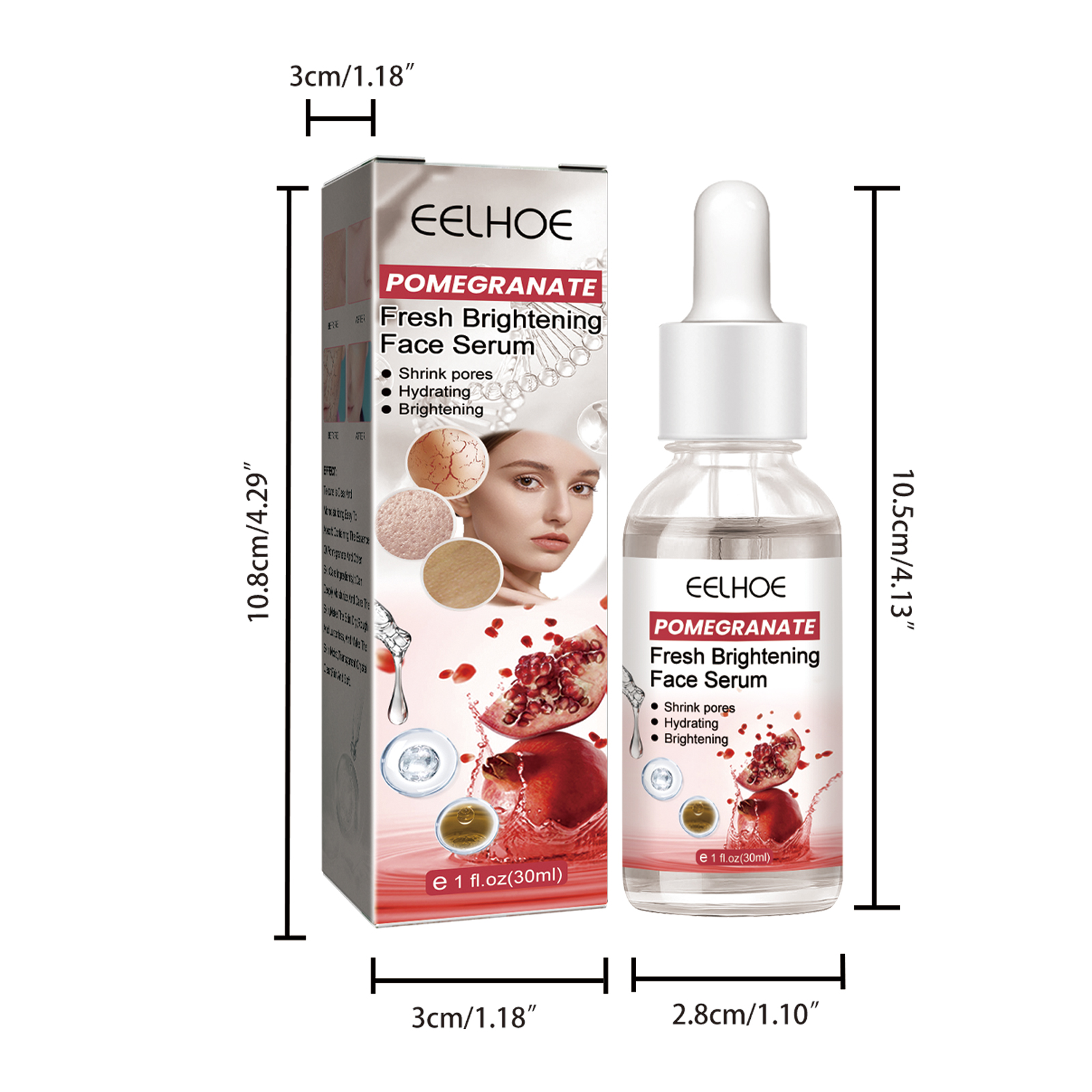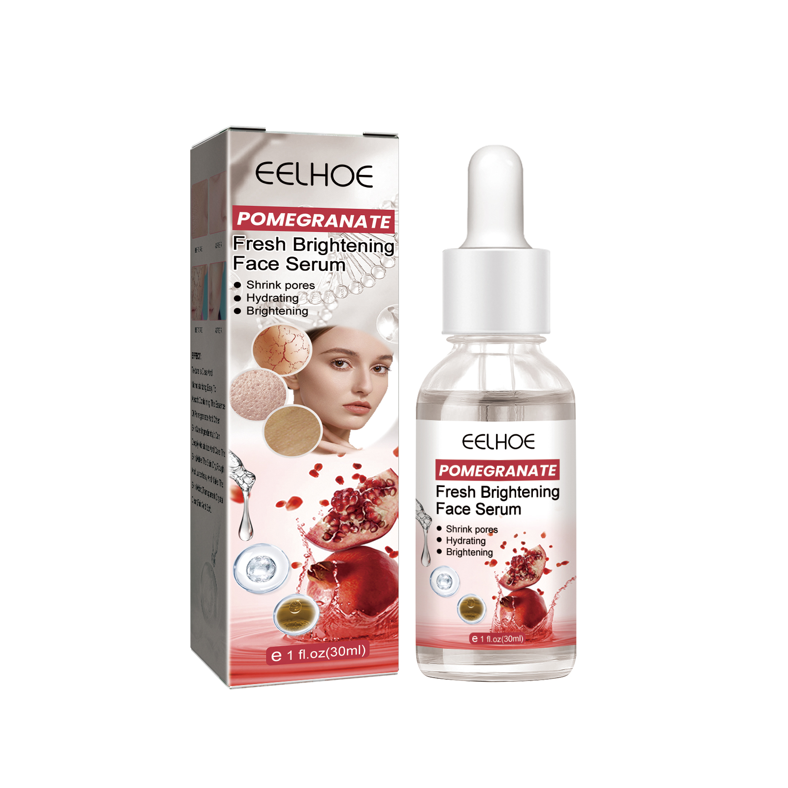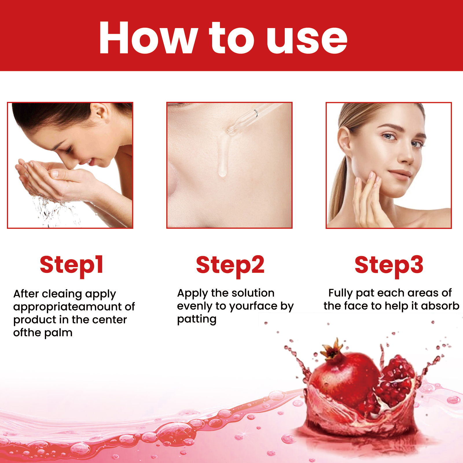 Our pomegranate Beauty serum contains pomegranate extract and hyaluronic acid. It helps to hydrate and close pores. Its use method is very simple: after cleaning, take an appropriate amount of product in the palm, and evenly pat the solution on all parts of the face to help it absorb the face. After use, it will shrink pores, gently moisturize and hydrate, and lighten skin tone.