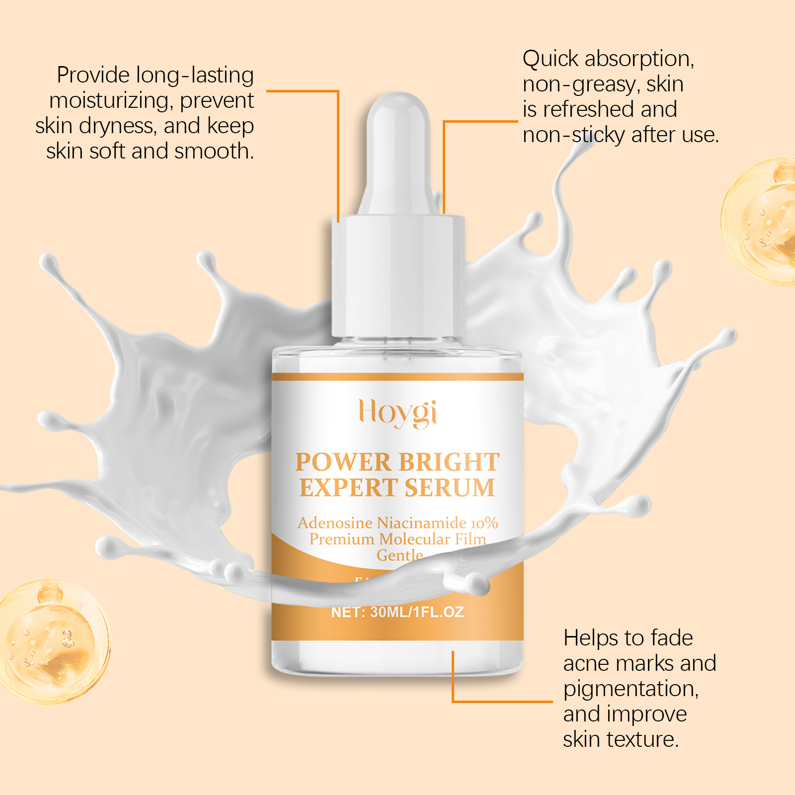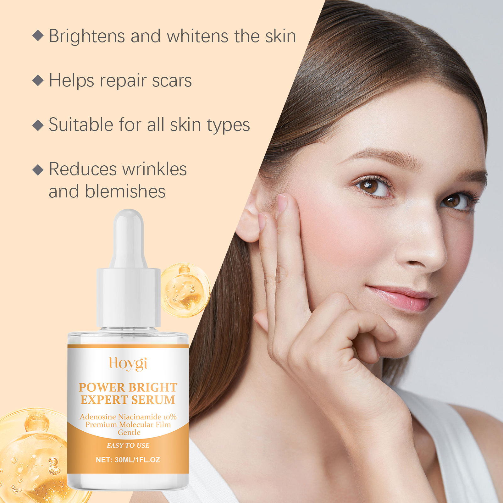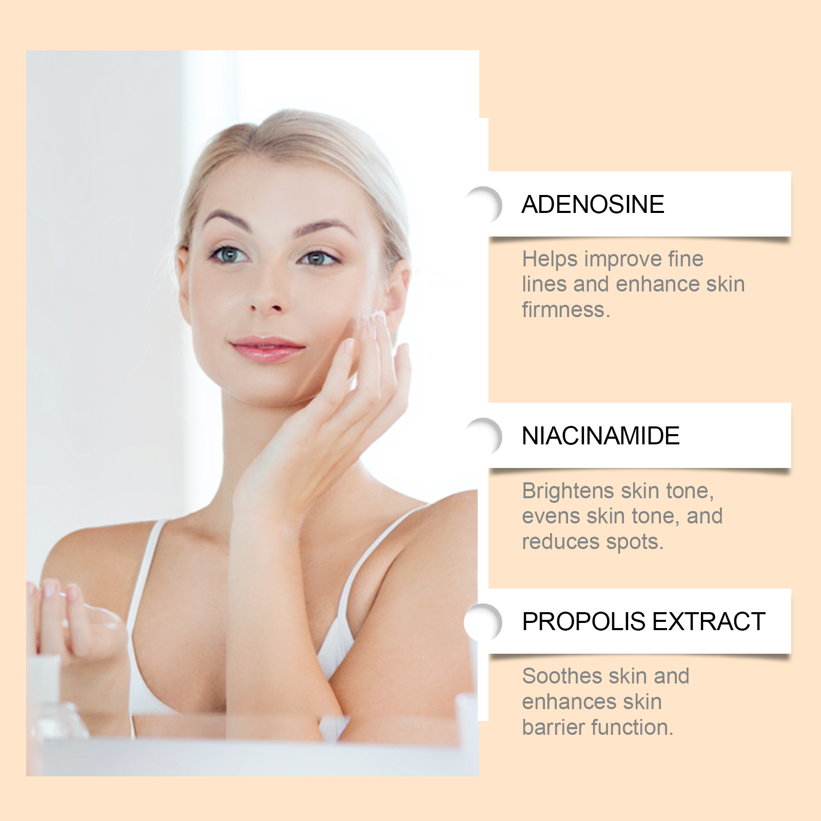 Our propolis facial serum contains adenosine and niacinamide. It is rich in nutrients, deeply nourishes the skin, repairs damage, and improves skin elasticity. Lock skin moisture, deeply moisturize, maintain skin water and oil balance, moisturize all day. Its application method is very simple: take appropriate amount of this product evenly apply to the face skin. Gently massage until fully absorbed. Completely clean and dry facial skin. And can effectively lighten the dark skin, even the skin color, make the skin glow. Mild formula helps repair damaged skin.