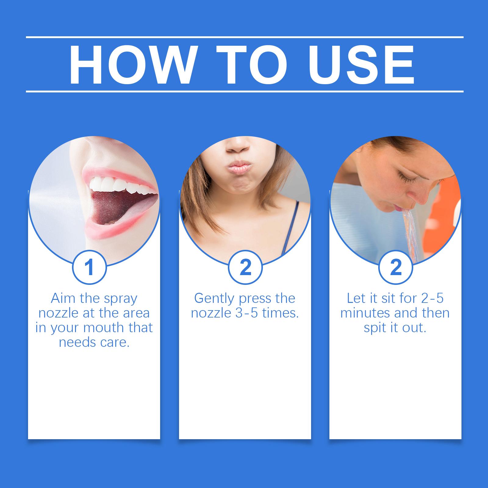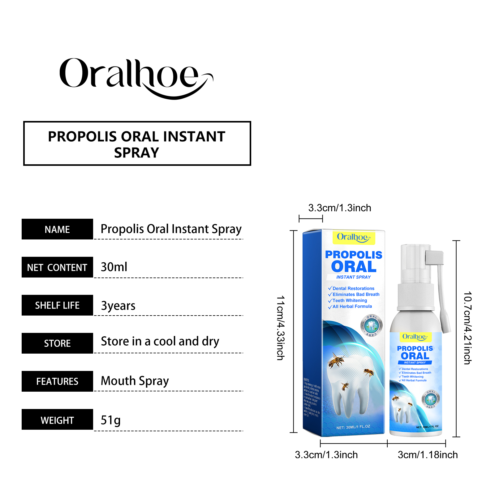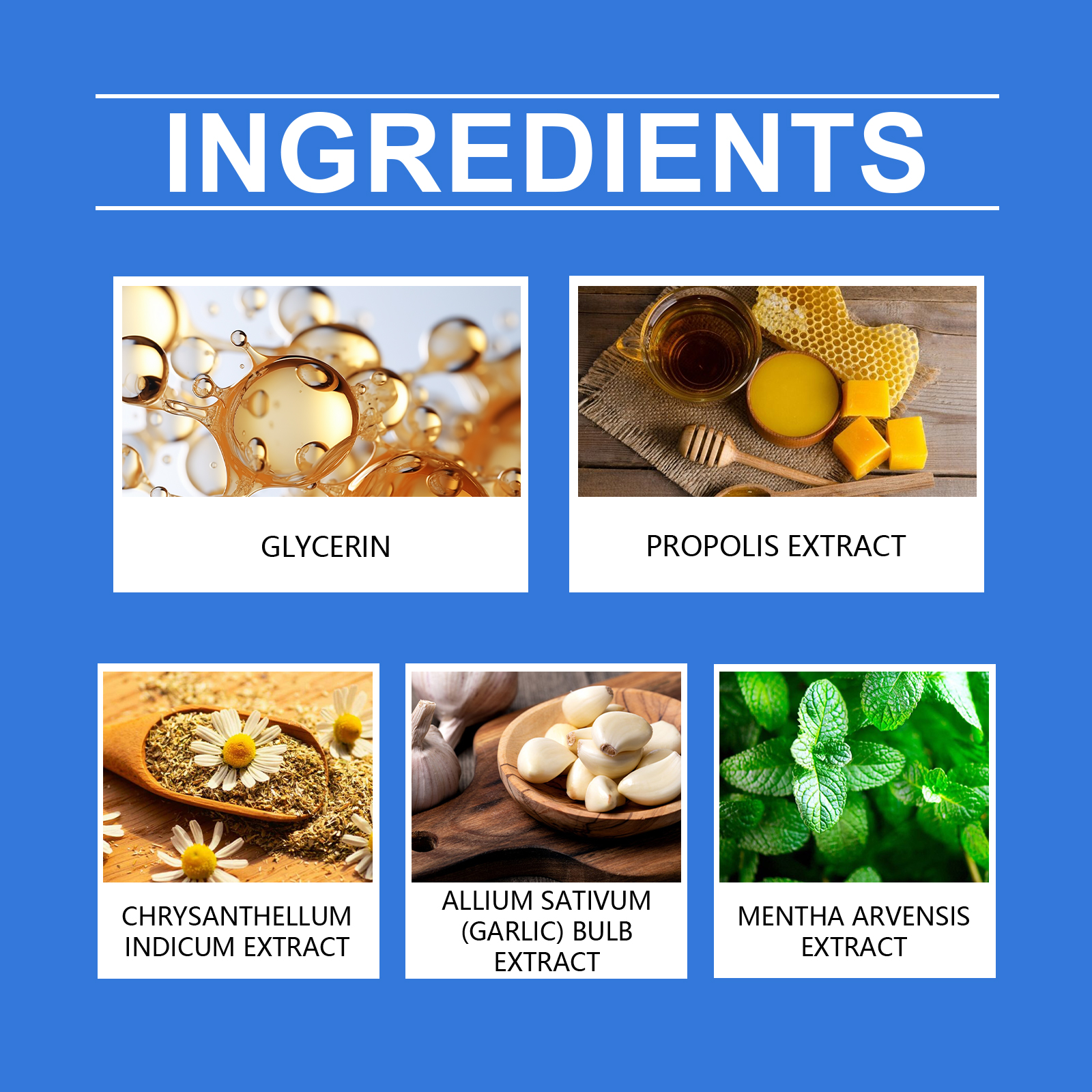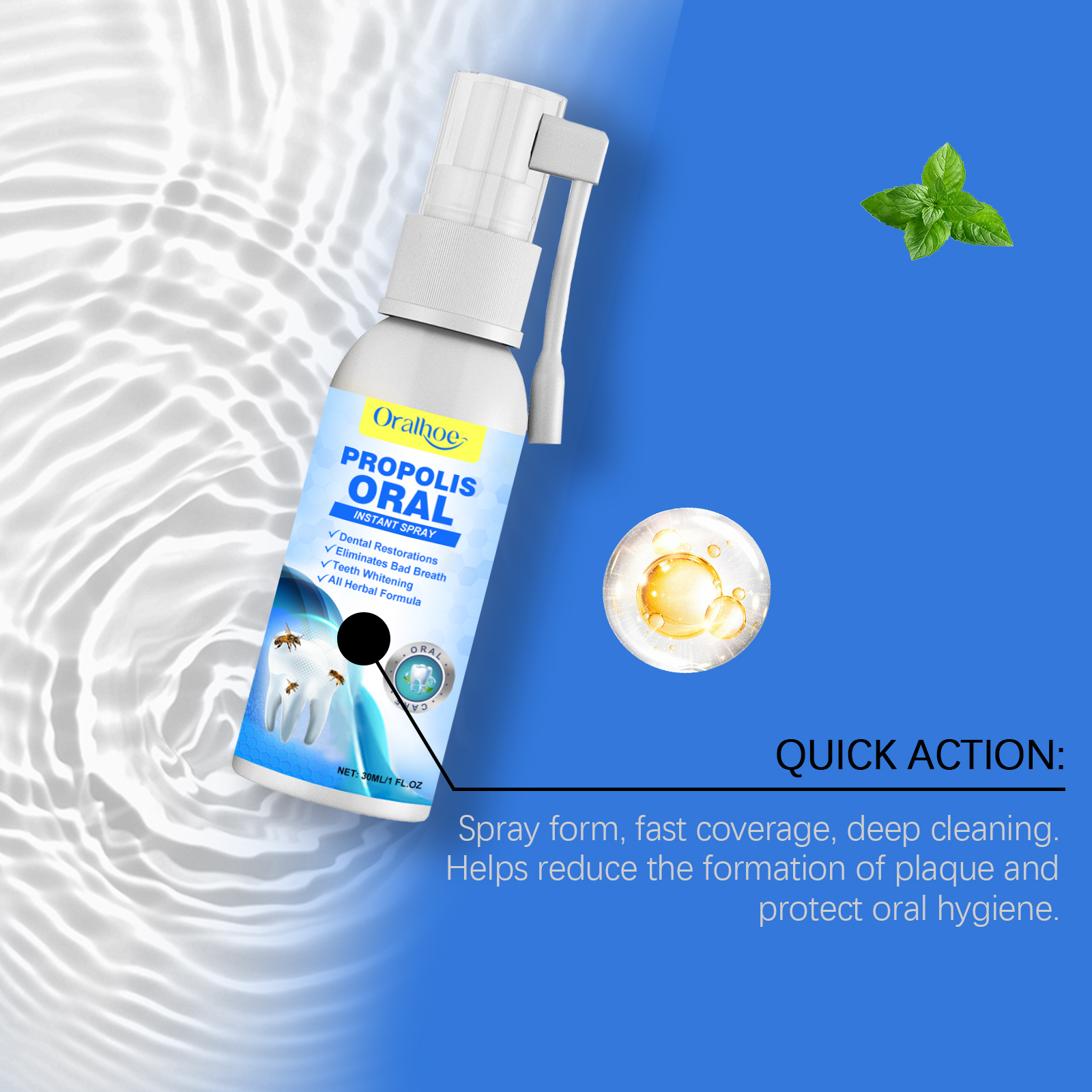 Our Propolis Oral Instant Spray contains Glycerin, Propolis Extract, Chrysanthellum Indicum Extract. It can promote gum health, reduce gum bleeding and other problems, improve the overall oral health level, can effectively remove stains on the surface of the teeth, make the teeth more bright and white, so that you have a more confident smile. Its use is simple: Point the nozzle of the spray at the area of the mouth that needs care, gently press the nozzle 3-5 times, let it sit for 2-5 minutes and spit it out. It can effectively reduce bad breath and give your mouth a long-lasting fresh smell.