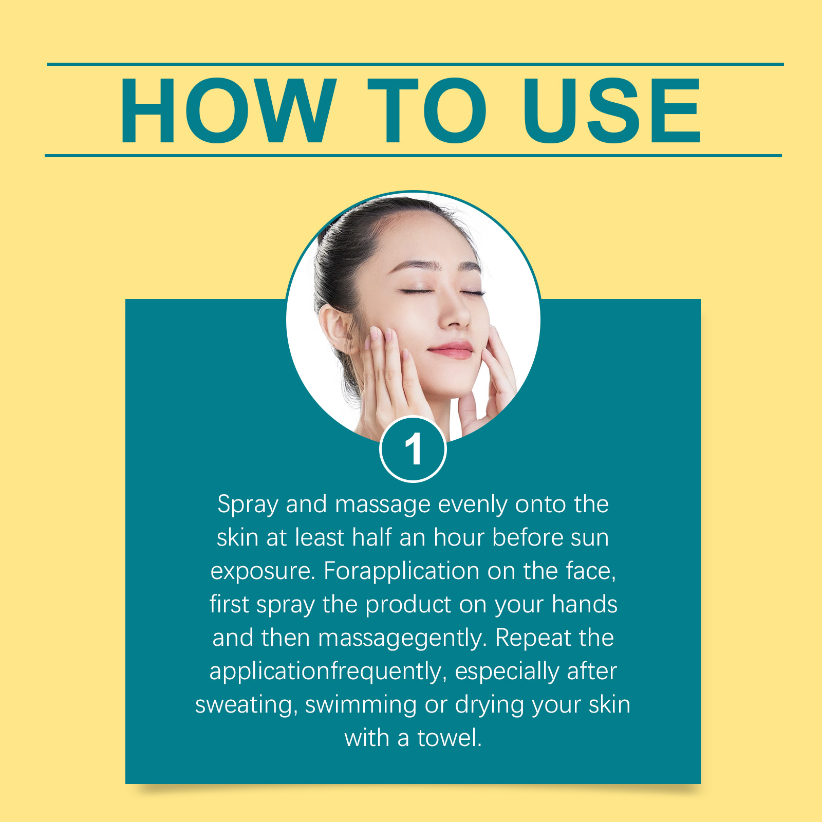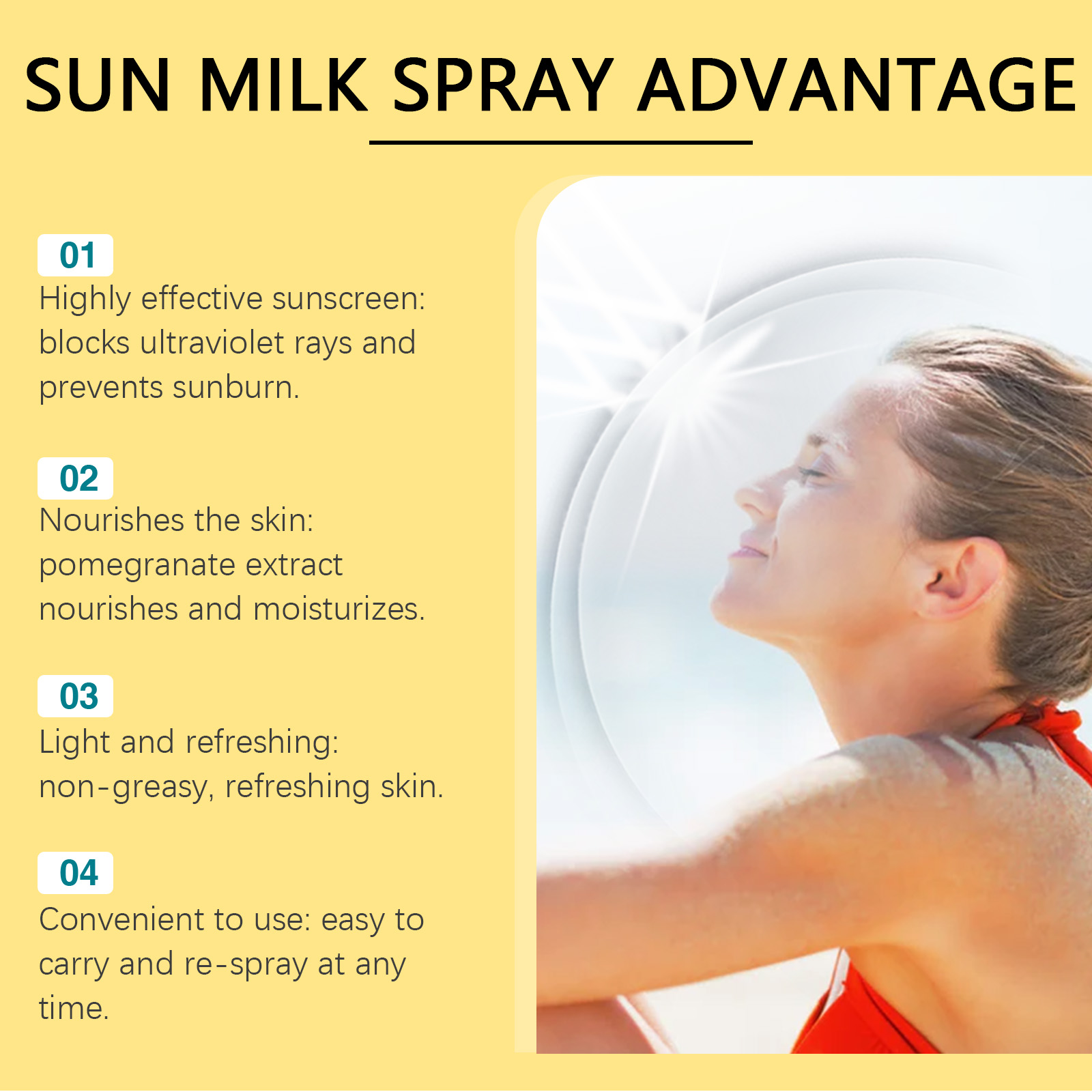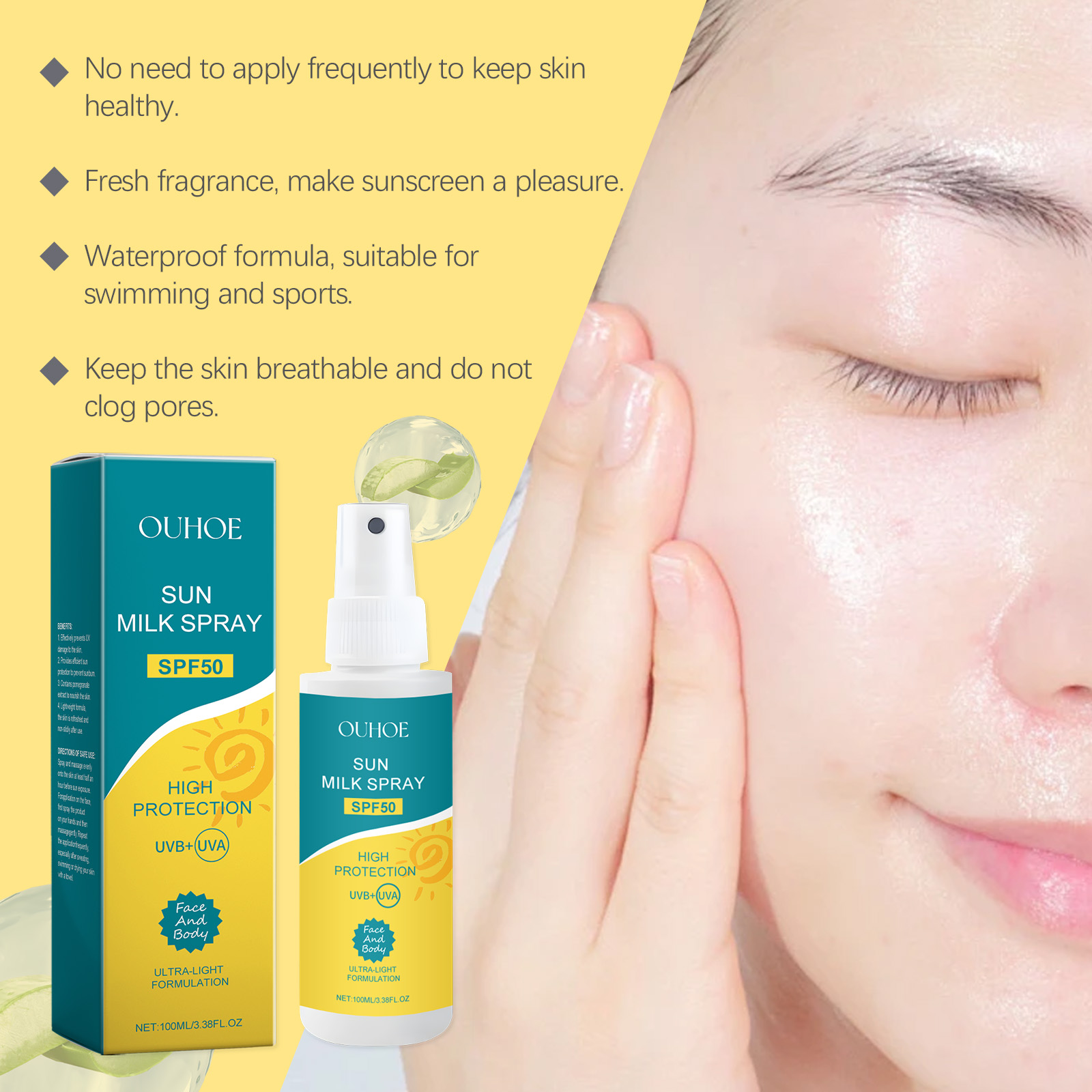 Our protective spray contains glycerin and aloe vera extract. It can be absorbed quickly, leaving no greasy feeling. Lightweight formula, after use, skin is fresh and non-sticky. Its application is simple: spray evenly on the skin and massage at least half an hour before sun exposure. When applying to many parts of the face, spray the product on the hand first, I massage. Reapply frequently, especially after sweating, swimming, or drying your skin with a towel. It also nourishes and retains moisture in the skin.