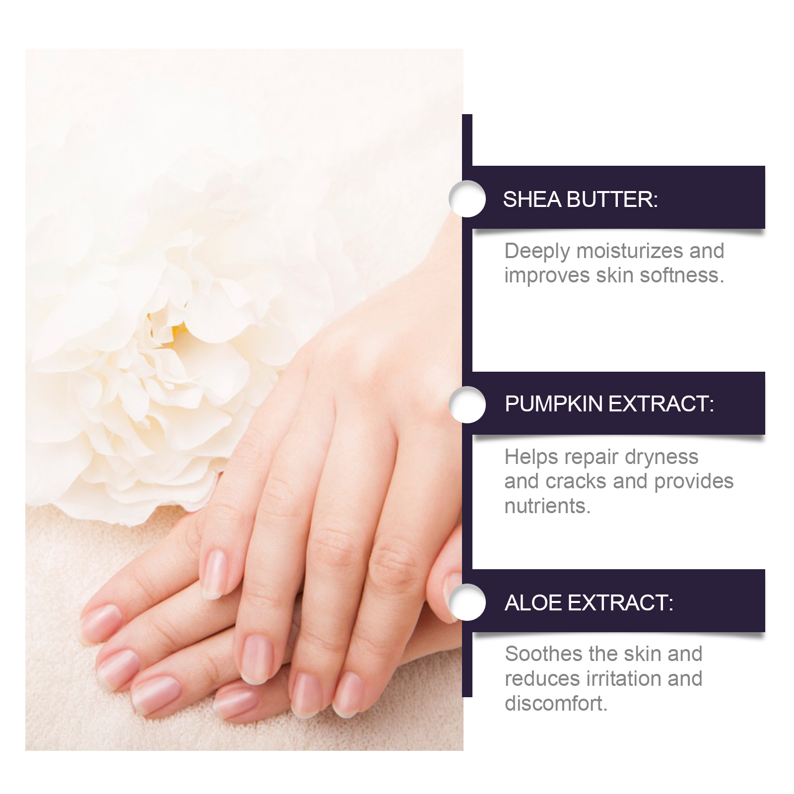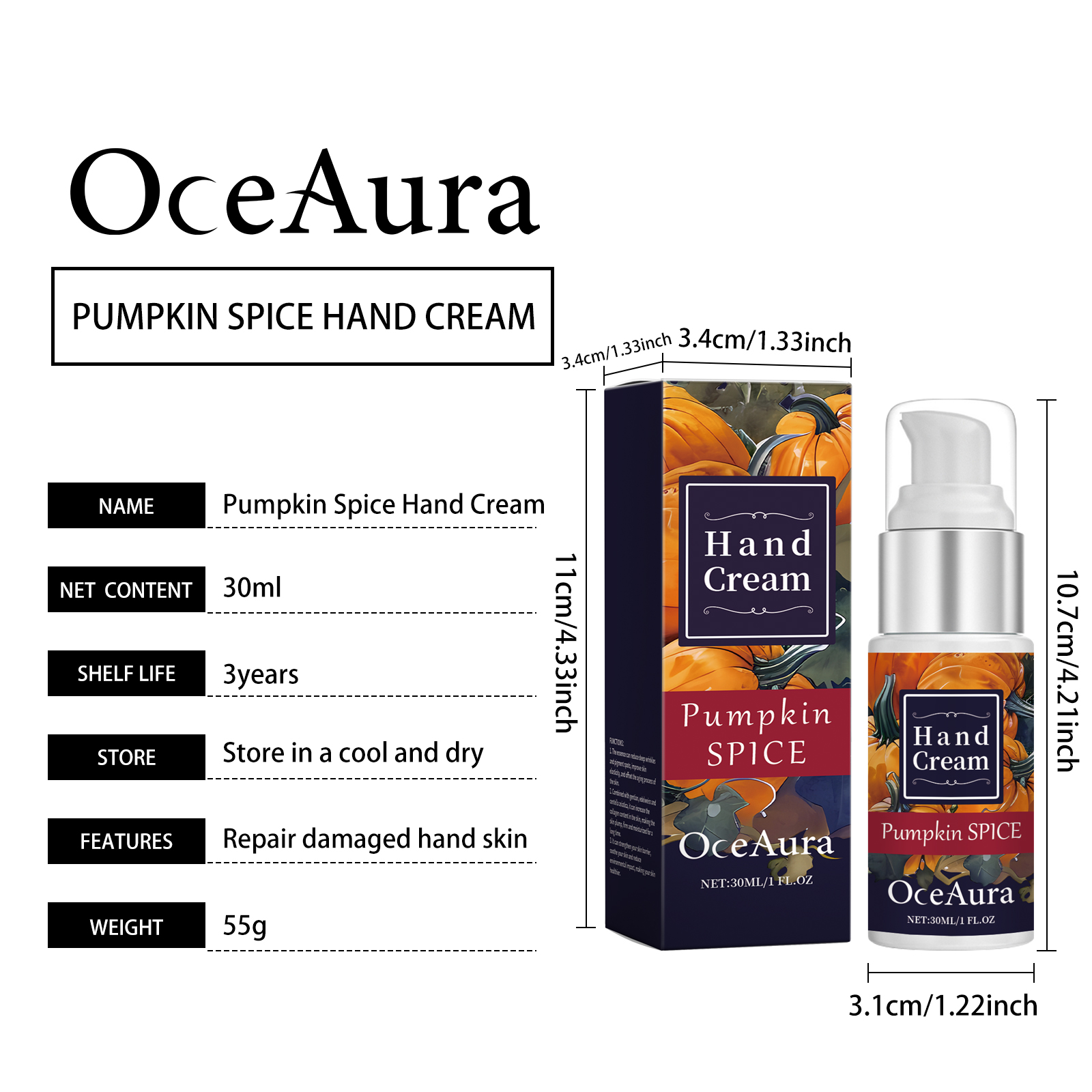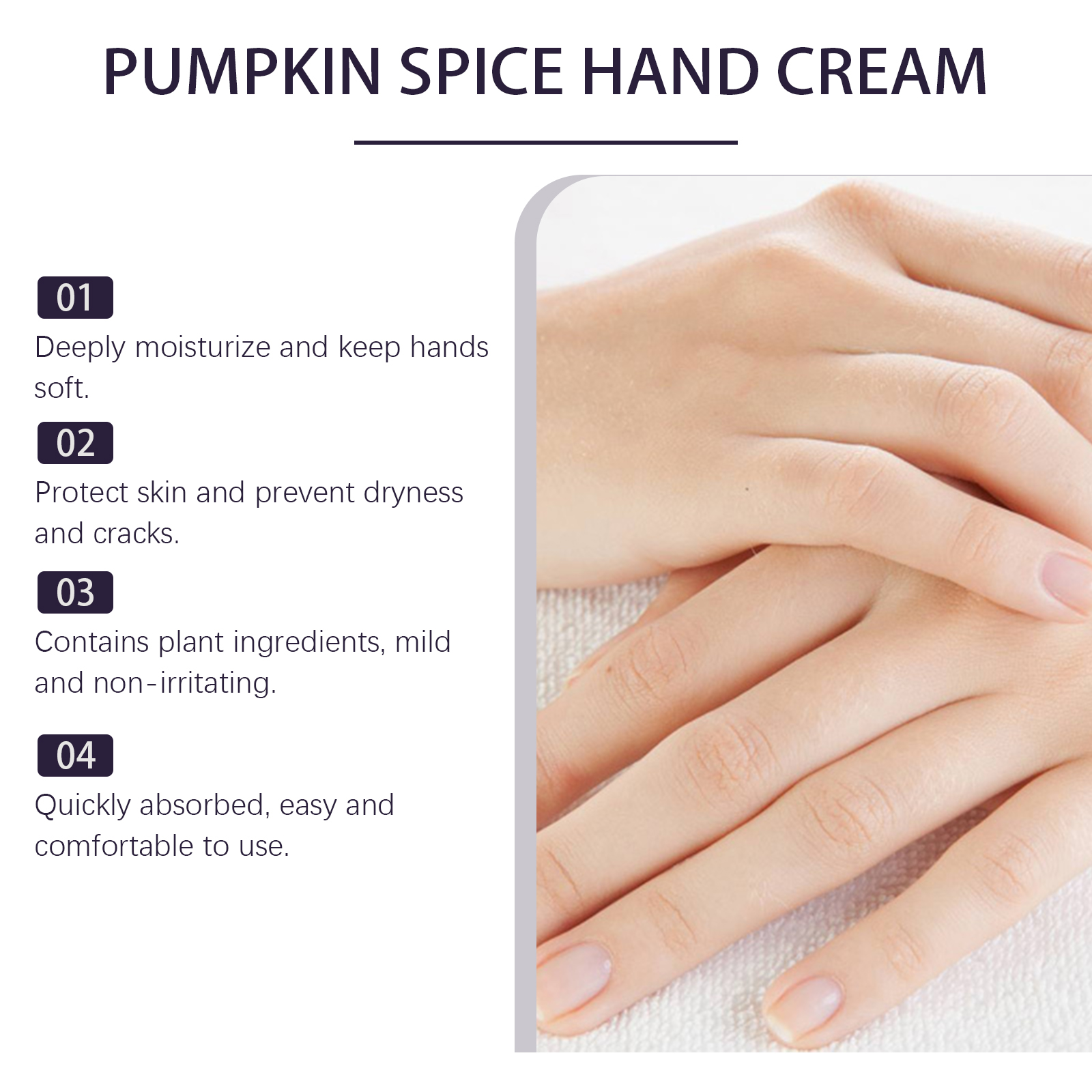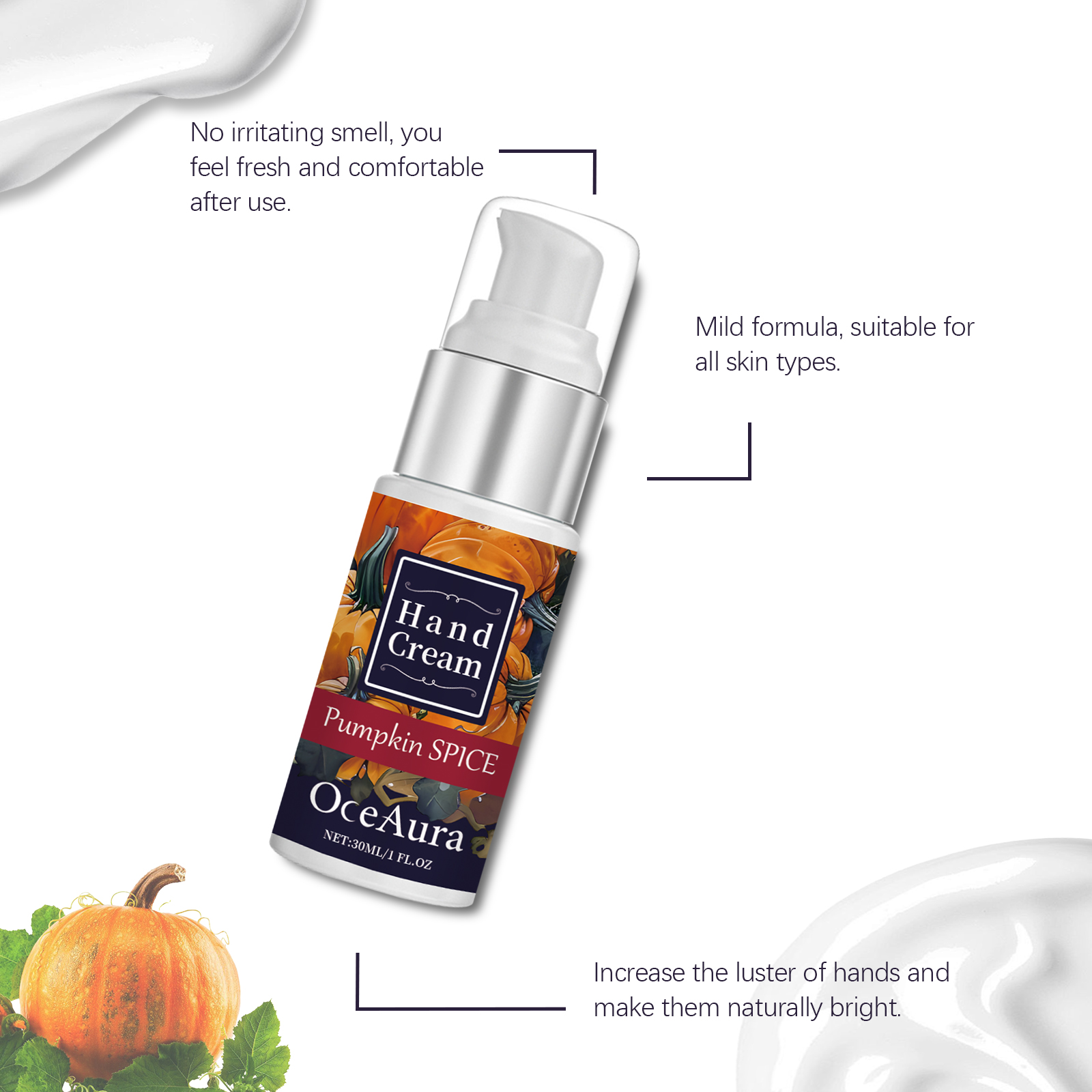 Our pumpkin moisturizing hand cream contains Jojoba seed oil, shea butter and pumpkin extract. It can deeply moisturize and improve skin softness; Helps repair dryness and cracks and provides nutrients. Soothe the skin and reduce irritation and discomfort. The way to use it is very simple: 1. Clean the skin of your hands and keep them dry. 2. Apply proper amount of hand cream to all parts of your hand. 3. Massage gently to promote absorption. Shea butter provides long-lasting moisture and leaves hand skin soft and smooth. Pumpkin extract helps repair dryness and cracks and protects skin.