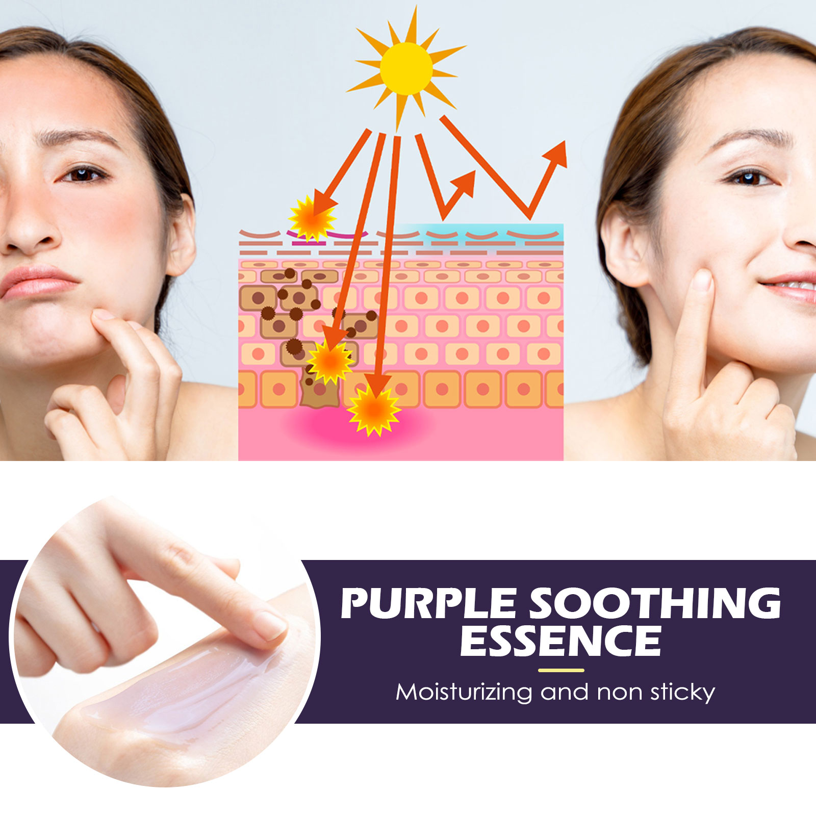 Our Multi-Purple Repair Serum contains Broomleaf tea extract, Fuke Shu, and Cherimoya fruit extract. It can moisturize non-stick, deep protection, penetrate into the skin, repair the human skin stratum corneum. Its use method is very simple: after cleansing and toning, apply an appropriate amount of green essence evenly on the red skin of the face, and massage gently from inside to outside with your fingertips until absorbed. Multi-purple Repair Serum reduces red spots, restores skin, and leaves skin smooth and hydrated.