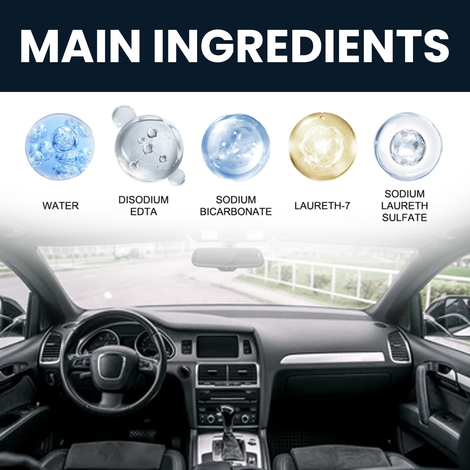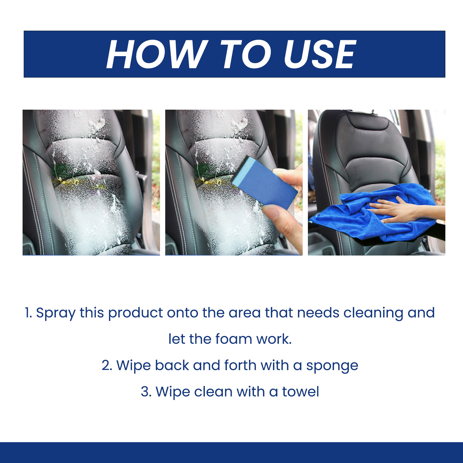 Our Foam Cleaner contains disodium EDTA, sodium bicarbonate, lauryl ether 7. It can completely remove dirt, dust, oil stains and other pollutants in the car, and keep the car clean and sanitary. Its use is simple: spray the product on the area that needs cleaning, let the foam do its work, wipe it back and forth with a sponge, and finally wipe it off with a towel. Can quickly and effectively clean the interior surface of the car, greatly saving your time and effort.