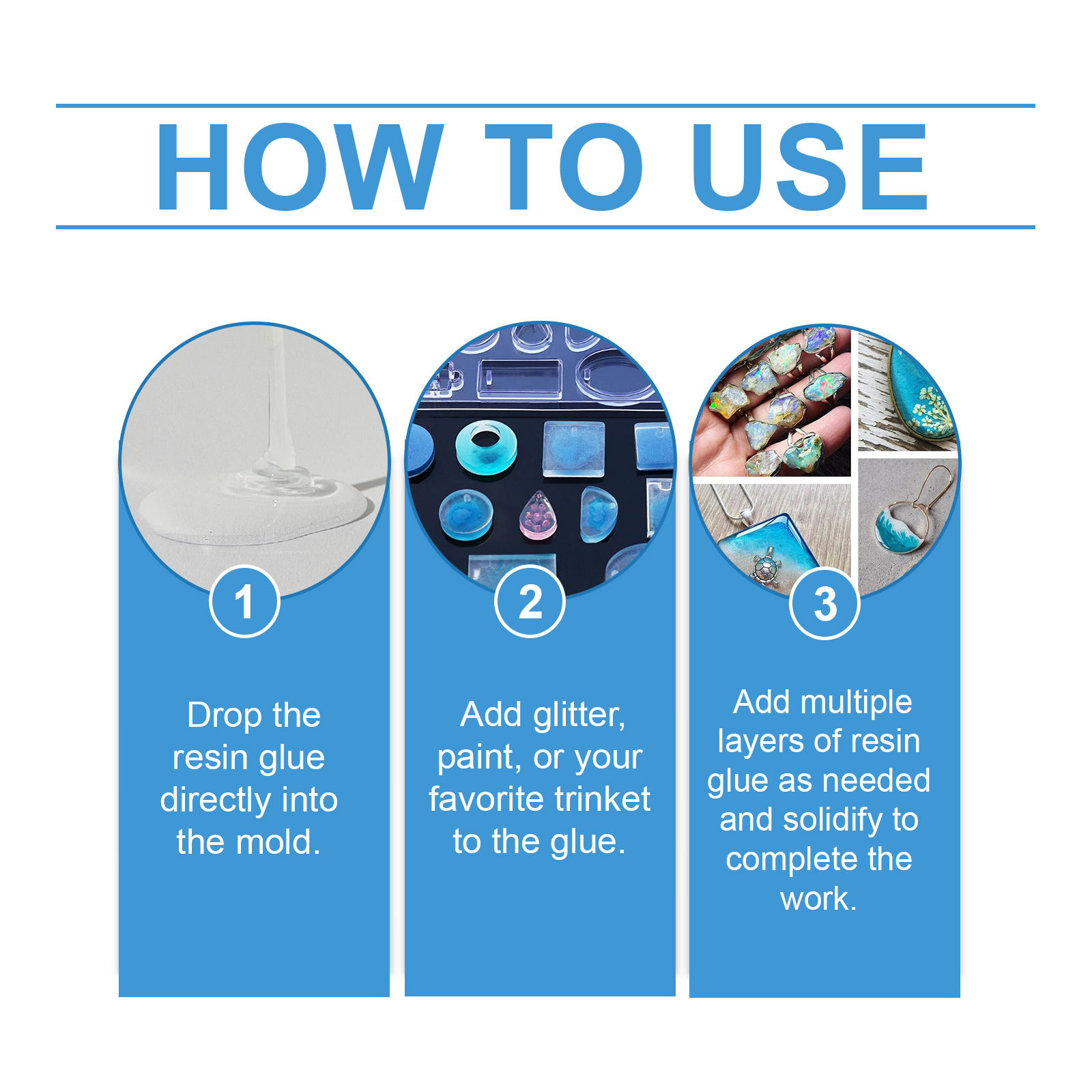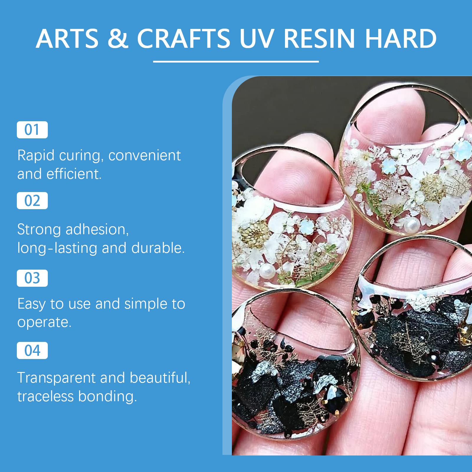 Our resin mold curing plastic glue contains acrylic resin, acetone, epoxy resin. It can cure quickly, easily and efficiently. Strong adhesion, durable. Transparent and beautiful, seamless bonding. Its use method is very simple: 1. Drop the resin glue directly into the mold. 2. Add glitter, paint, or your favorite trinket to the glue. 3. Add multiple layers of resin glue and cure as needed to complete the job. Fast curing by UV radiation. Suitable for a variety of materials, durable.