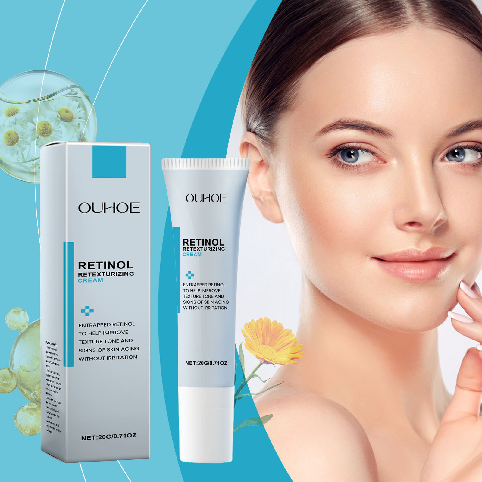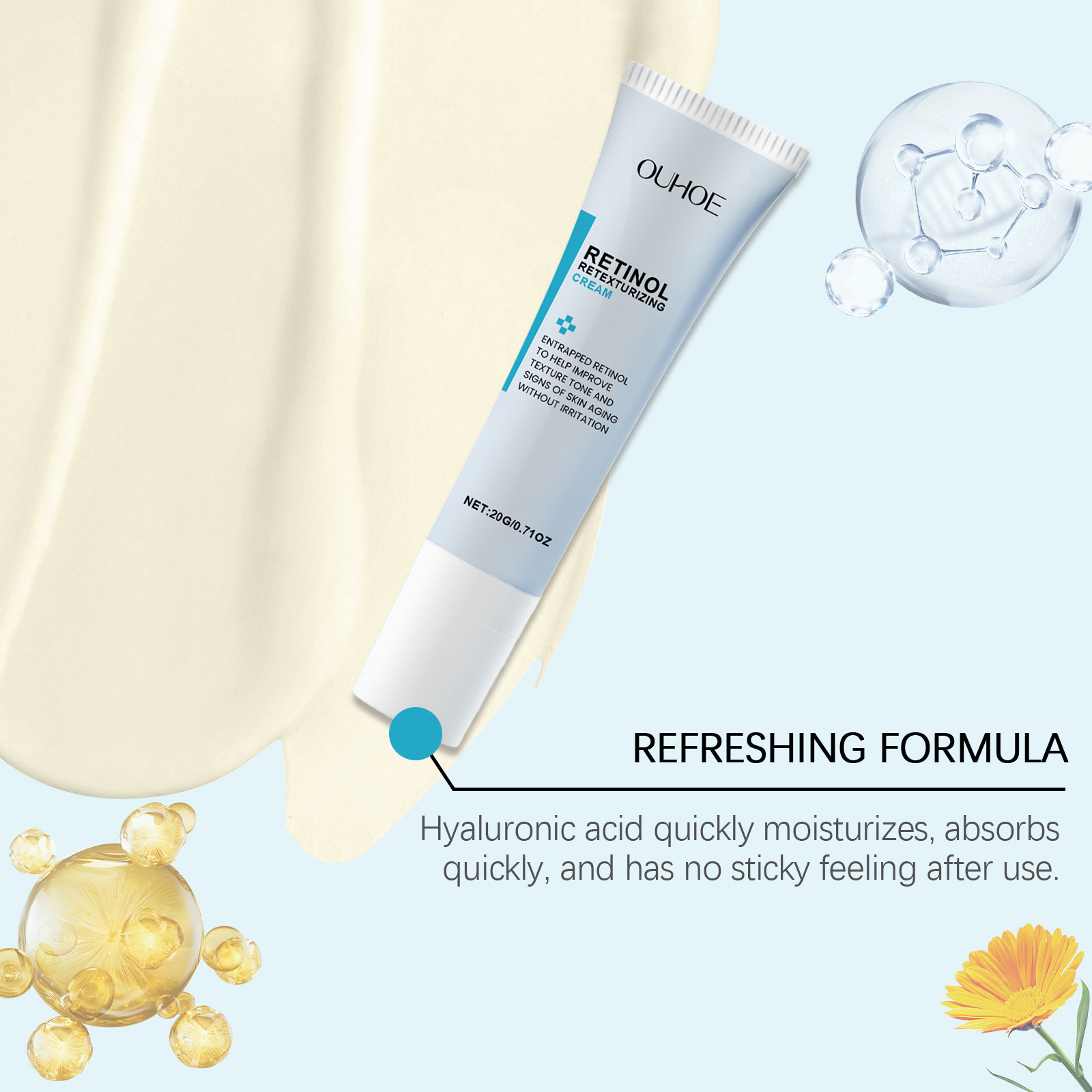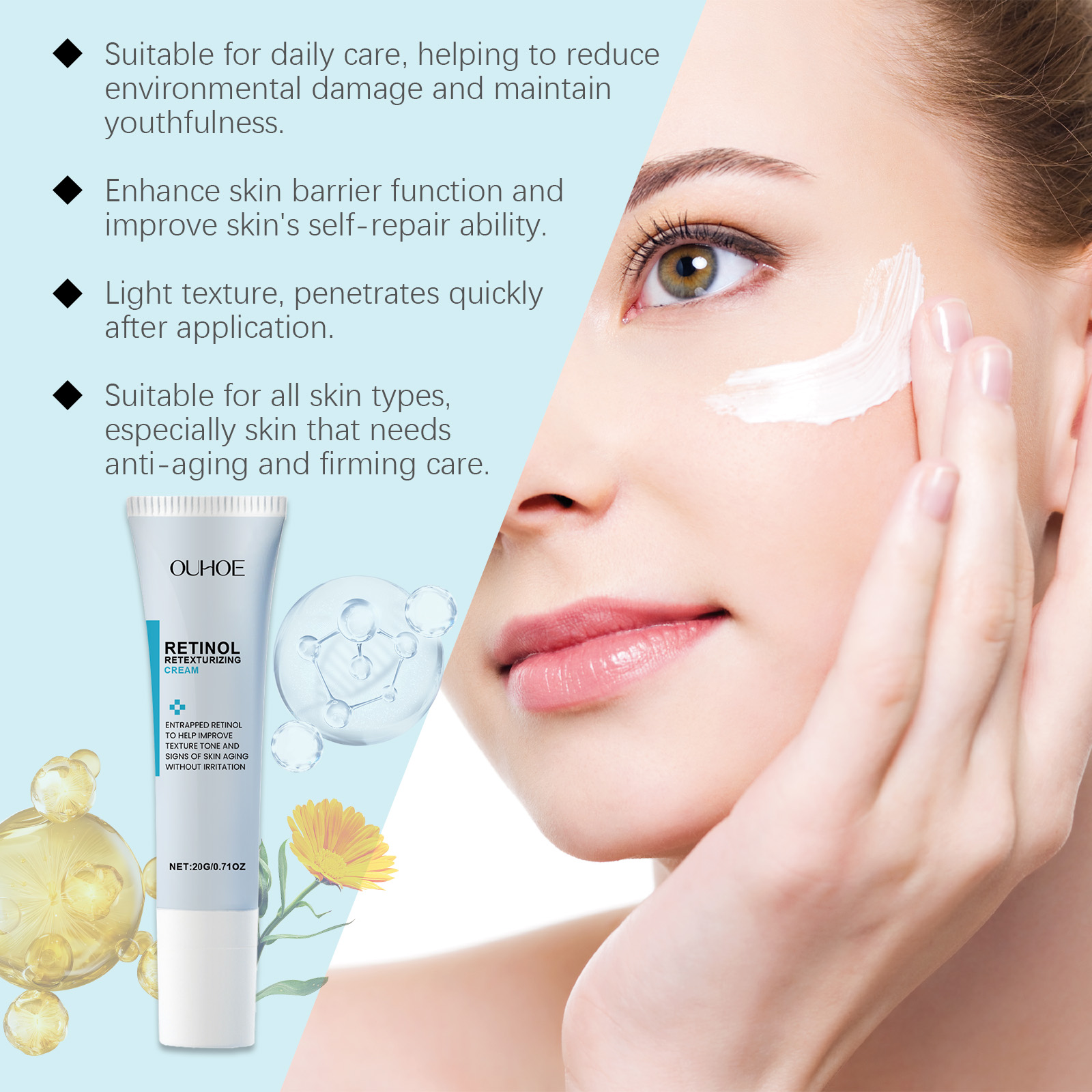 Our retinol cream contains retinol, calendula extract. It can effectively reduce fine lines and wrinkles and improve skin elasticity. Its application method is very simple: clean the facial skin, keep the skin dry, take an appropriate amount of cream, evenly apply on the skin, gently massage until completely absorbed. It can also soothe sensitive skin and reduce irritation.