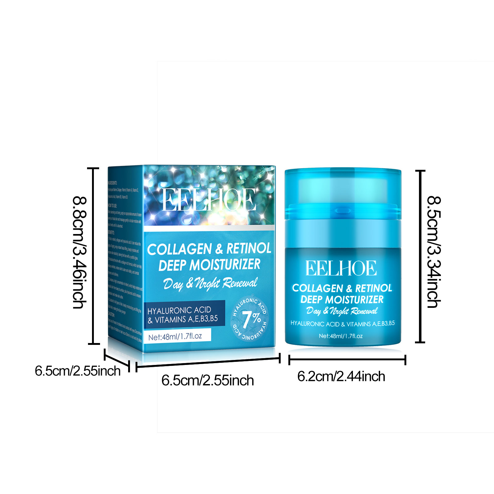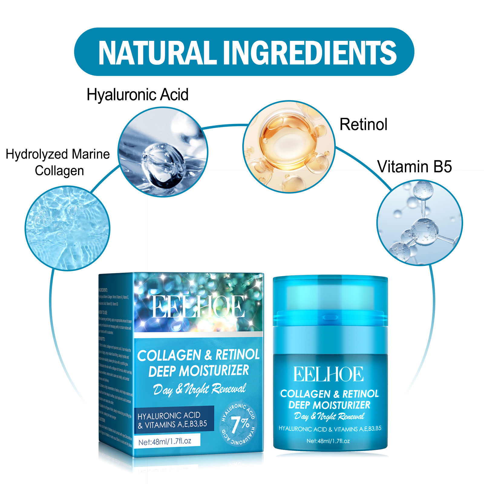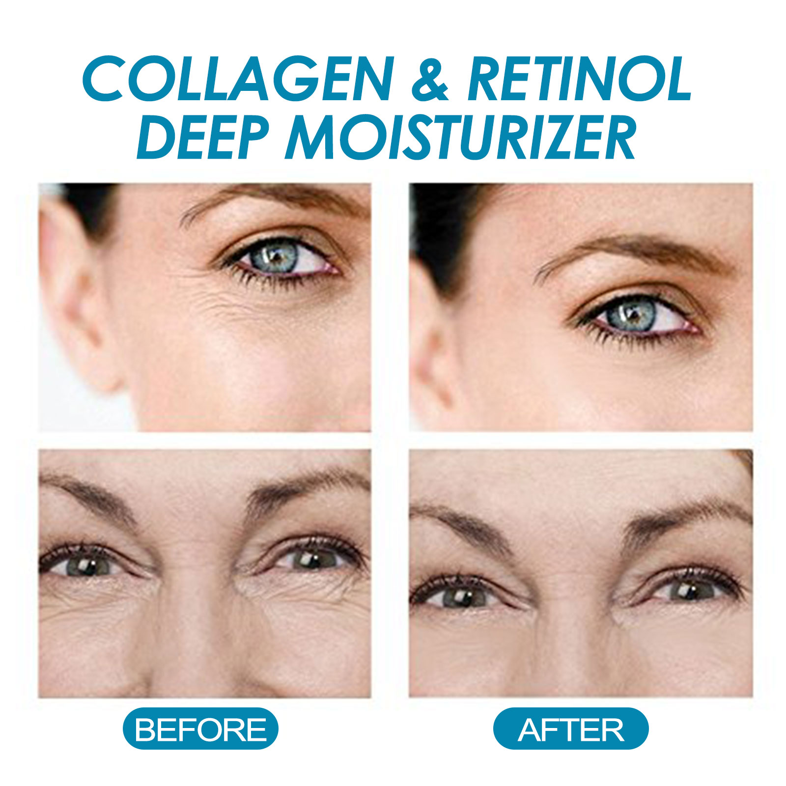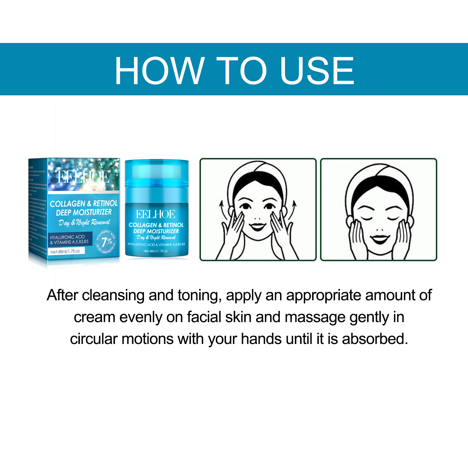 Our retinol deep moisturizer contains hydrolyzed Marine collagen, retinol (vitamin A), and vitamin E. It reduces wrinkles and fine lines, collagen enhances skin elasticity and firmness, promotes nutrition and protection. Its use method is very simple: after cleansing and toning, take appropriate amount of cream evenly apply to the face skin, gently massage with your hand until absorbed. Moisturizing and deep moisturizing.