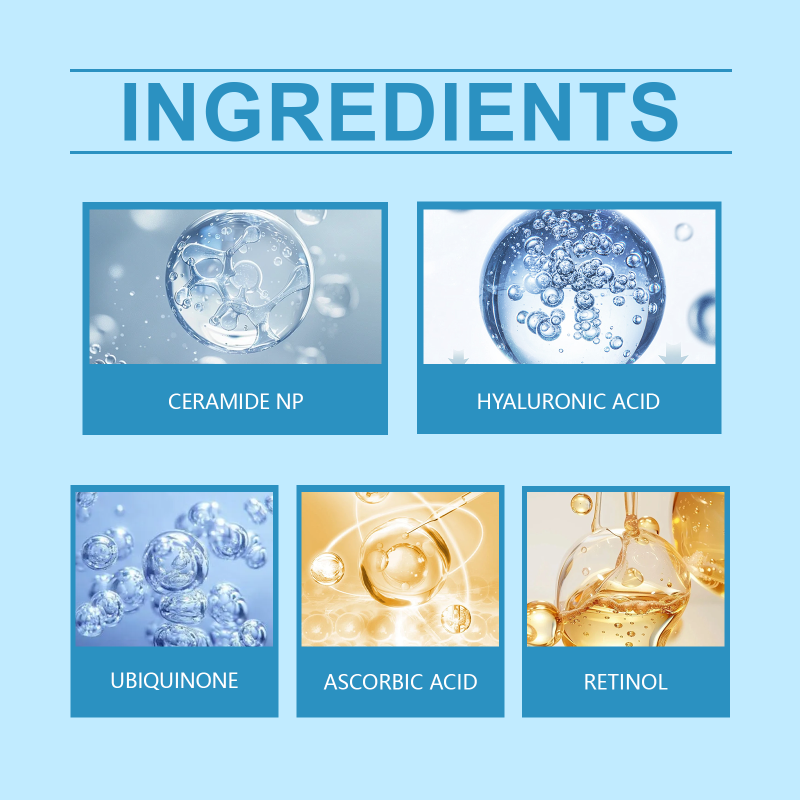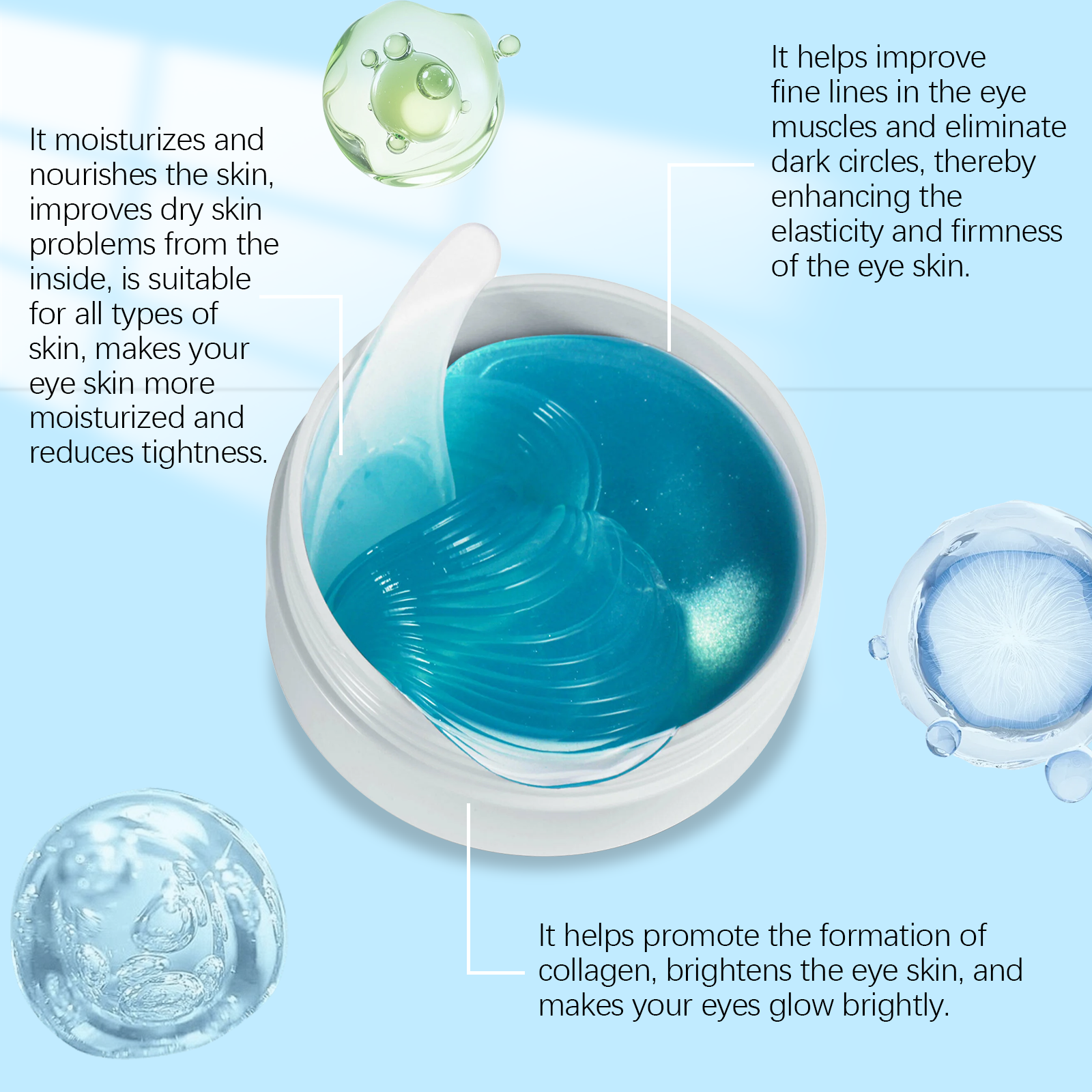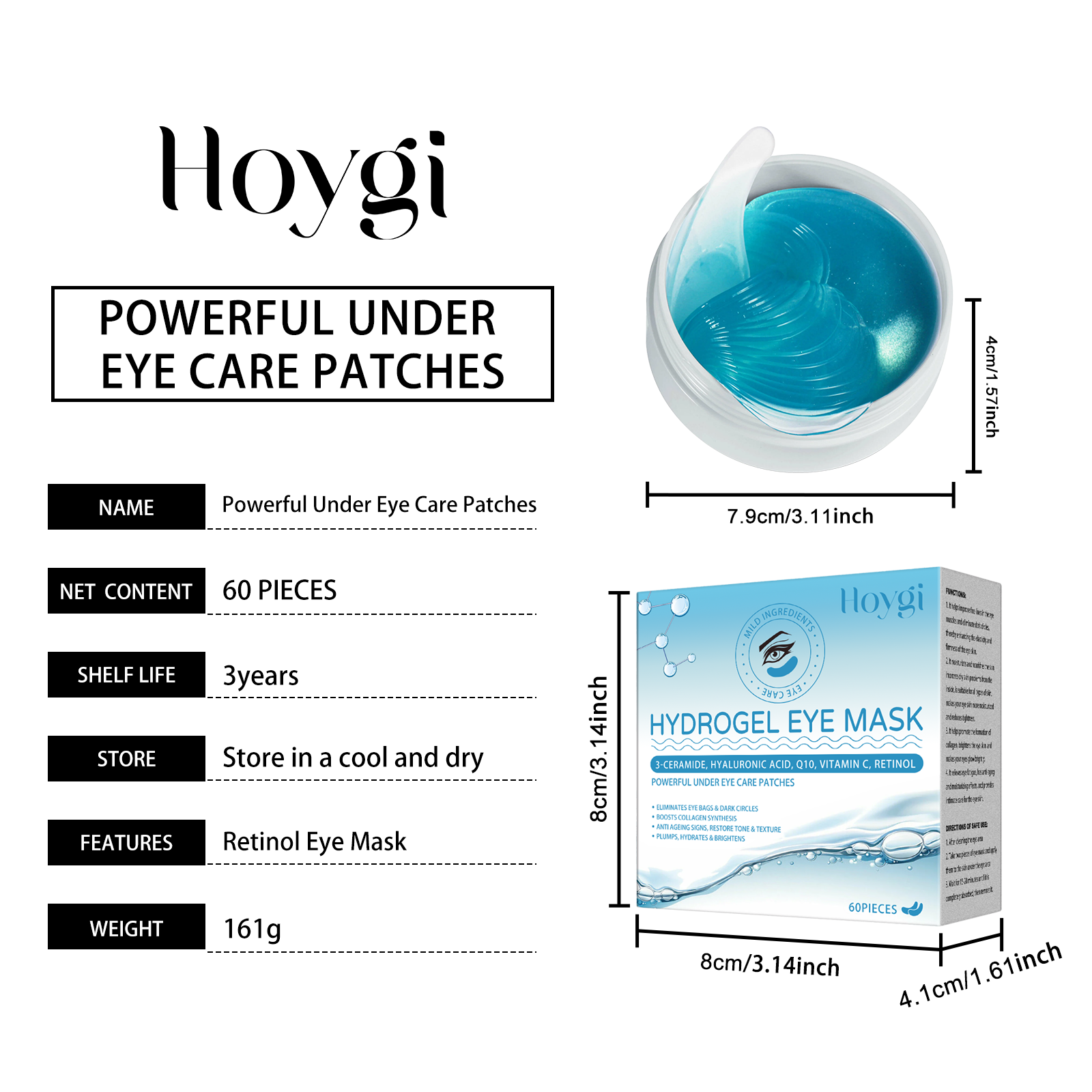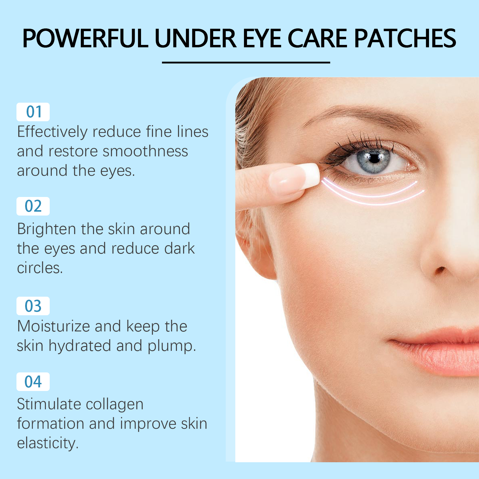 Our retinol eye patch contains ceramide NP, hyaluronic acid and ubiquinone. It can effectively fade the fine lines around the eyes and restore youth. Relieve eye puffiness and make eyes brighter. Its use method is very simple: 1. Clean after the eyes. 2. Take two eye masks and apply them under your eyes. 3. Wait 15-20 minutes until fully absorbed, then remove. Lighten skin tone, reduce dark circles under the eyes and create a healthy glow. Moisturize deeply to keep skin hydrated and plump.