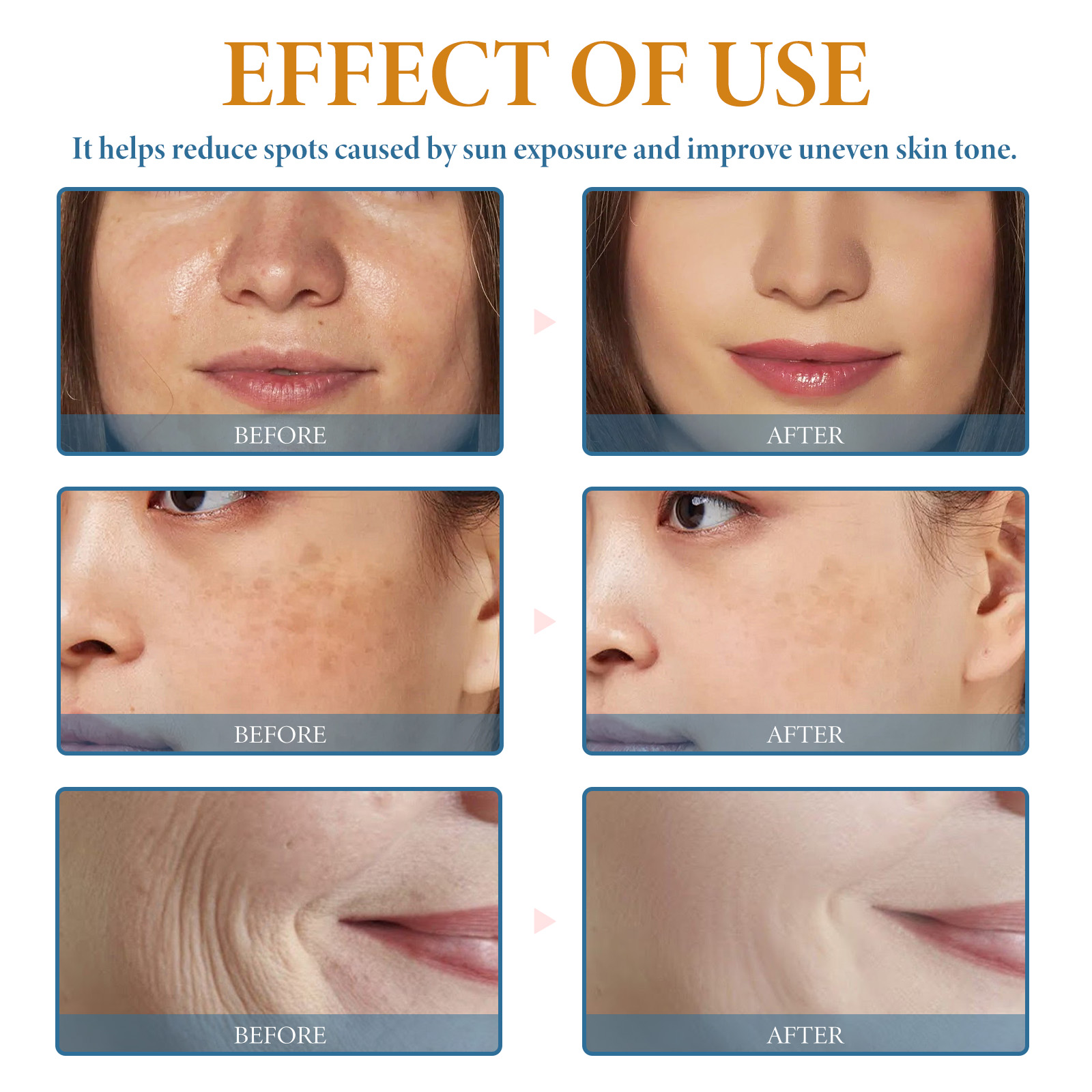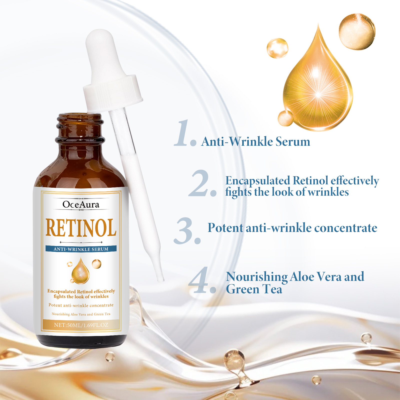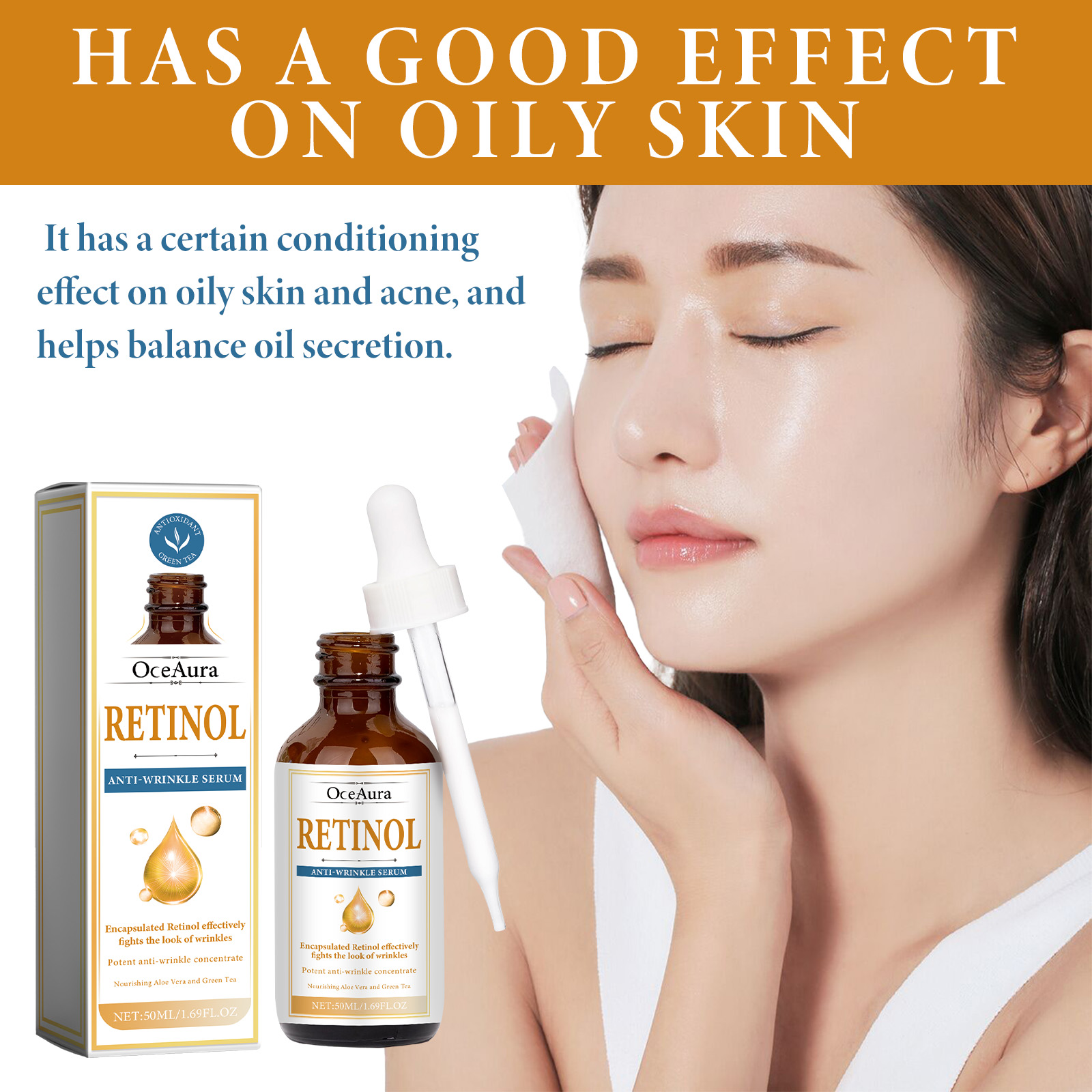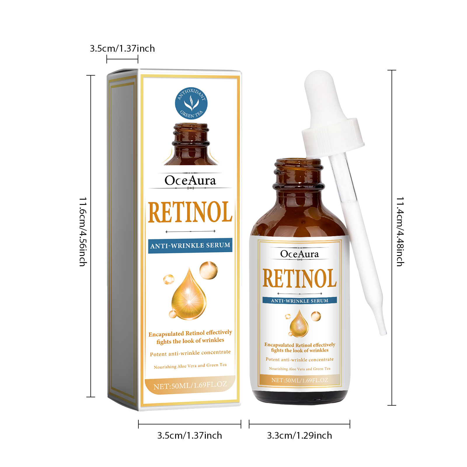 Our Retinol Anti-Wrinkle Serum contains Retinol, Aloe Vera Leaf Extract, Glycerin. It can balance sebum production, control oil, reduce problems caused by oily skin, help improve damaged skin, reduce dark spots, pigmentation and uneven skin tone, help reduce fine lines and wrinkles near the eyes, mouth and forehead, and make the surface of the skin smoother. Its use method is very simple: after cleansing and toning, take appropriate amount of essence evenly apply to the face skin, gently massage with your hand until absorbed. It can deeply moisturize the skin, reduce dryness and roughness, and keep the skin hydrated.