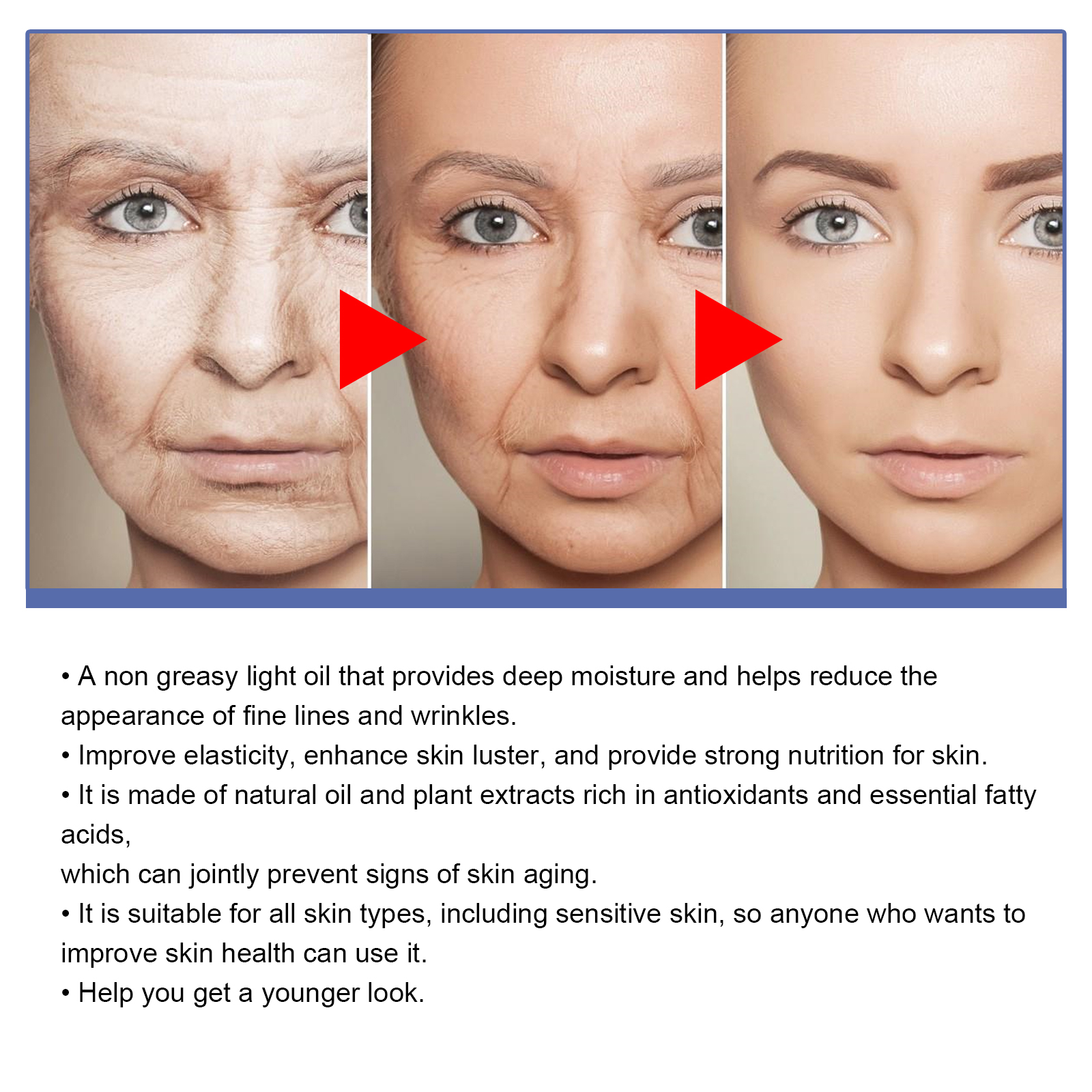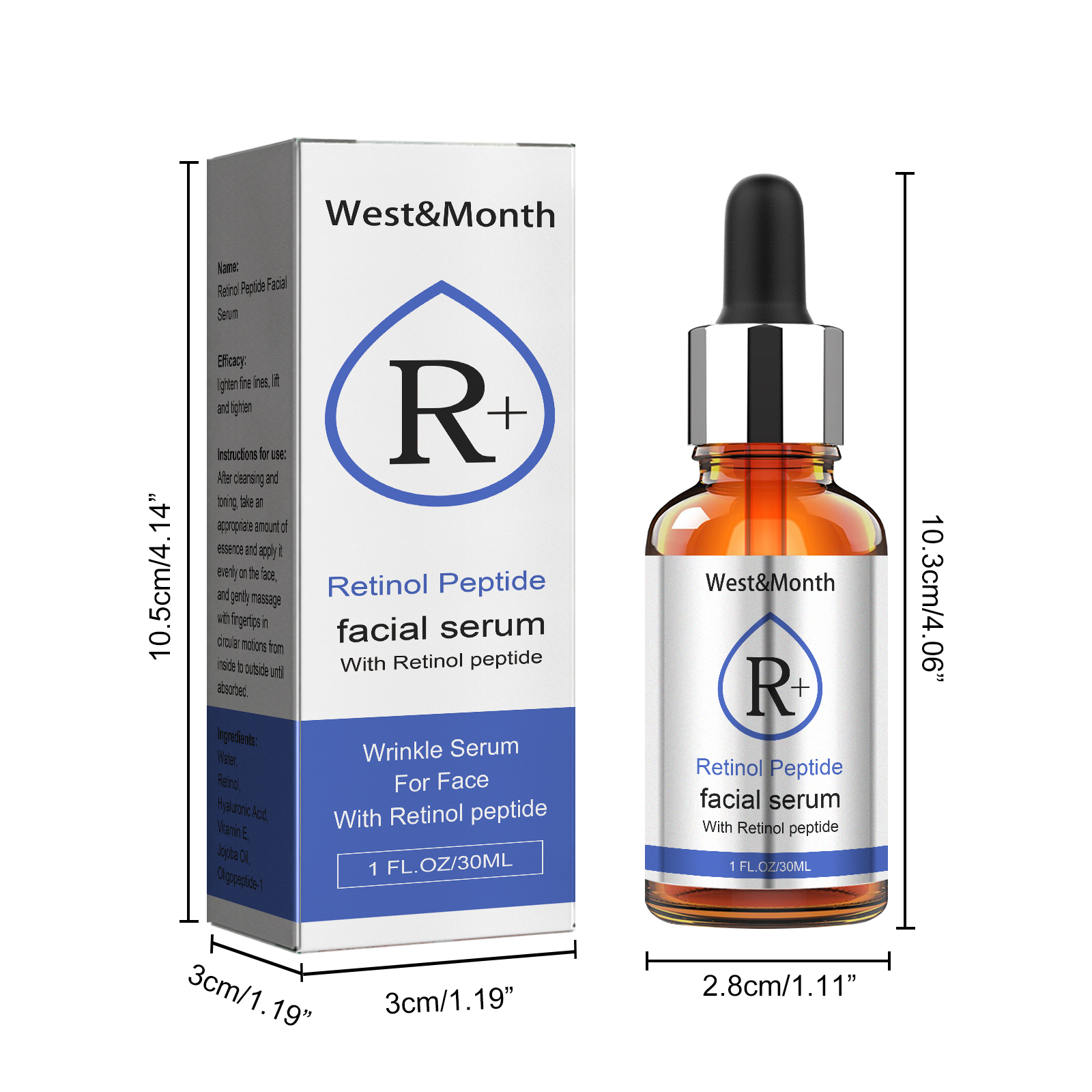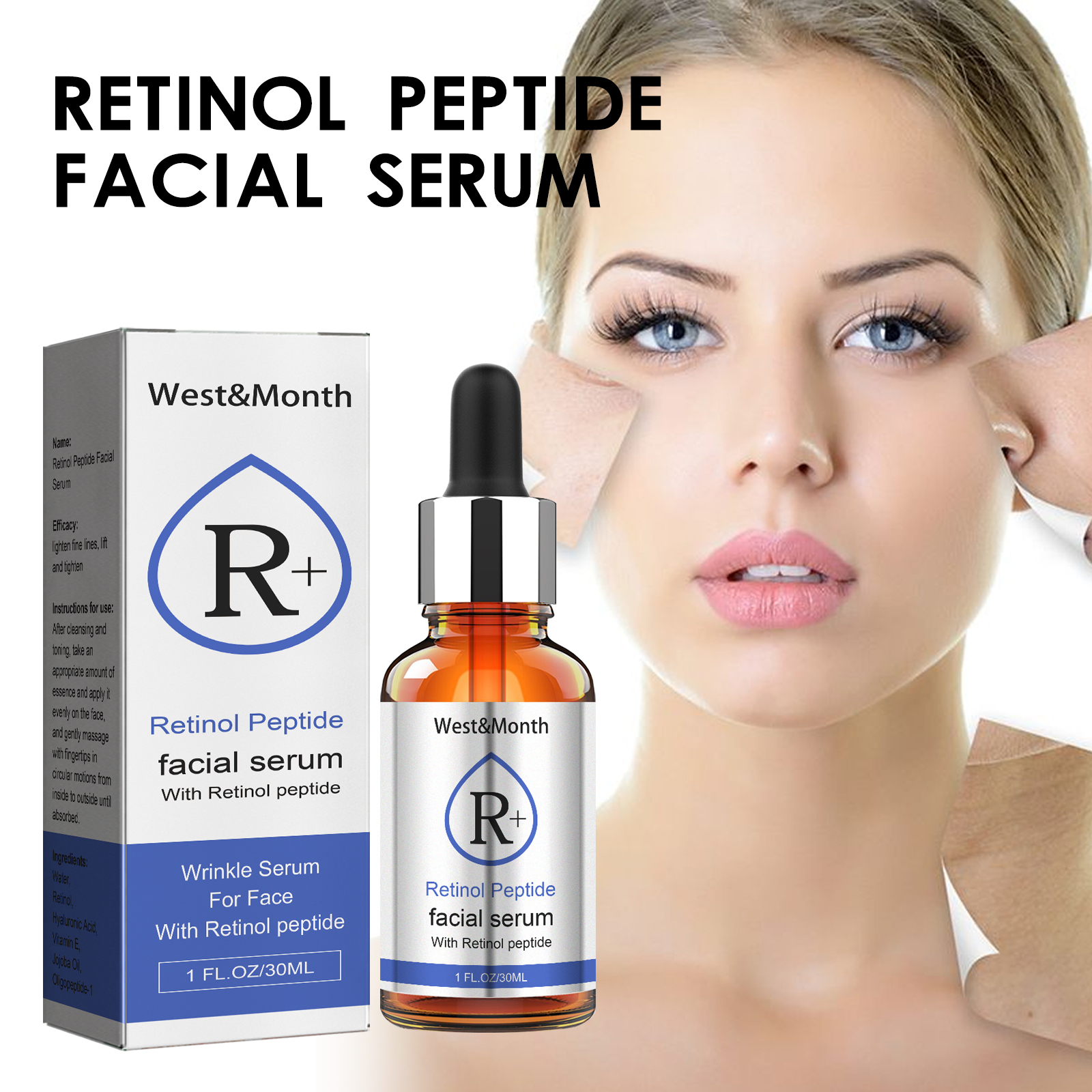 Our retinol face serum contains retinol, hyaluronic acid and vitamin E. It provides deep moisture, helps reduce the appearance of fine lines and wrinkles, improves skin elasticity, enhances skin shine, and provides strong nutrients to the skin. Its use method is very simple: after cleansing and toning, take an appropriate amount of essence evenly apply to the face, and massage gently from inside to outside with your fingertips until absorbed. And can prevent signs of skin aging.