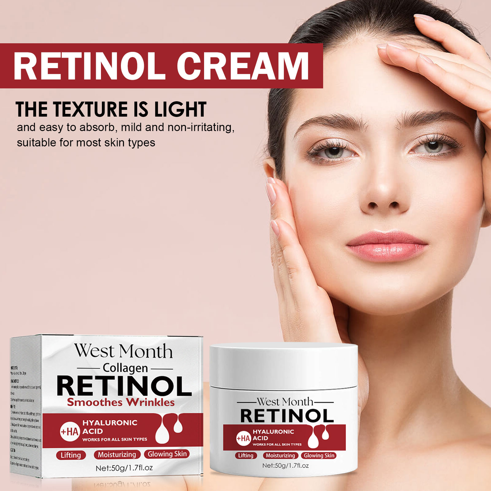 Our retinol firming cream contains retinol, collagen. It can improve acne marks, shrink pores, and reduce skin blemishes. Its use method is very simple: 1. After cleansing, take appropriate amount of this product evenly spread on the face. 2. Gently massage the entire face and neck until absorbed. It can effectively nourish the face and moisturize the skin.