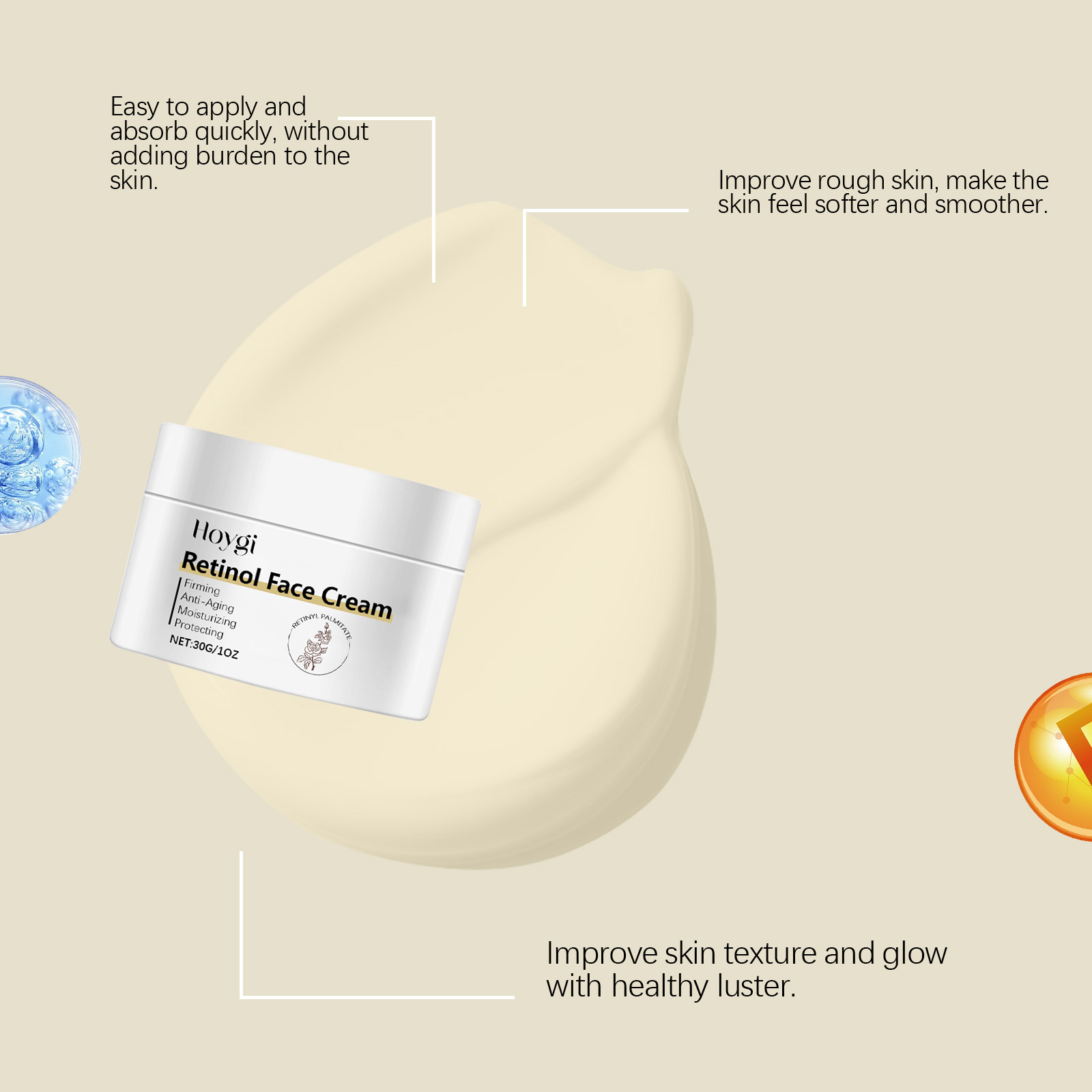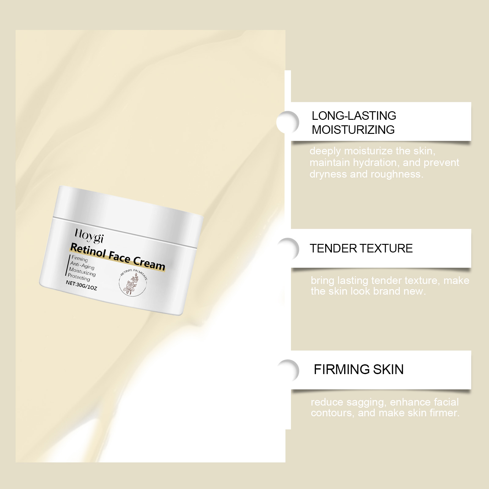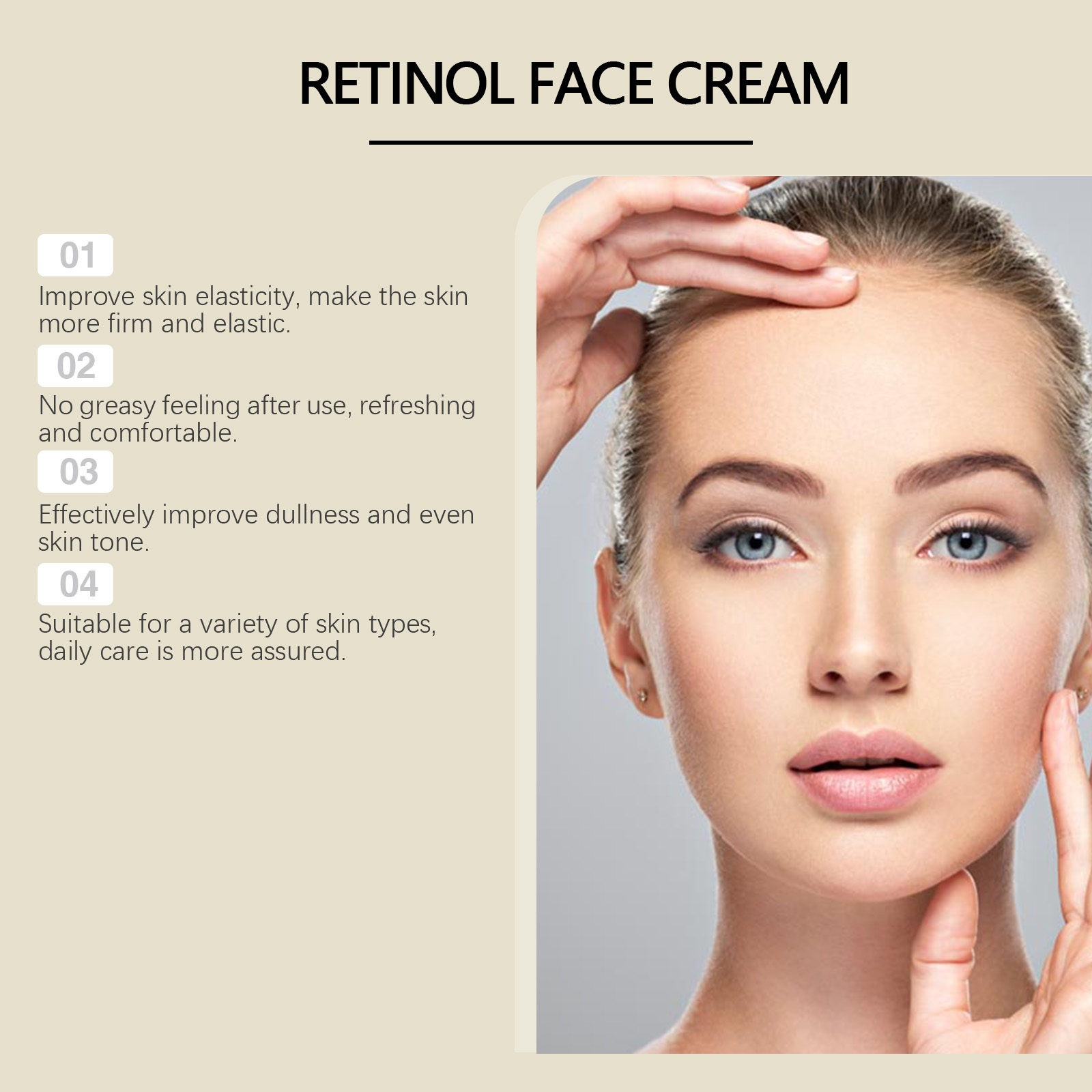 Our retinol moisturizing cream contains lemon extract, vitamin E (tocopherol). It reduces sagging, enhances facial contours and tightens skin. Its application is simple: take a proper amount of this product, clean your face and keep it dry. Apply evenly to face. Gently massage until absorbed. It can also fade fine lines and keep skin smooth and youthful.