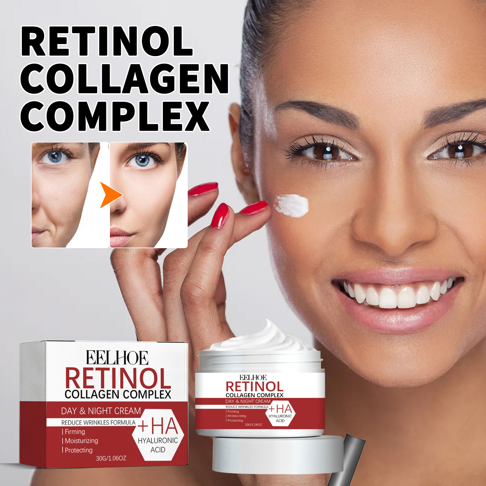 Our retinol moisturizing cream contains collagen and hyaluronic acid. It can increase skin elasticity, promote collagen production, stimulate skin cell renewal, nourish skin, whitening and moisturizing. Its use method is very simple: after cleansing and toning, apply appropriate amount of this product evenly on the face, gently massage with fingertips until completely absorbed. And can improve the skin, moisturize the skin, moisturize dry skin.