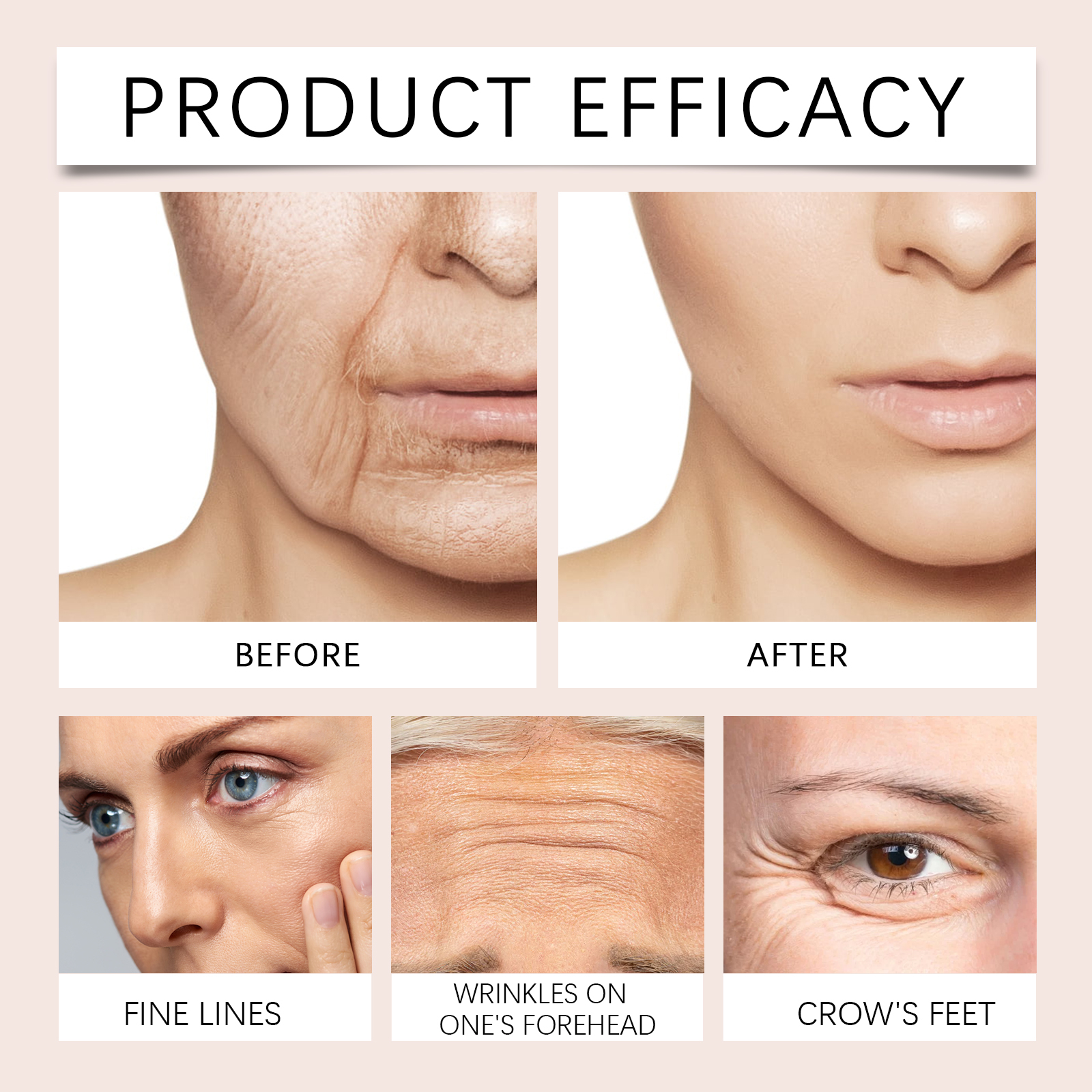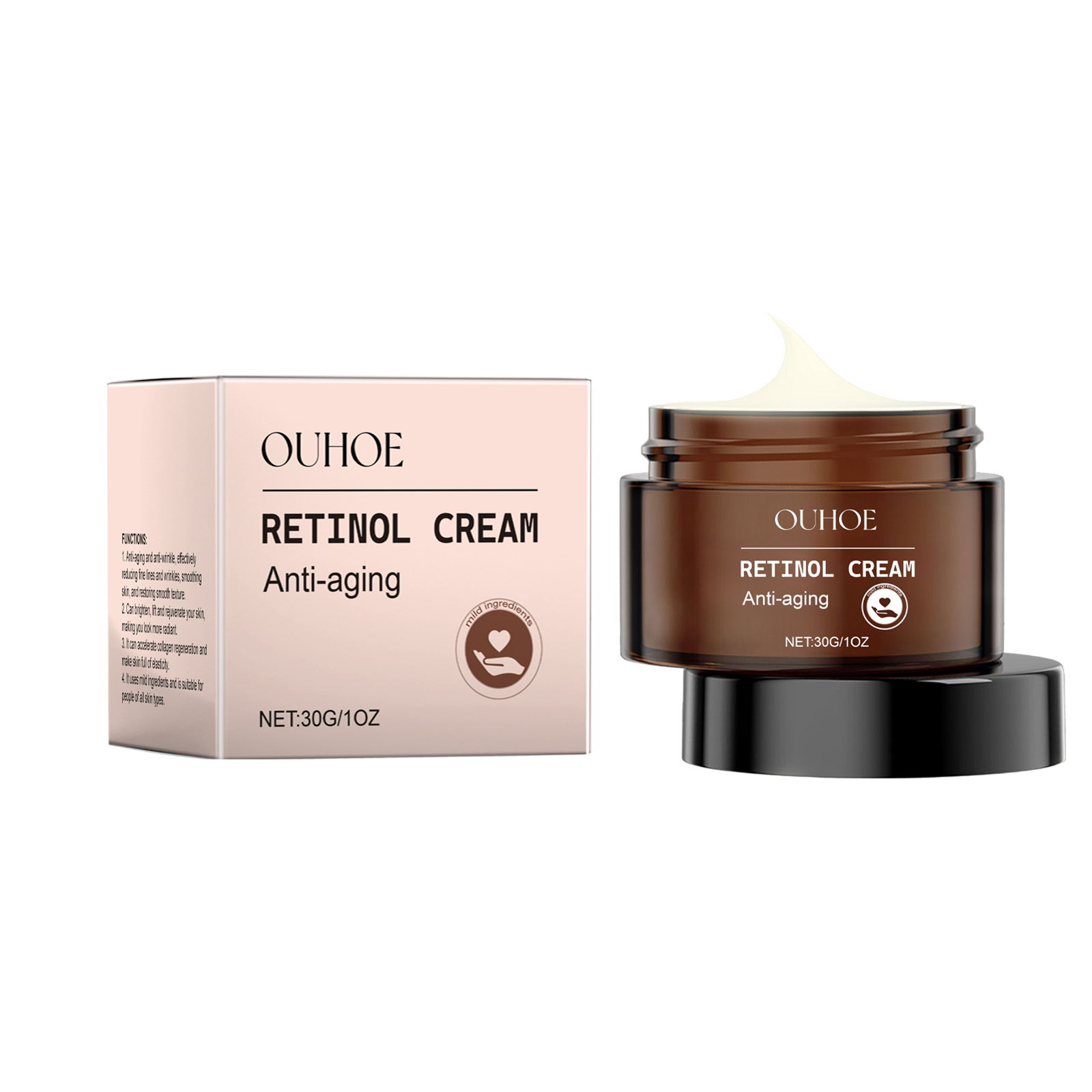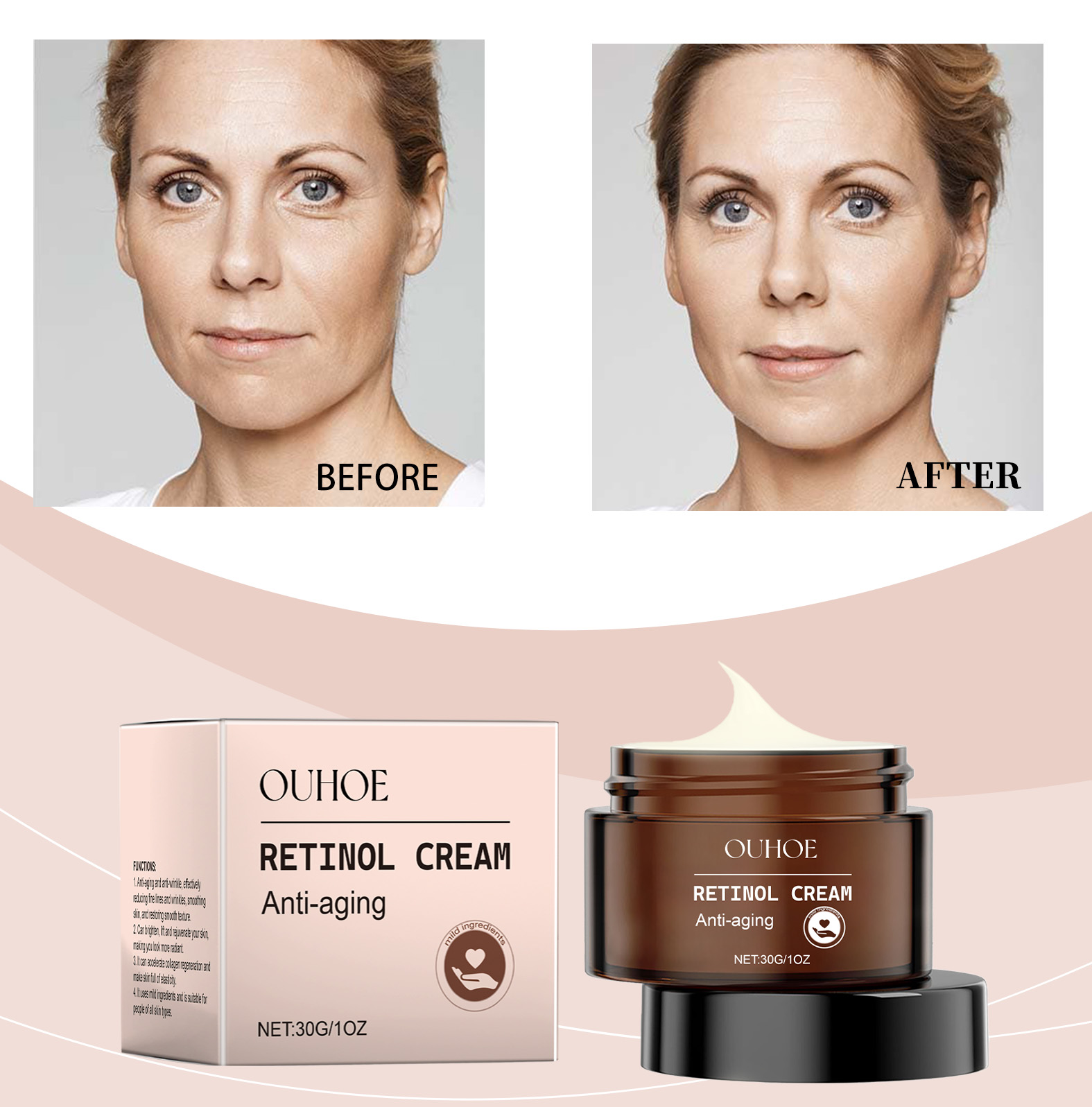Our retinol anti-wrinkle cream contains Paeonia root extract and hyaluronic acid. It reduces fine lines and wrinkles and slows the skin aging process. Its application method is very simple: thoroughly clean the skin, dry first, apply appropriate amount of this product evenly on the face skin, gently massage until completely absorbed. And can deeply nourish the skin, enhance skin elasticity and firmness.