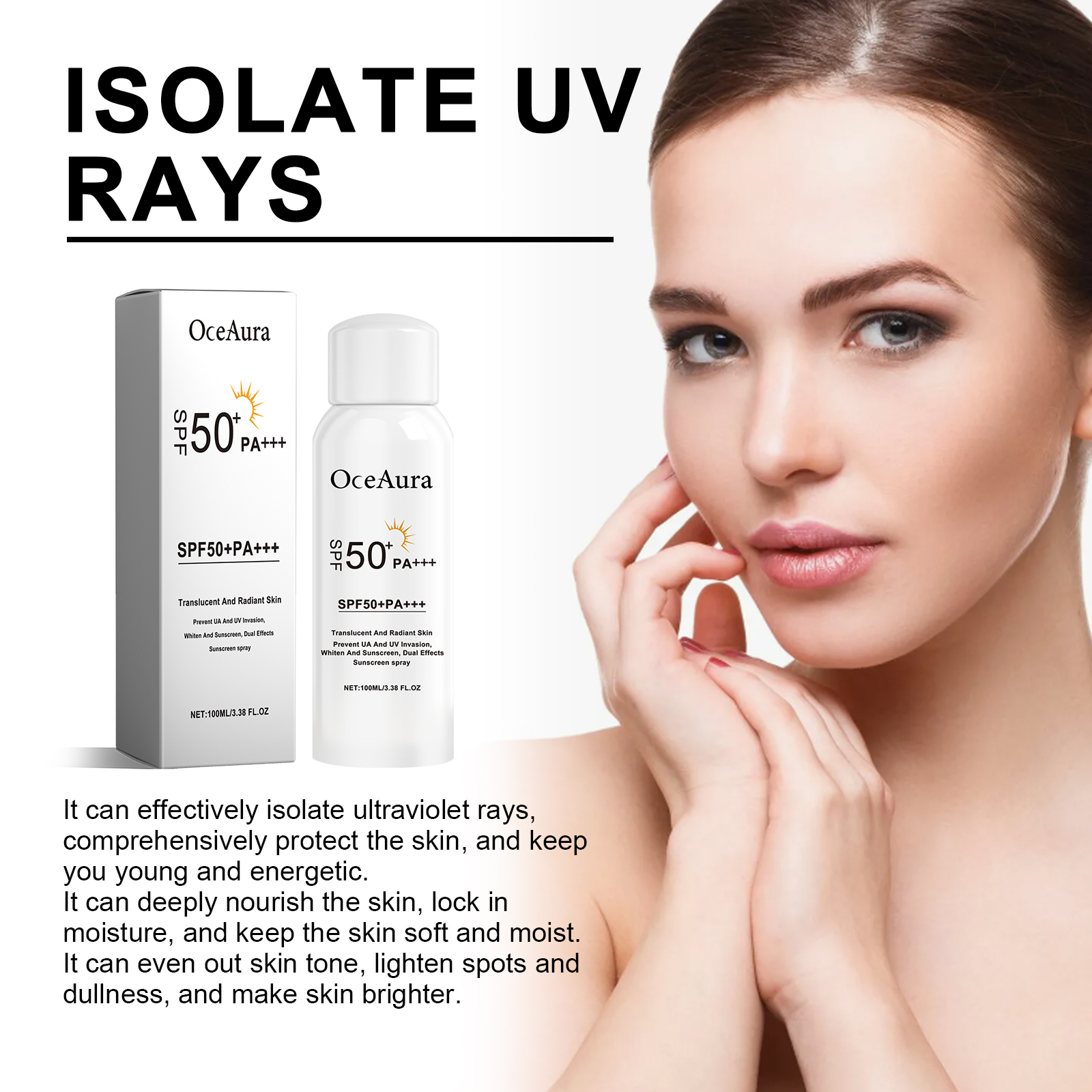 Our Sunscreen Spray contains Glycerin, Titanium Dioxide, Hydrolyzed Rice Extract. It can effectively protect the skin from UV rays, keep you young and energetic, deeply nourish the skin, lock in moisture, and keep the skin soft and moist. Even out skin tone, lighten spots and dullness, and brighten skin. Its application method is very simple: shake the bottle before use, open the bottle cap, spray the sunscreen spray into the palm, evenly spread on the face, or press the pump head 20cm away from the skin, evenly spray on the skin. This product can effectively resist UV rays, protect the skin from UV damage, and reduce tanning and sunburn.