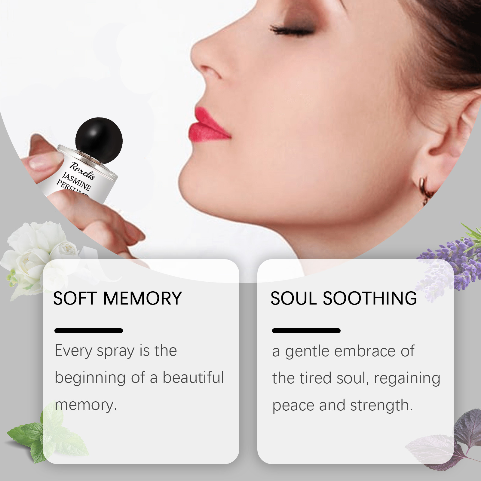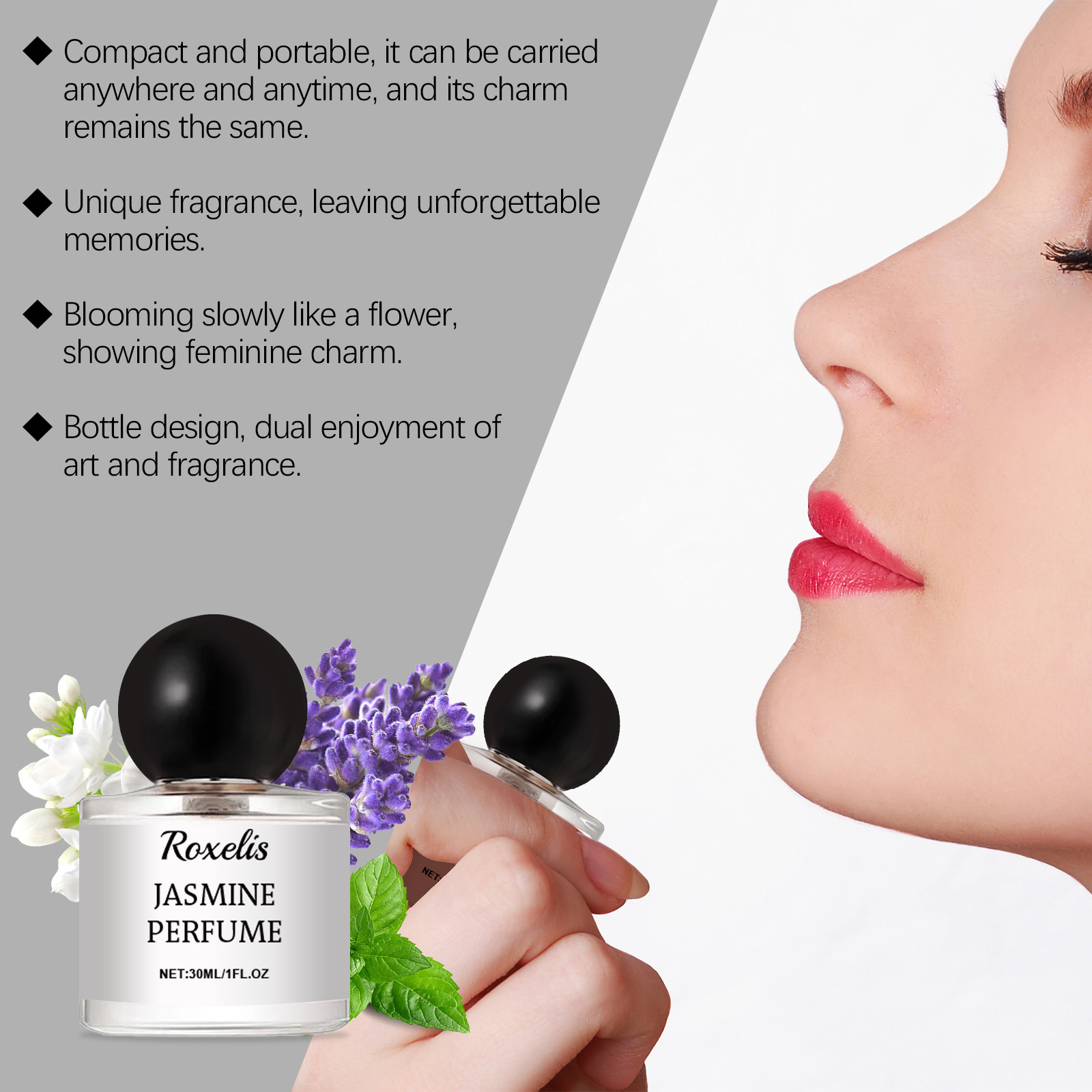 Our Romantic pair perfume (Jasmine) contains mint leaf extract, Perilla extract. It can be a gentle embrace of a tired soul, rediscovering peace and strength. The way to use it is simple: open the bottle. Press the nozzle and spray the perfume on your neck, wrists or other parts of your body. And the delicate flowers gently blowing, every step of the moving story.