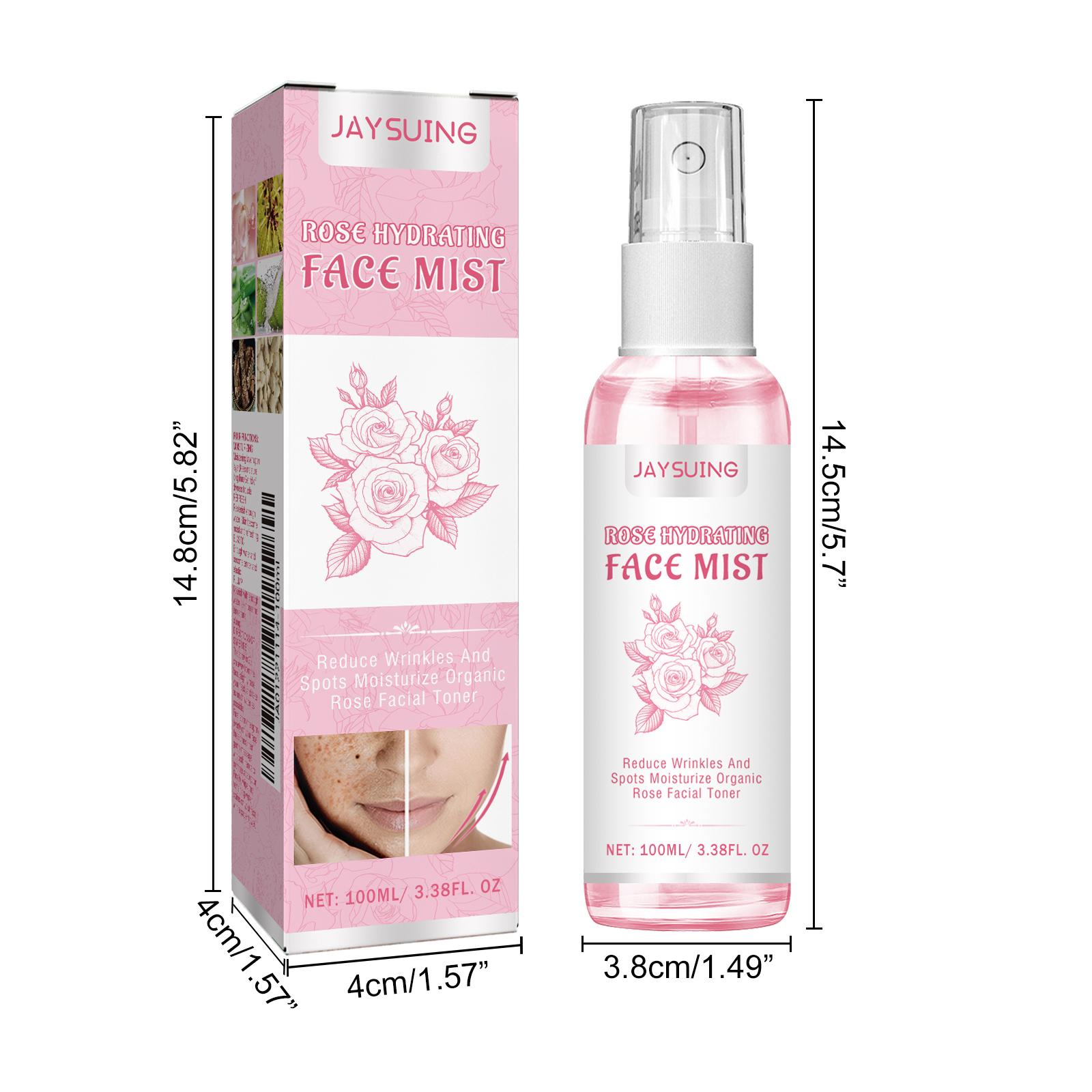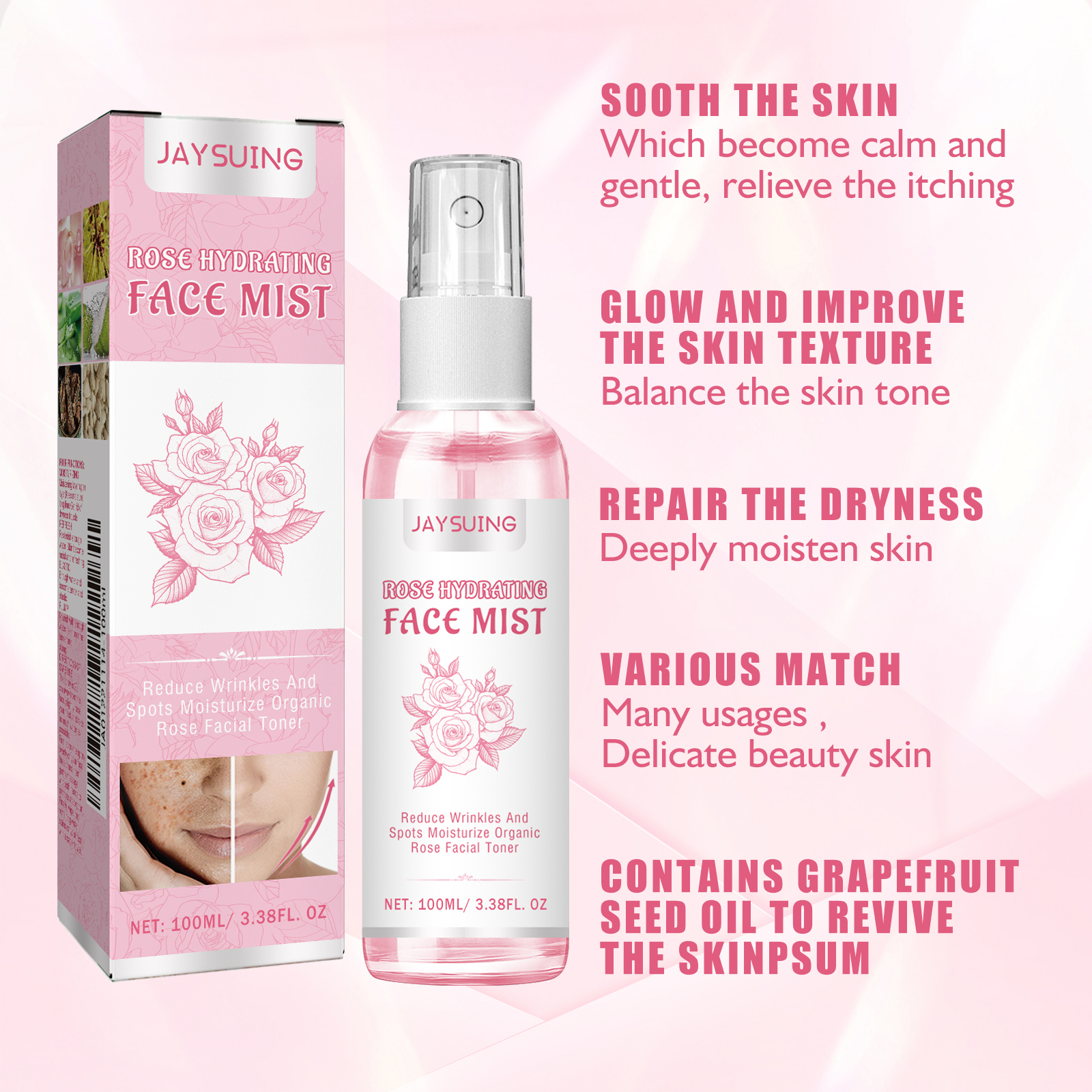 Our Rose Face toner contains rose water, witch hazel extract and hibiscus bark extract. It can be anti-aging, anti-wrinkle nourishing, firming, brightening, reducing wrinkles and spots, moisturizing organic Rose facial toner. Its use is simple: place the spray 20 centimeters from your face, gently lift your head, and drink as much water as possible. First, spray the spray evenly on your face three times, then gently massage it with both hands to promote absorption. Finally, wipe any water stains off your face with a paper towel. Moisturize layer after layer. Moisturize for a long time, get rid of dryness, refresh and add enough water to make the skin hydrated and fresh, elastic and hydrated, soft and elastic, plump and sufficient moisture nourishes the skin, tender and full.