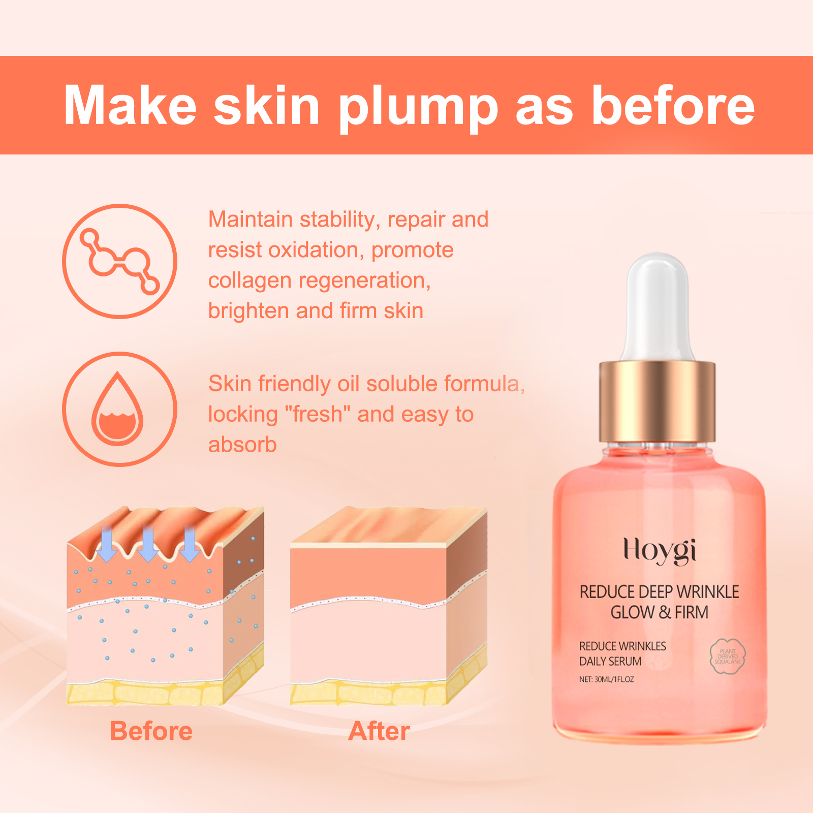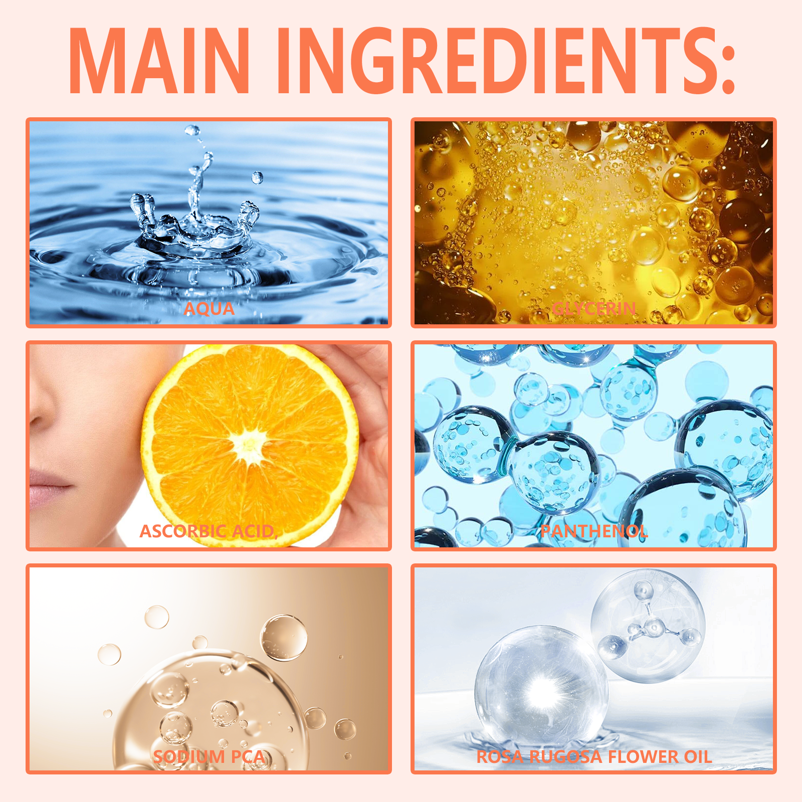 Our Rose Oil VC anti-aging serum contains glycerin, panthenol and PCA sodium. It stabilizes, promotes collagen regeneration and brightens and firmers the skin. Its use method is very simple: after cleansing and toning, take 3-5 drops of essence on the face, gently pat or massage with fingertips to promote absorption, until the original solution is fully absorbed by the skin. It can promote collagen synthesis, enhance skin elasticity, brighten and firm skin.