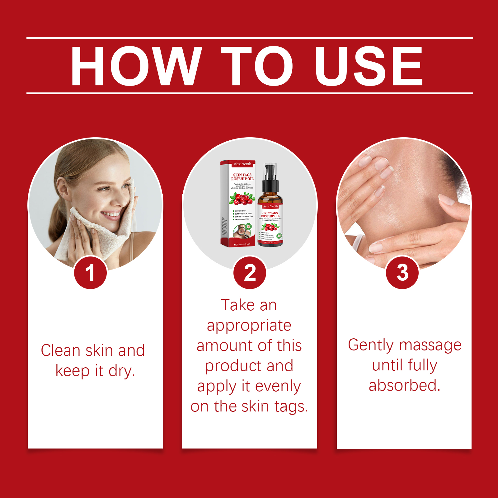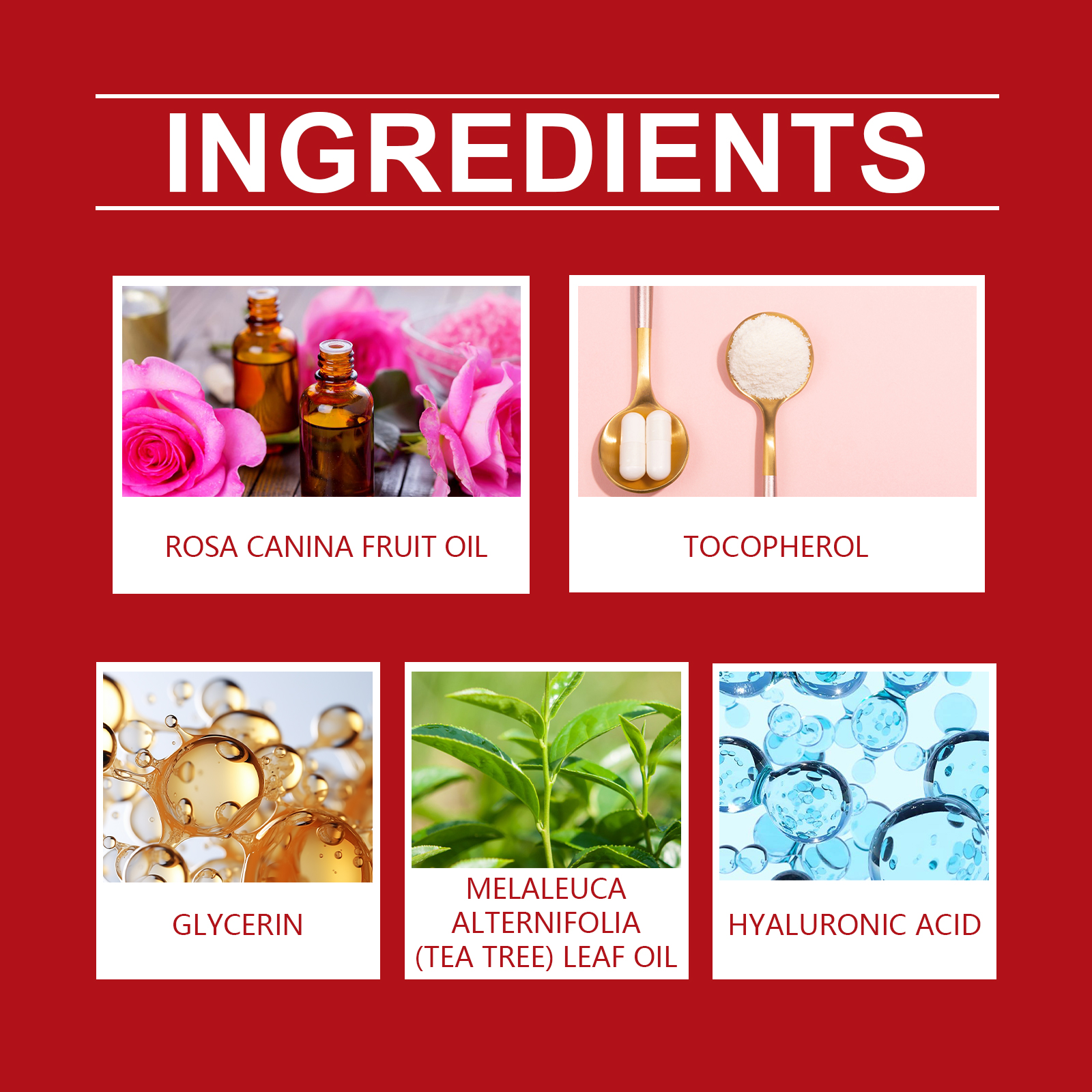 Our rosehip Seed oil contains tea leaf oil and hyaluronic acid. It can be absorbed quickly without being greasy. Highly effective formula to help restore smooth and delicate skin. The way to use it is simple: clean the skin and keep it dry. Apply appropriate amount of this product evenly on the skin label. Massage gently until fully absorbed. And continuous use can effectively reduce skin warts.