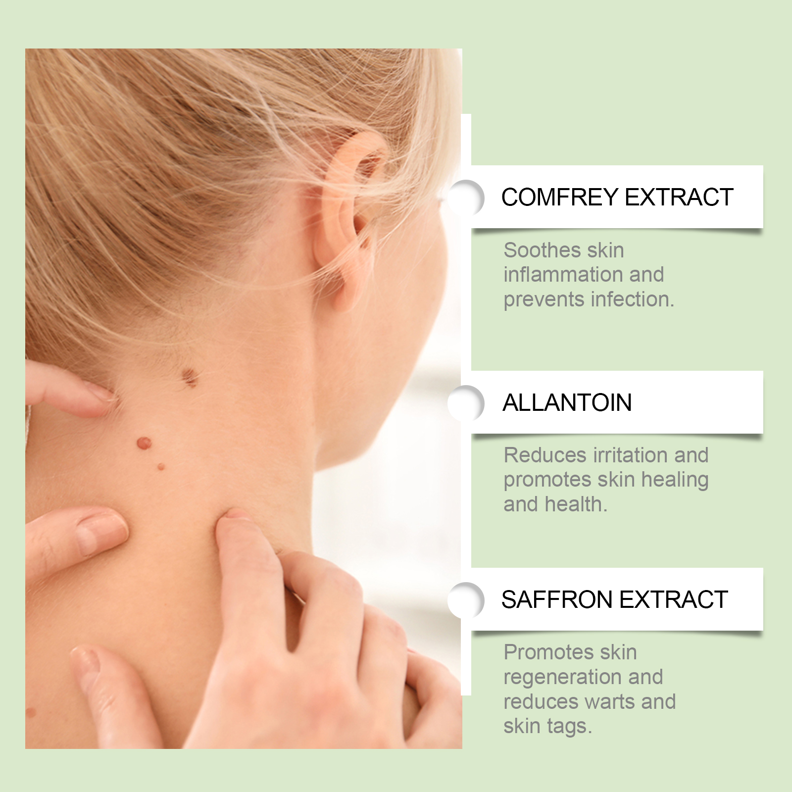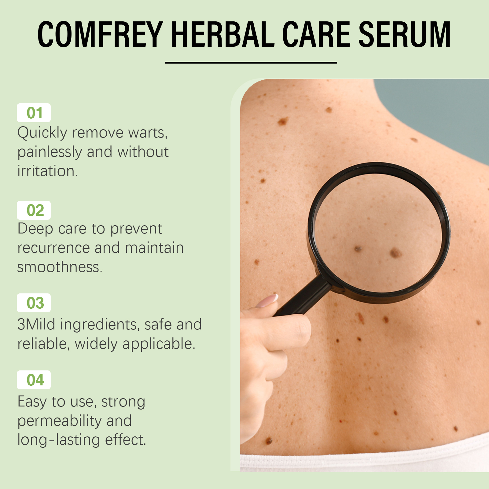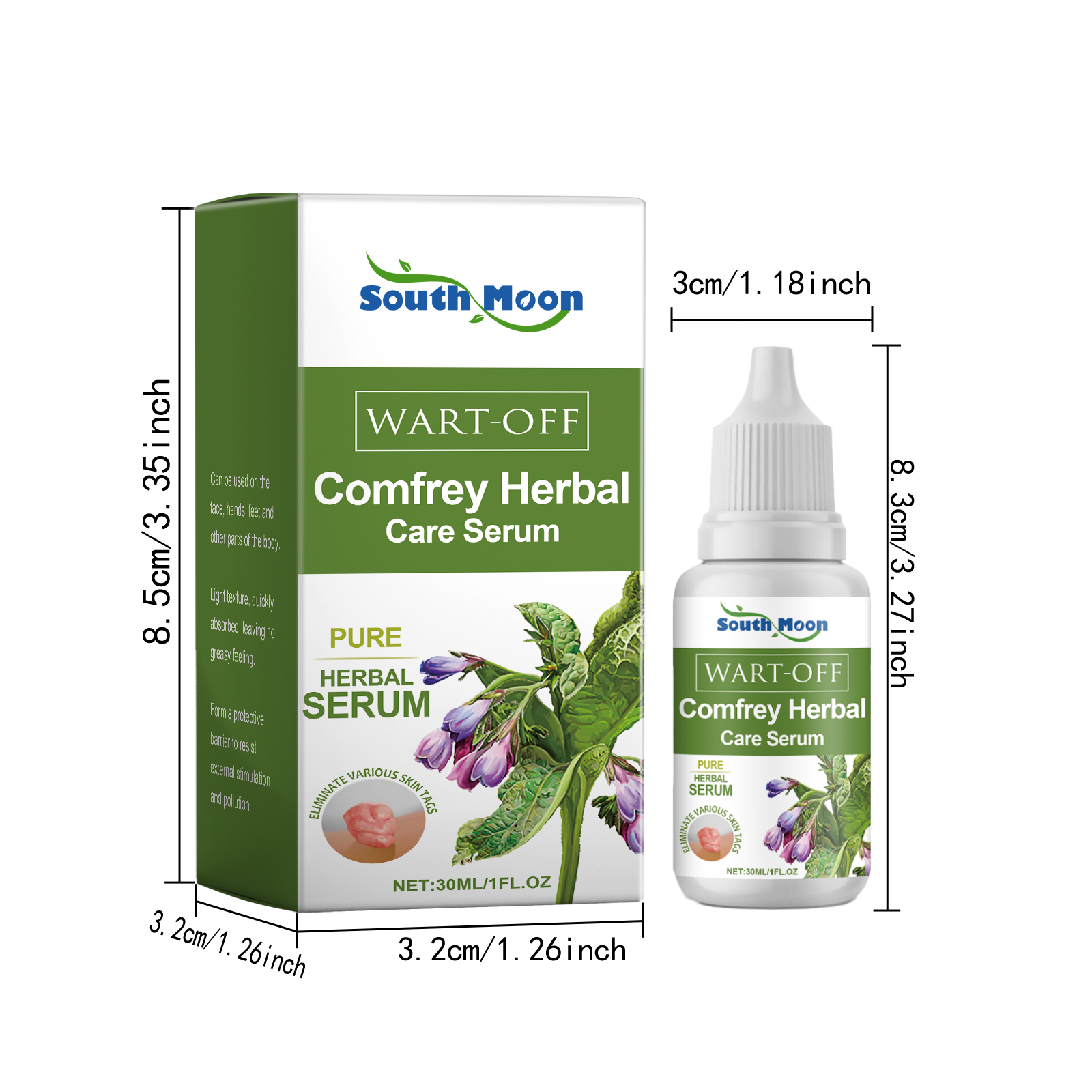 Our comfrey anti-wart serum contains glycerin, comfrey root extract, hyaluronic acid. It can penetrate deep into the skin and completely remove warts and skin tags, preventing recurrence. The way to apply it is simple: first, thoroughly clean the skin and dry off the water. Apply appropriate amount of this product on the skin with skin labels, moles, warts, spots, gently massage until completely absorbed. And can quickly act on skin warts and skin tags, significantly improving their appearance. Use essence form, precise dosage, avoid waste.