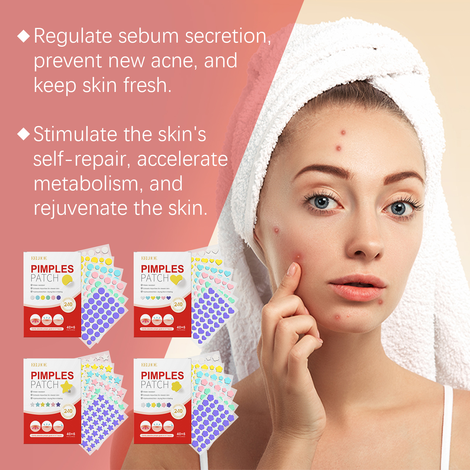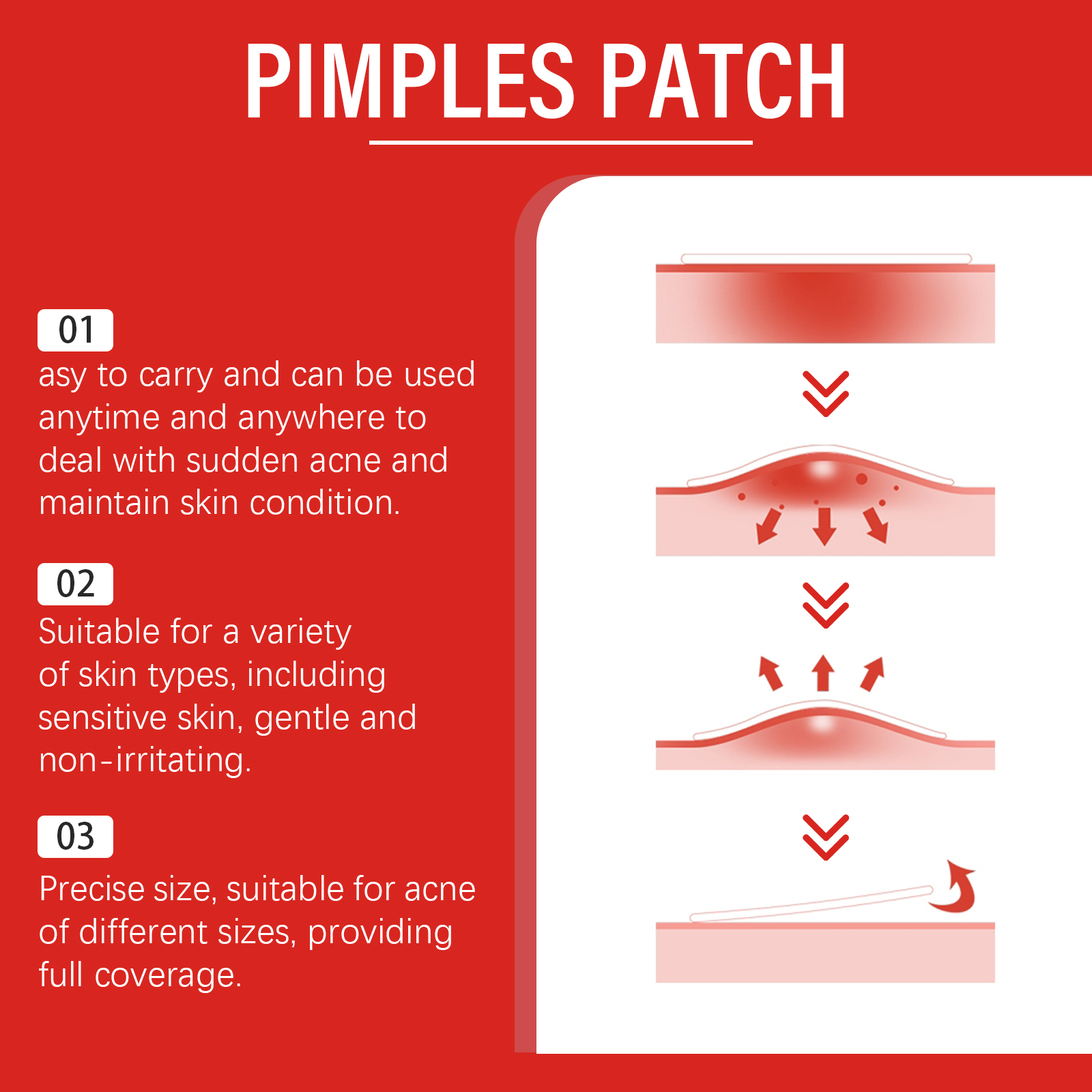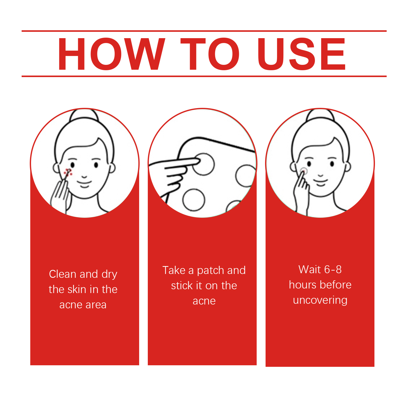 Our salicylic acid acne patches contain glycerin, tocopherol (vitamin E). It can deeply hydrate and speed up the disappearance of acne; Relieves redness, calms skin and relieves discomfort. Its application is simple: 1. Clean and dry the skin on the acne area; 2. Take a patch and apply it to the pimple; 3. Wait 6-8 hours before uncovering. Firmly fit, form a protective layer, soothe skin, continue to play the effect, keep skin comfortable. Mild ingredients, does not irritate the skin, suitable for all skin types.