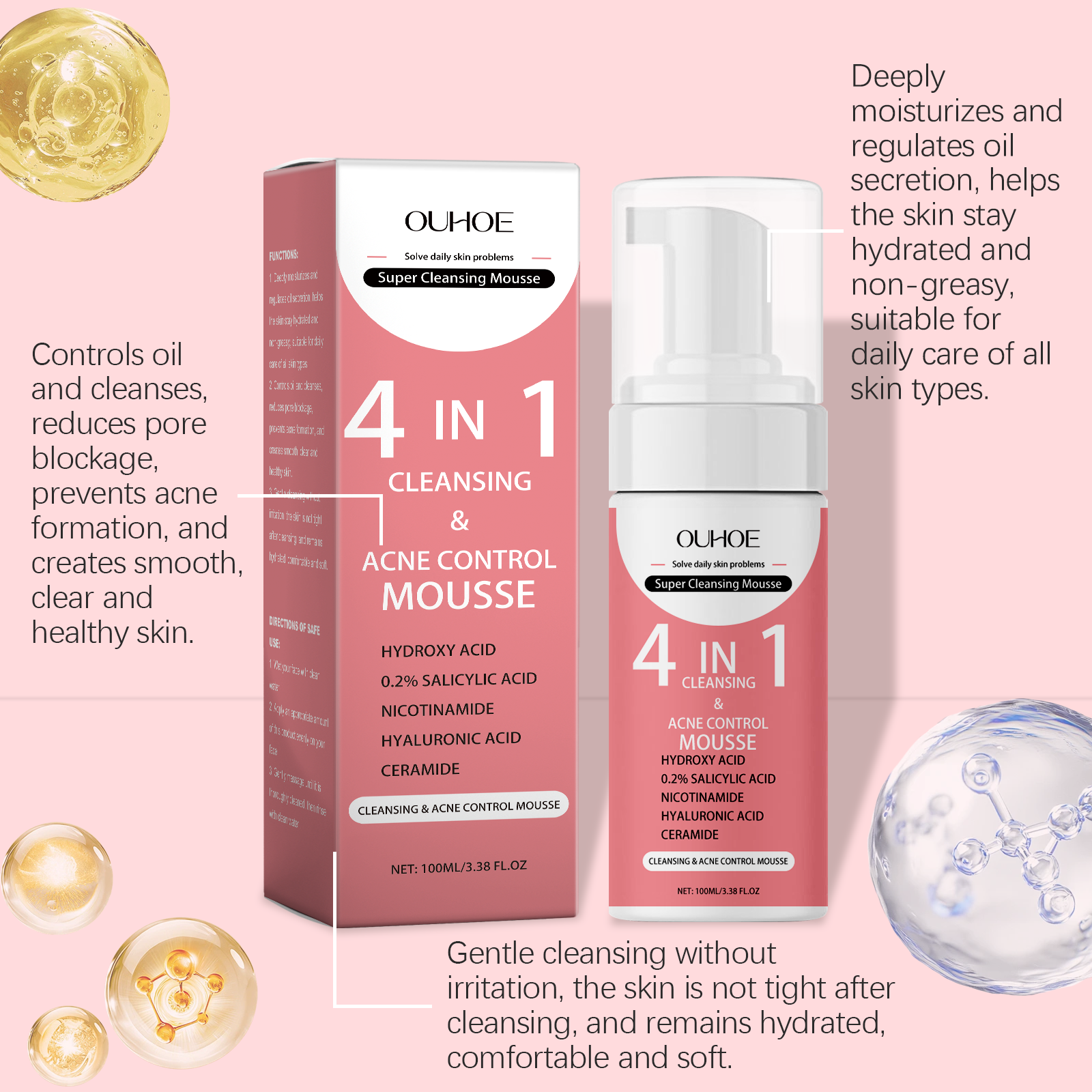 Our salicylic acid foam cleanser contains hyaluronic acid, niacinamide, ceramide AP. It deeply cleans pores and helps keep skin fresh and non-greasy. Helps to lighten skin tone and control oil secretion. Its use method is very simple: 1. Wet your face with water. 2. Apply appropriate amount to face evenly. 3. Gently massage until thoroughly cleaned, then rinse with water. Rich foam that penetrates deep into pores to help dissolve excess oils and impurities; Balance skin oil secretion, help skin stay fresh and not greasy.