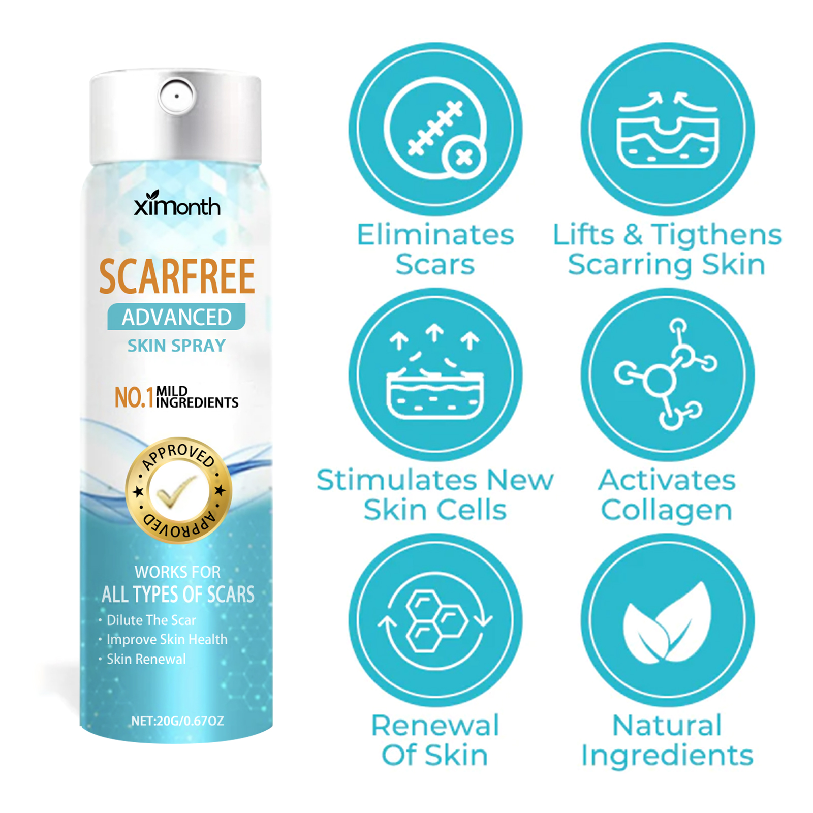 Our Scarfree Advanced Skin Spray contains Allantoin, Aloe Barbadensis Leaf Extract, Camellia Sinensis Leaf Extract. It improves skin moisture, protects scar tissue, controls collagen synthesis, and coordinates the skin growth process to produce smoother, more even skin. Its application is simple: gently clean and dry the skin, spray the affected area, and gently massage the scar. New scars can disappear within 2 weeks, while old scars can be eliminated within 4 weeks. It can reduce scars, improve skin, and solve different skin problems.