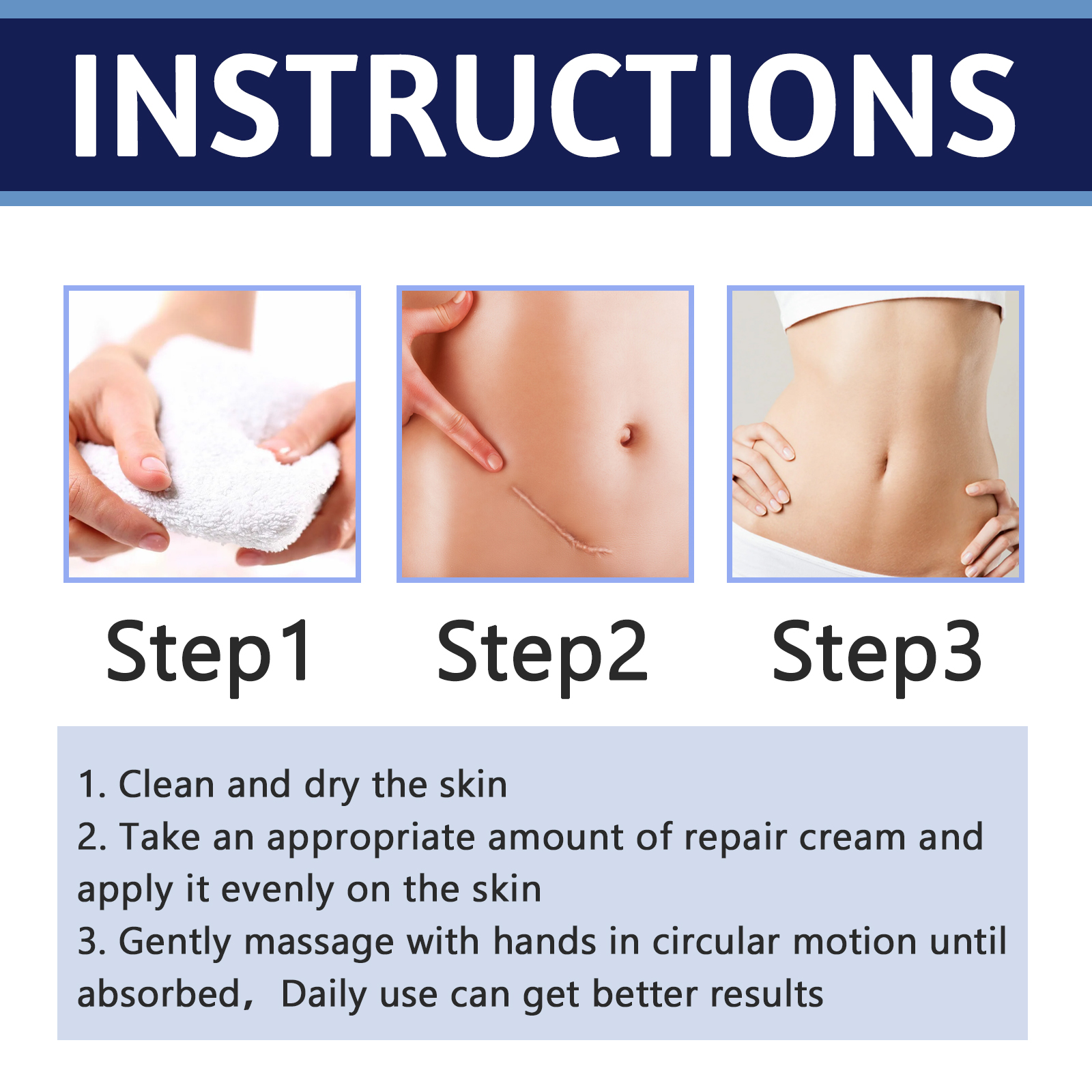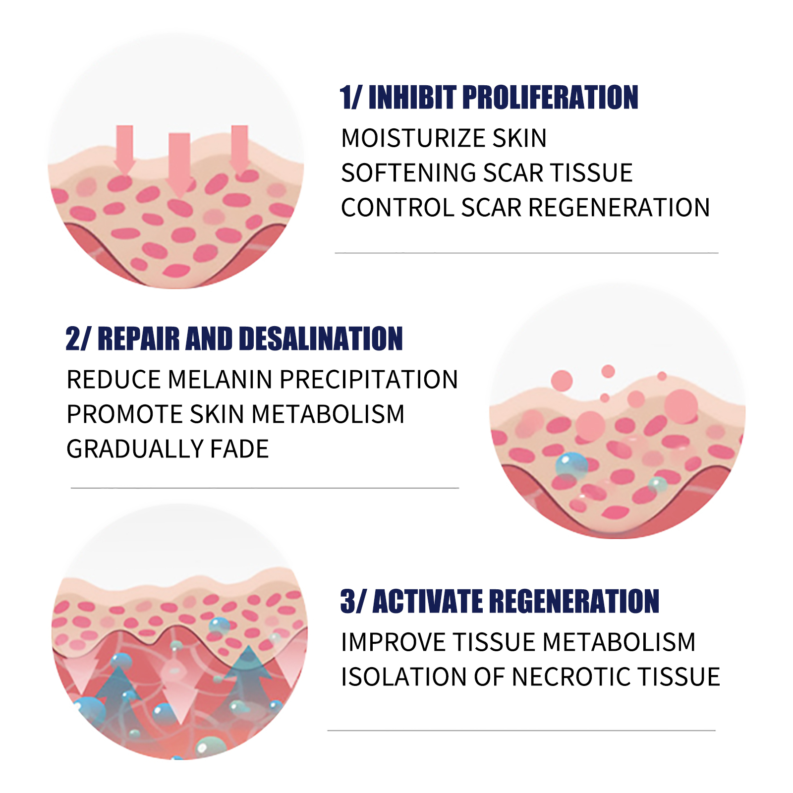 Our scar cream contains allantoin, aloe vera extract, and polydimethylsiloxane. It softens and smooths scars, reduces redness and relieves discomfort; Mild odorless, invisible repair. Its application method is simple: 1. Clean and dry the skin; 2. Apply proper amount of repair cream evenly on the skin; 3. Gently massage with the hand in a circular motion until it is absorbed, and the effect is better for daily use. Moisturize skin, soften scar tissue, control scar regeneration; Reduce melanin precipitation, promote skin metabolism gradually fade; Improve tissue metabolism and separate necrotic tissue.