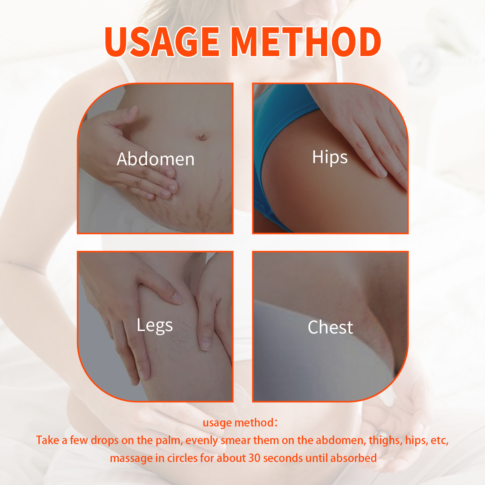 Our scar oil contains lavender, chamomile, rosemary. It can be mild and non-irritating, deeply nourishing and moisturizing, enhance skin elasticity, inhibit skin aging, stretch marks growth, gradually restore the original skin firmness and softness, help our skin firm and firm, look younger. Its use method is very simple: take a few drops on the palm, evenly apply on the abdomen, thighs, buttocks, etc., massage in circles for about 30 seconds until absorbed. Scar repair oil enhances skin elasticity, deeply nourishes moisture, is mild and non-irritating, and inhibits the growth of stretch marks. Helps stimulate the production of collagen and elastin in the skin, resulting in a stronger and healthier skin structure.