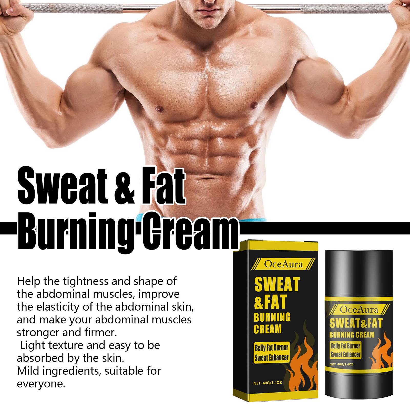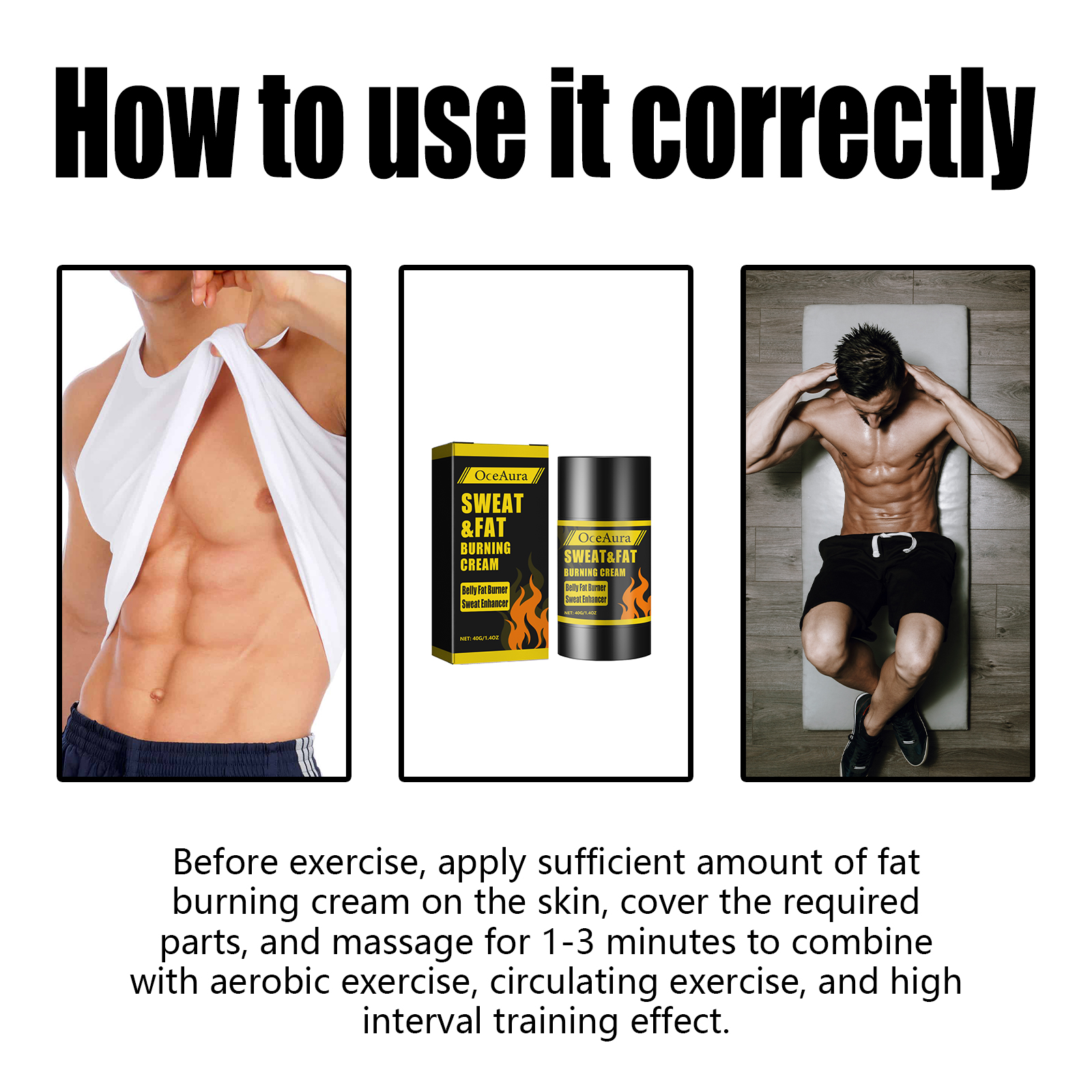 Our Sweat & Fat Burning Cream contains Punica Granatum Seed Oil, Cocos Nucifera(Coconut) Oil, Simmondsia Chinensis(Jojoba) Seed Oil. It can provide adequate nutrition for the abdominal skin, significantly improve the outline of the entire abdominal muscles, fix the condition of the abdominal muscles, help the tightness and shape of the abdominal muscles, improve the elasticity of the abdominal skin, and make your abdominal muscles stronger and firmer. Its use method is very simple: before exercise, apply a sufficient amount of fat burning cream on the skin, cover the required parts and massage for 1-3 minutes, combined with aerobic exercise and cycling exercise, to achieve the effect of high interval training. It can help the tightness and shape of the abdominal muscles, improve the elasticity of the abdominal skin, and make the abdominal muscles stronger and tighter.