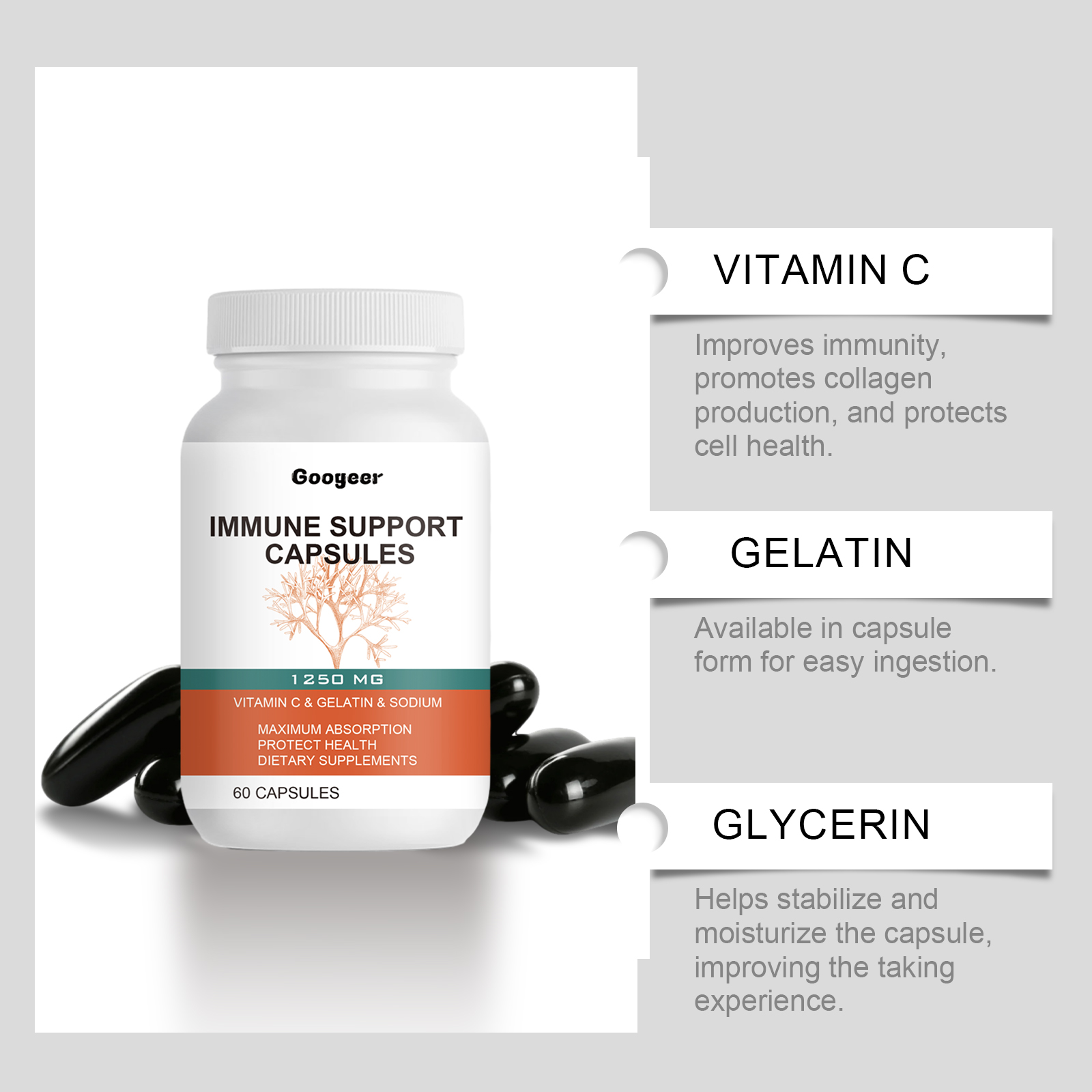 Our nori dietary supplement capsules contain glycerin and vitamin C. It can promote physical health, accelerate fatigue relief, and energize the body. Its use is very simple: 2 times a day, 1 to 2 capsules each time. And can be quickly used by the human body, the effect is significant, it effectively supports the body function.
