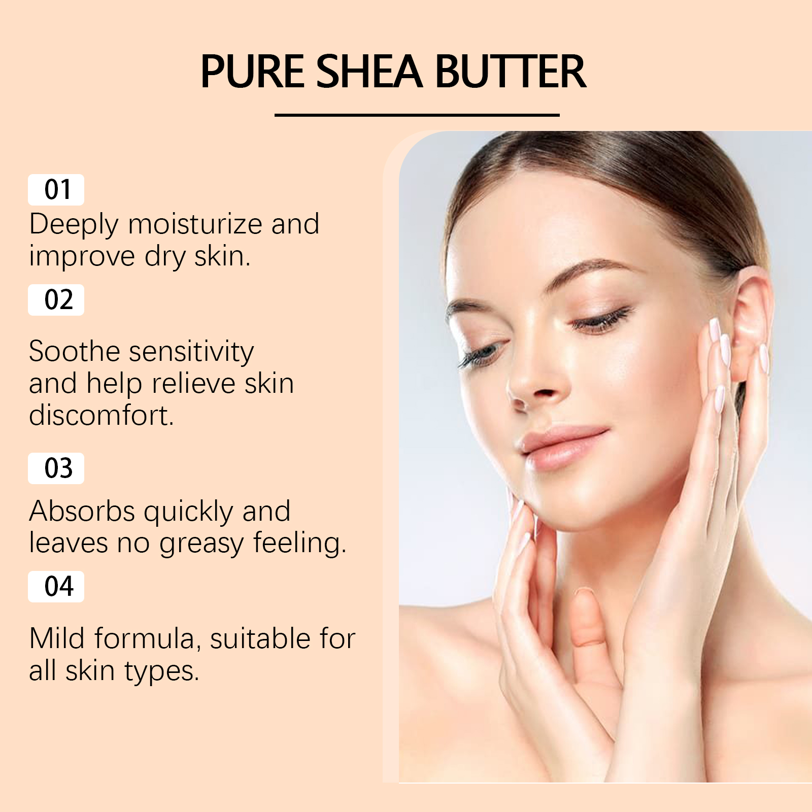 Our shea butter moisturizer contains hyaluronic acid and vitamin E. It locks in moisture and moisturizes the skin, keeping it hydrated for a long time. The way to use it is simple: clean the skin and keep it dry. Take appropriate amount of cream and apply evenly to the skin. Massage gently until fully absorbed. And can deeply moisturize, improve dry skin.