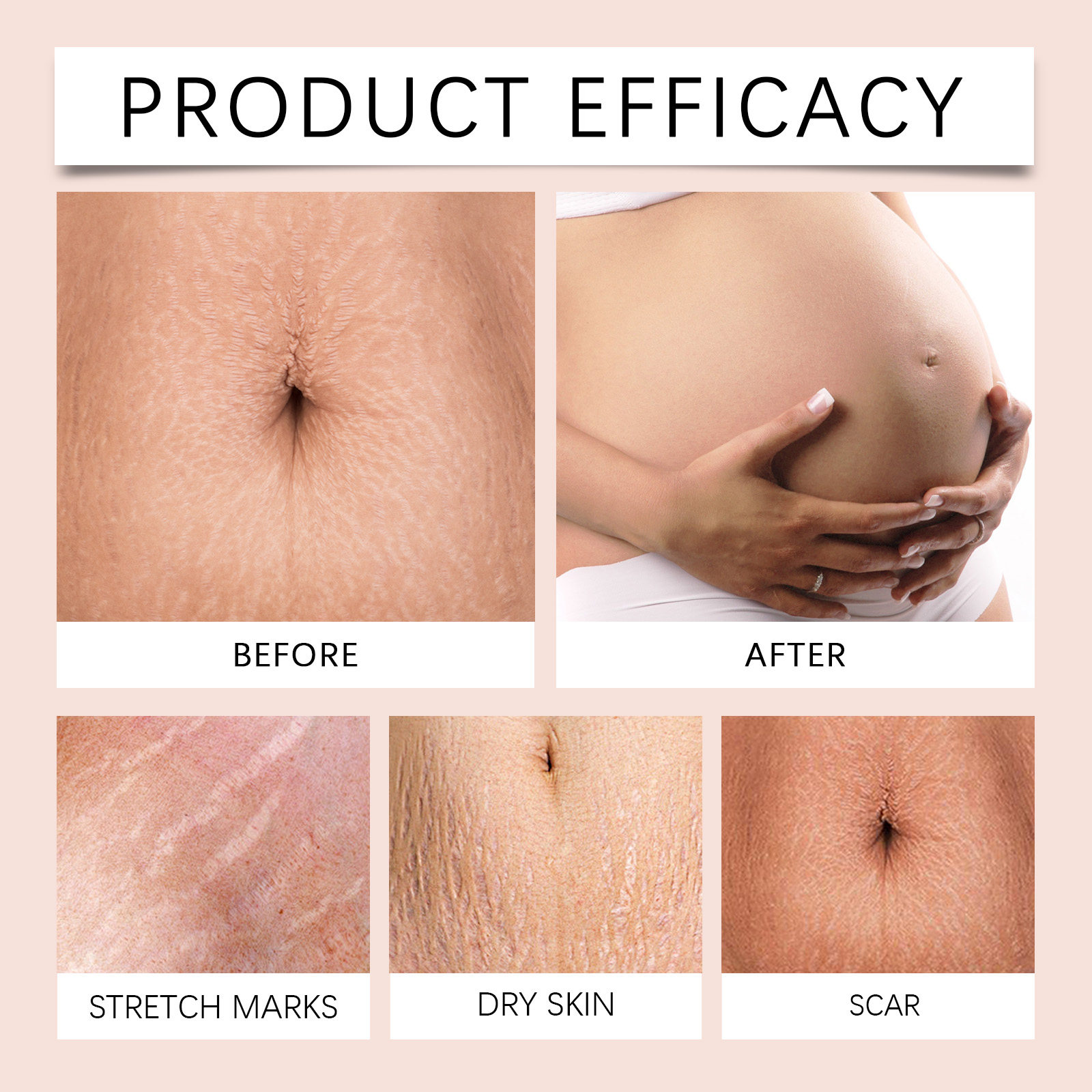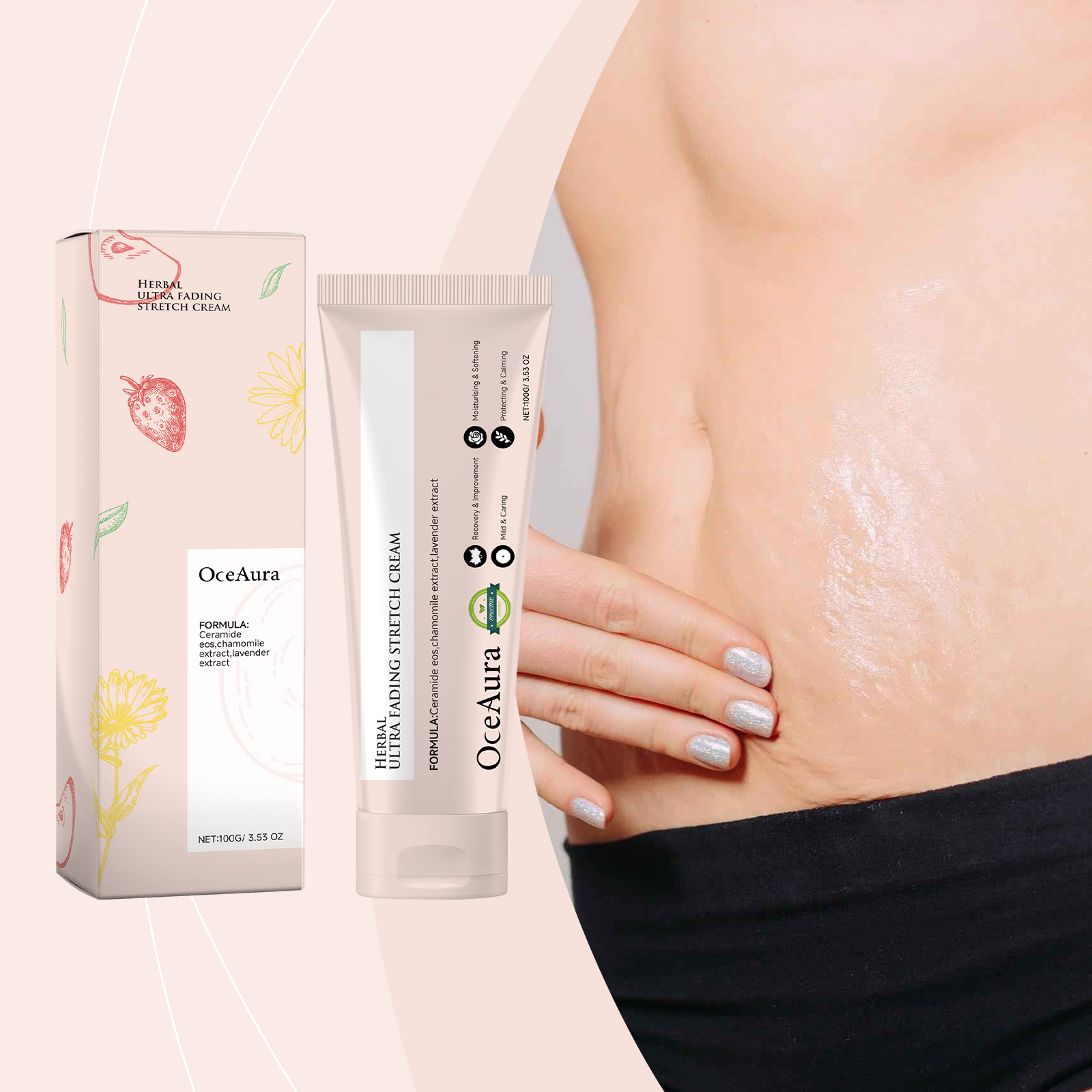 Our pregnancy care cream contains ceramide eos, chamomile extract, lavender extract. It can promote skin regeneration, reduce stretch marks and scars, and restore smooth skin. It deeply moisturizes the skin, prevents dryness, and enhances elasticity and softness. Its use method is very simple: 1. First clean the skin of the stretch mark area; 2. Apply appropriate amount of this product evenly to stretch marks; 3. Gently massage until completely absorbed. Pregnancy care cream effectively reduces scars and restores smooth skin. Deep moisture, improve skin elasticity.