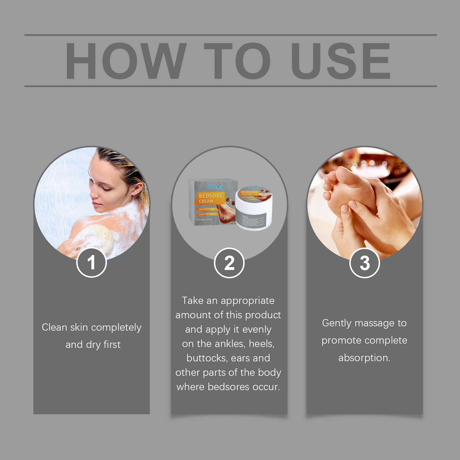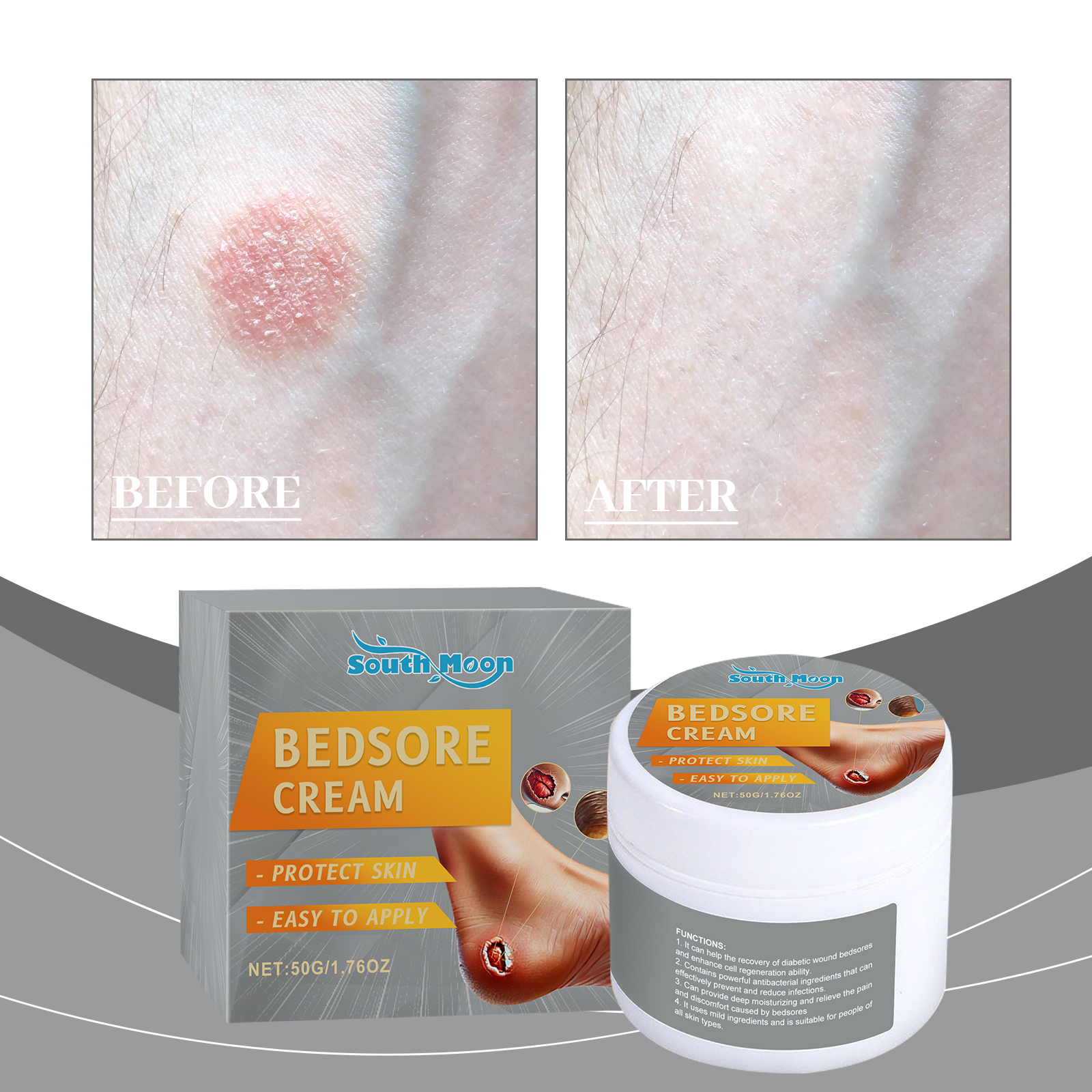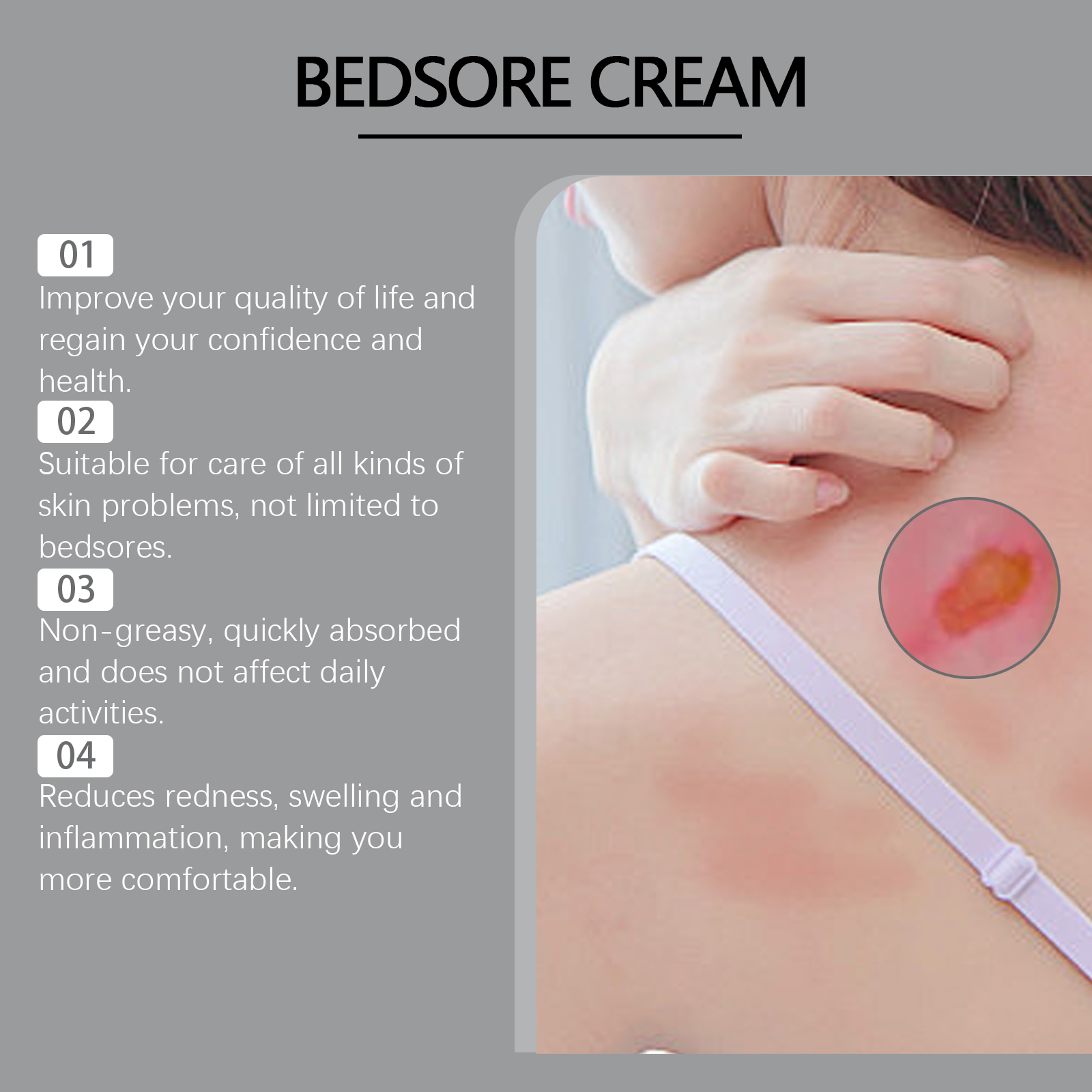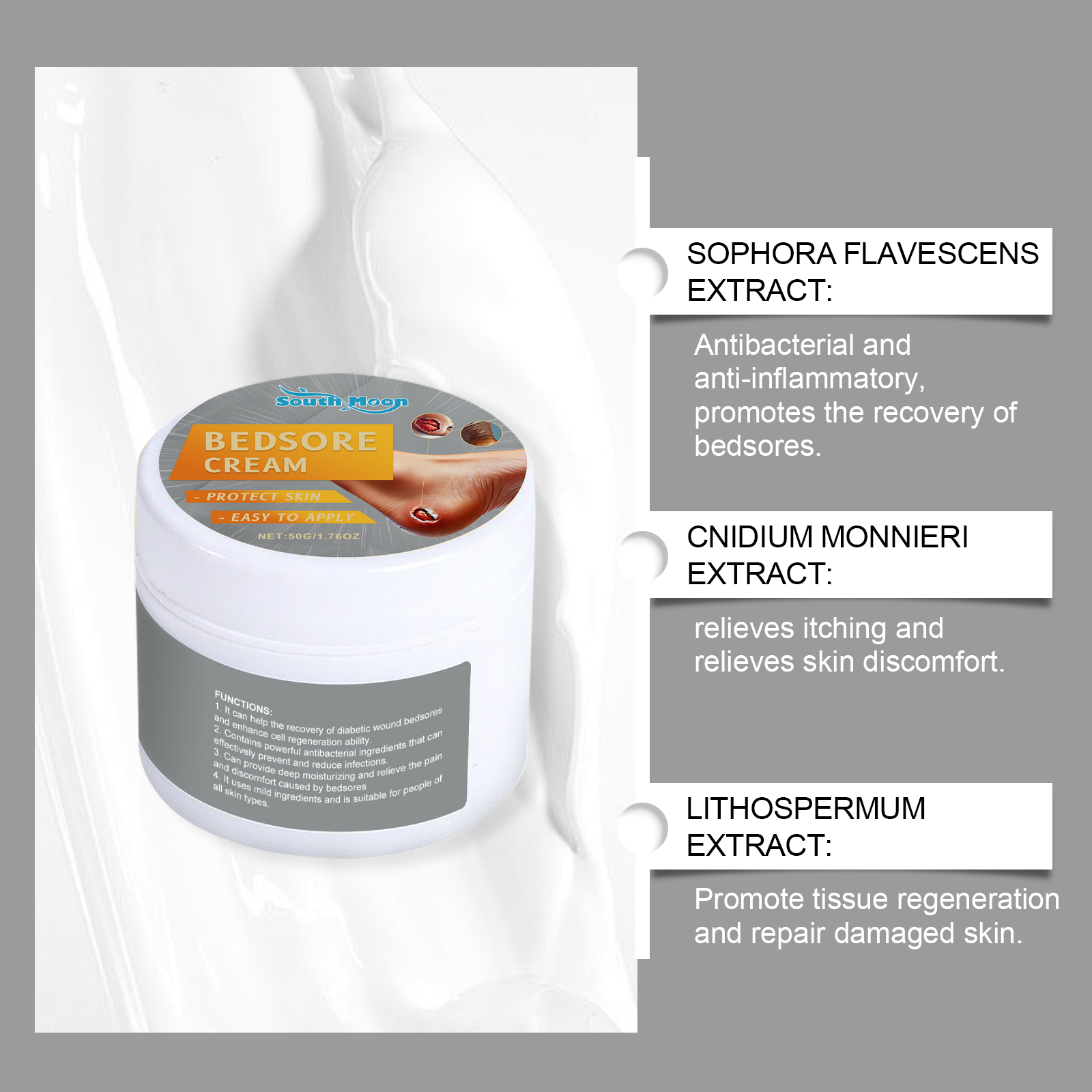 Our skin care cream contains comfrey extract and sophora flower extract. It can relieve pain and discomfort and make the user feel more comfortable. Its use method is very simple: thoroughly clean the skin, dry first, take appropriate amount of this product, evenly apply to the ankles, high heels, buttocks, ears and other parts of the body where bedsores occur, gently massage to promote complete absorption. It can also promote recovery and reduce the risk of bedsores spreading.