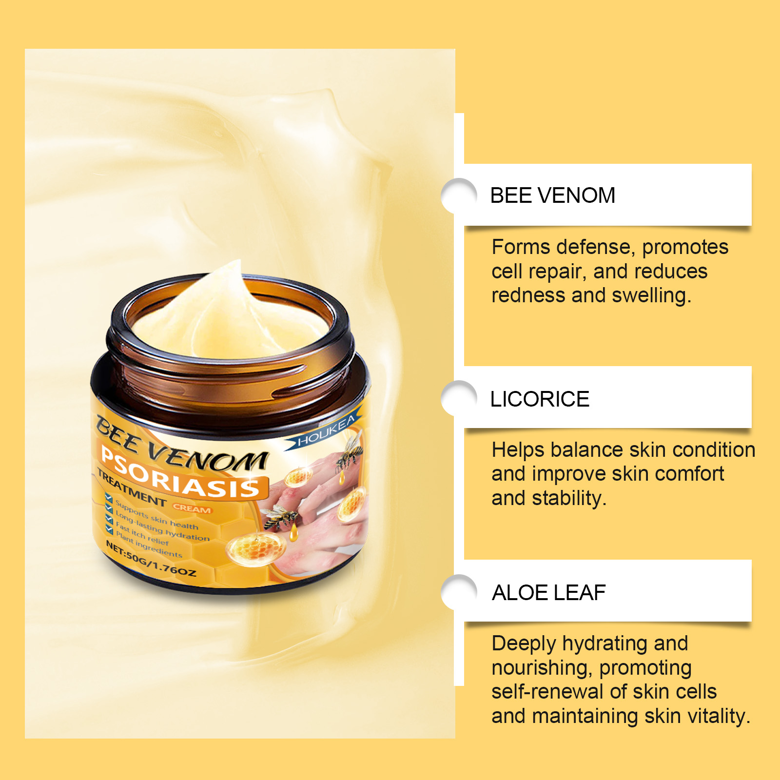 Our skin care cream contains bee venom, licorice, aloe vera leaves. It can be designed specifically for psoriasis skin. Its application method is very simple: after the skin is clean and dry, apply appropriate amount of this product evenly to the affected area, gently massage until absorbed. And can be intensively hydrating, improve dryness, and strengthen the skin barrier.