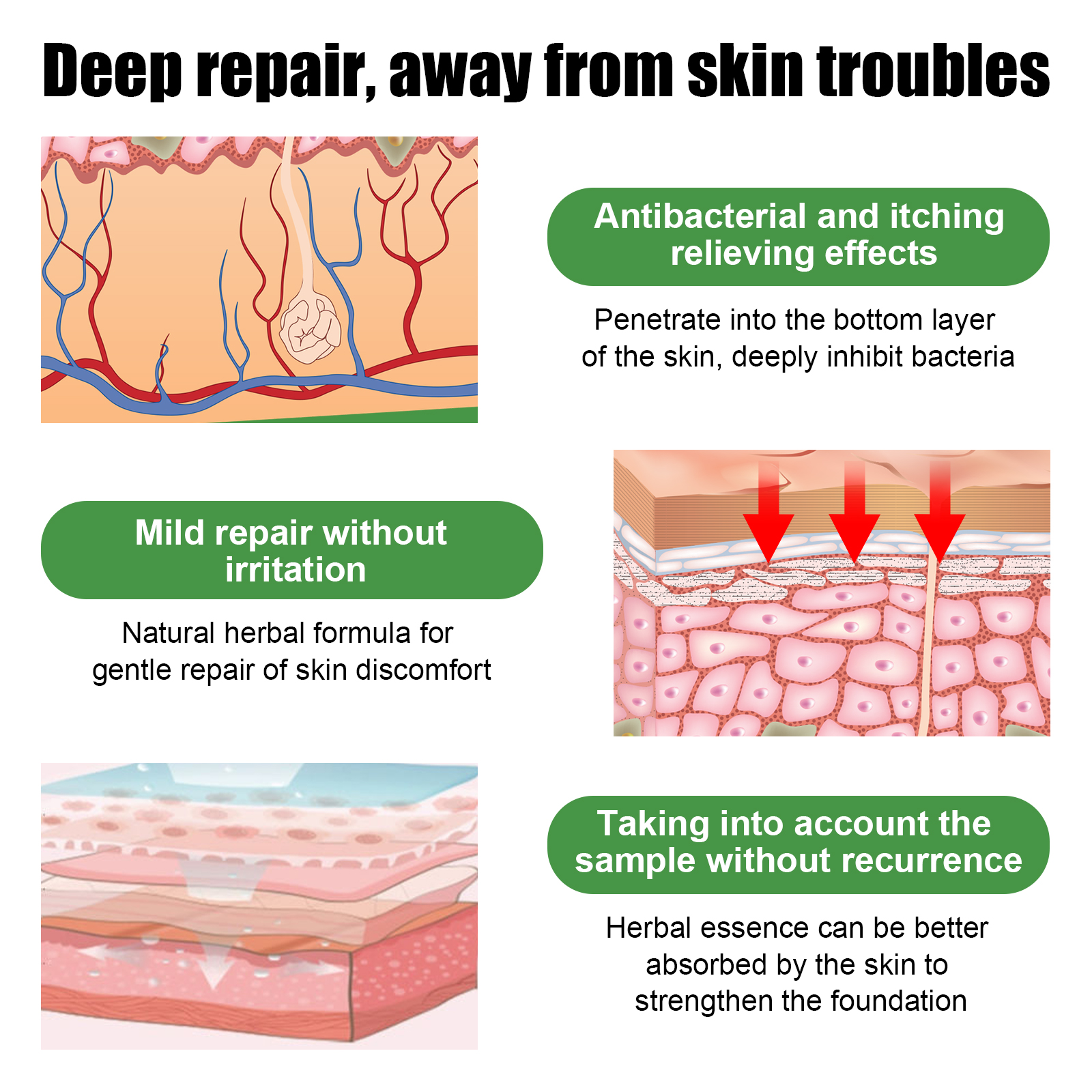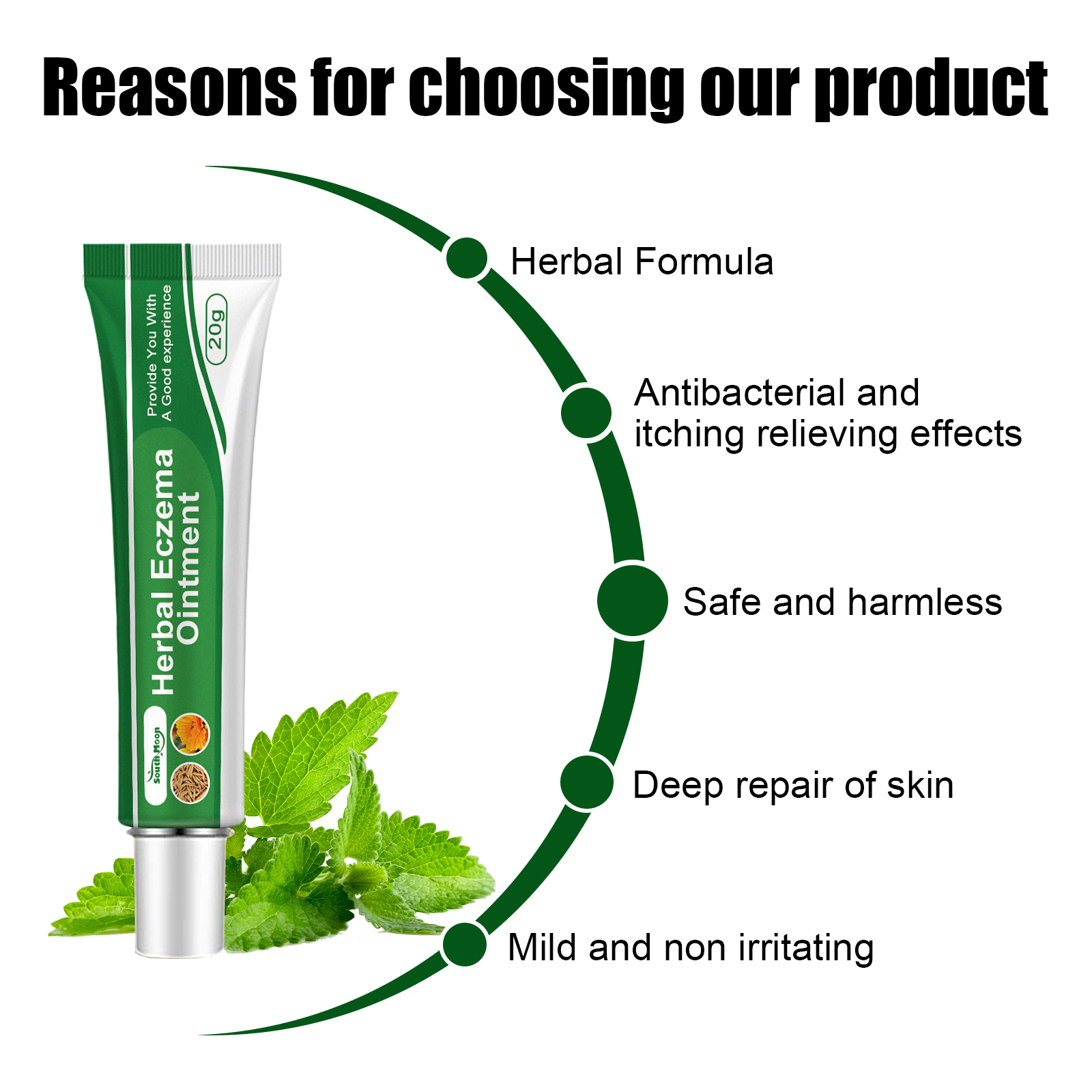 Our Herbal Eczema Ointment contains ophiopogon root extract, lavender oil, peppermint extract. It can penetrate into the bottom of the skin, deeply inhibit bacteria, gently repair skin discomfort, anti-inflammatory and itchy. Its use method is very simple: after bathing, dry the body, apply appropriate amount of this product on the affected area, massage in circles until absorbed. Relieve skin redness and itchiness, repair damaged skin.
