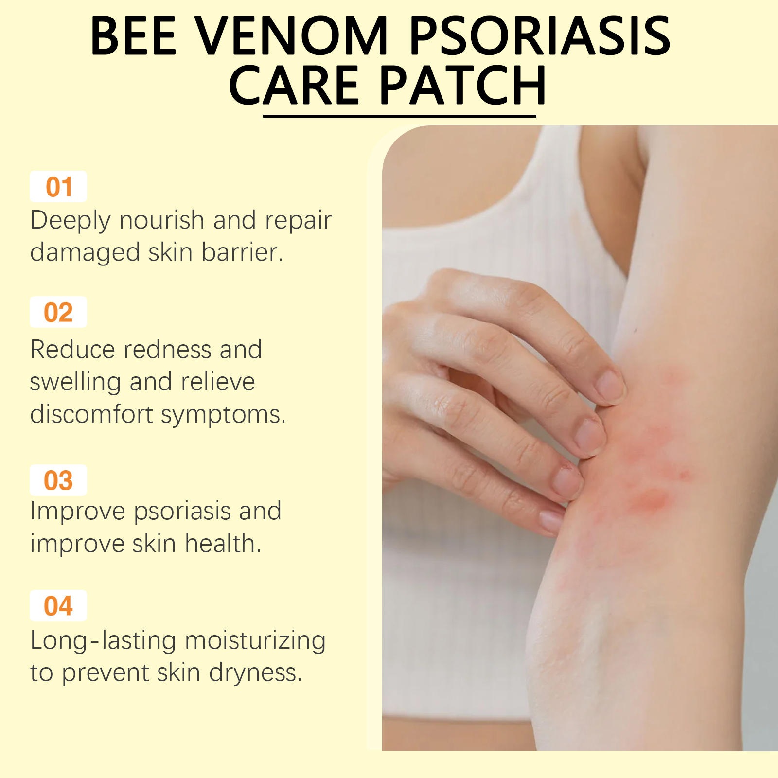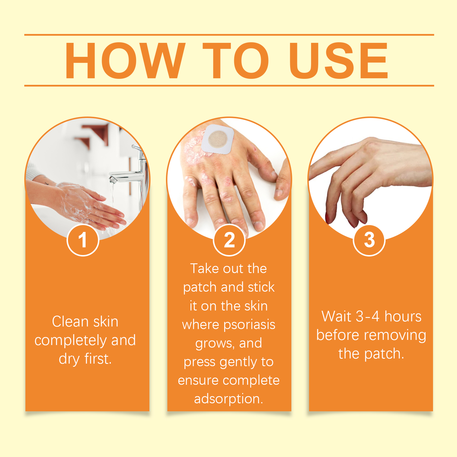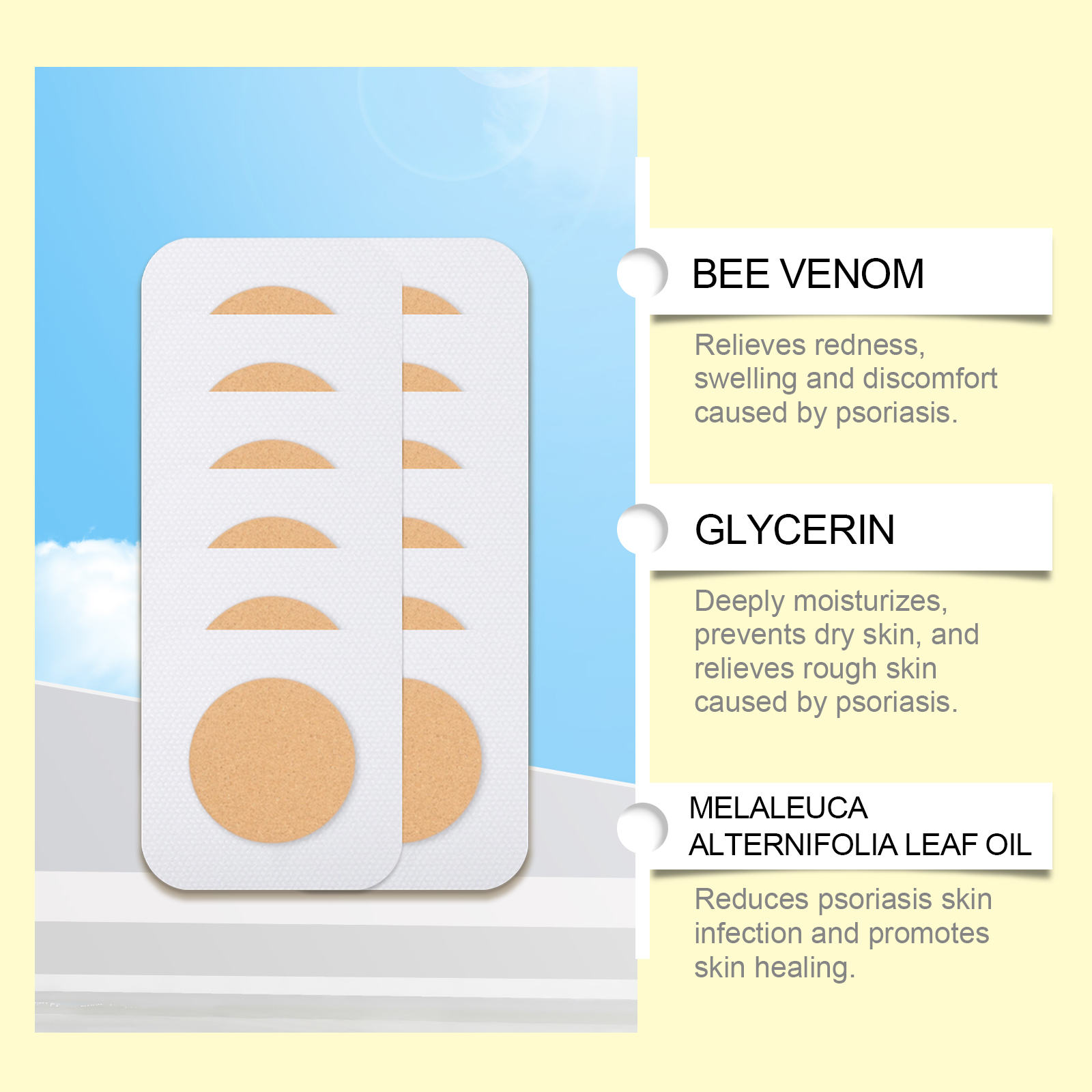 Our skin care patches contain glycerin and menthol. It reduces skin redness and inflammation and relieves discomfort. Its use method is very simple: thoroughly clean the skin dry, remove the patch on the psoriasis growing skin, gently press to ensure complete adsorption, wait 3-4 hours before removing the patch. And rich in nourishing ingredients, deep moisturizing skin to relieve dryness, improve psoriasis symptoms.
