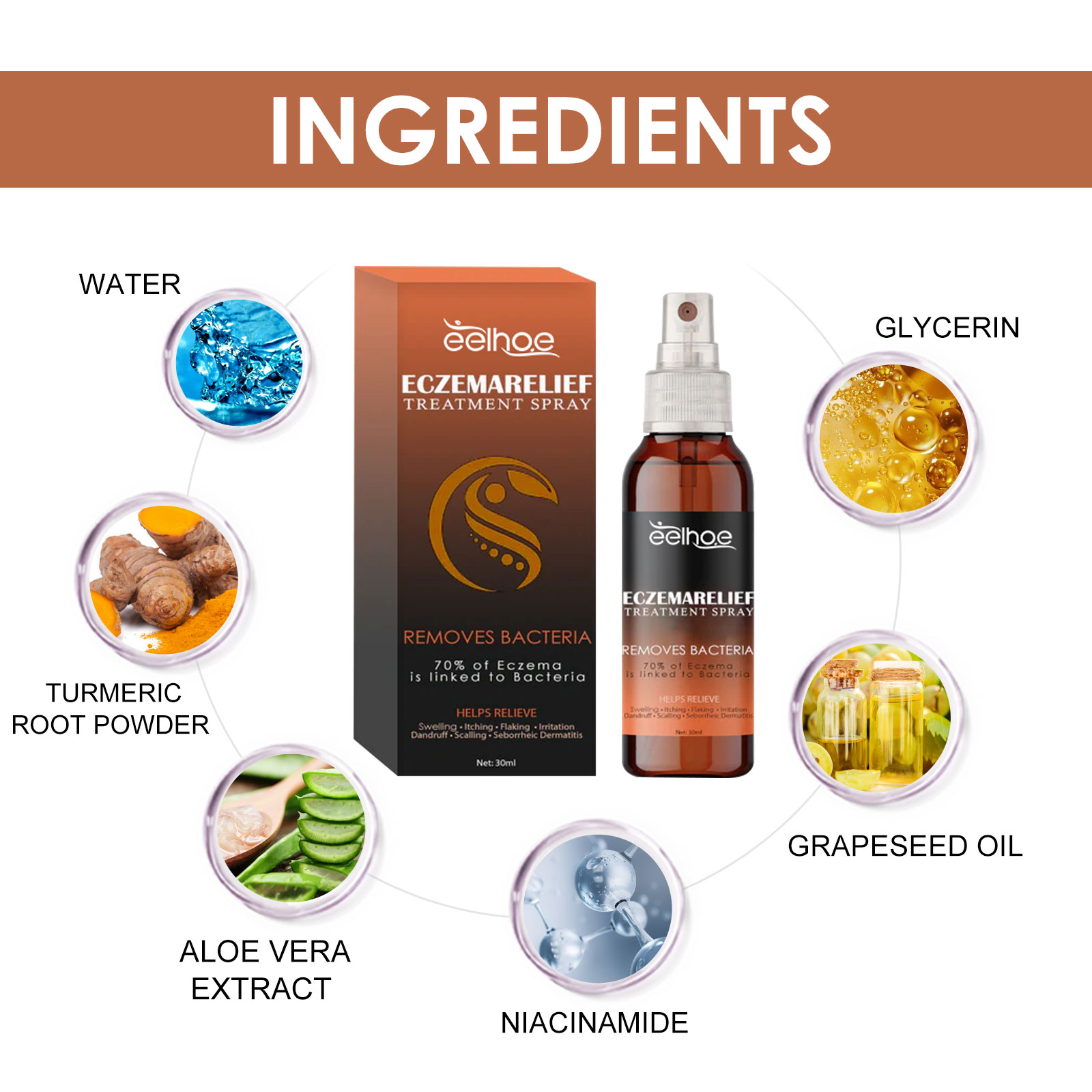 Our skin relief spray contains water, turmeric root powder, aloe vera extract. It can help relieve peeling and itching caused by eczema; Repair damaged skin, moisturize and resist inflammation. Its application method is very simple: 1. Wash and dry the skin; 2. Press 2-3 times and spray evenly on the uncomfortable parts of eczema; 3. Gently massage until absorbed. Skin relief spray reduces inflammation and redness. It is designed to reduce peeling and itching while reducing dryness and irritation. Spray on clean skin to soothe flare-ups of soft skin, reduce the regeneration of new skin cells and prevent the formation of new irritants.