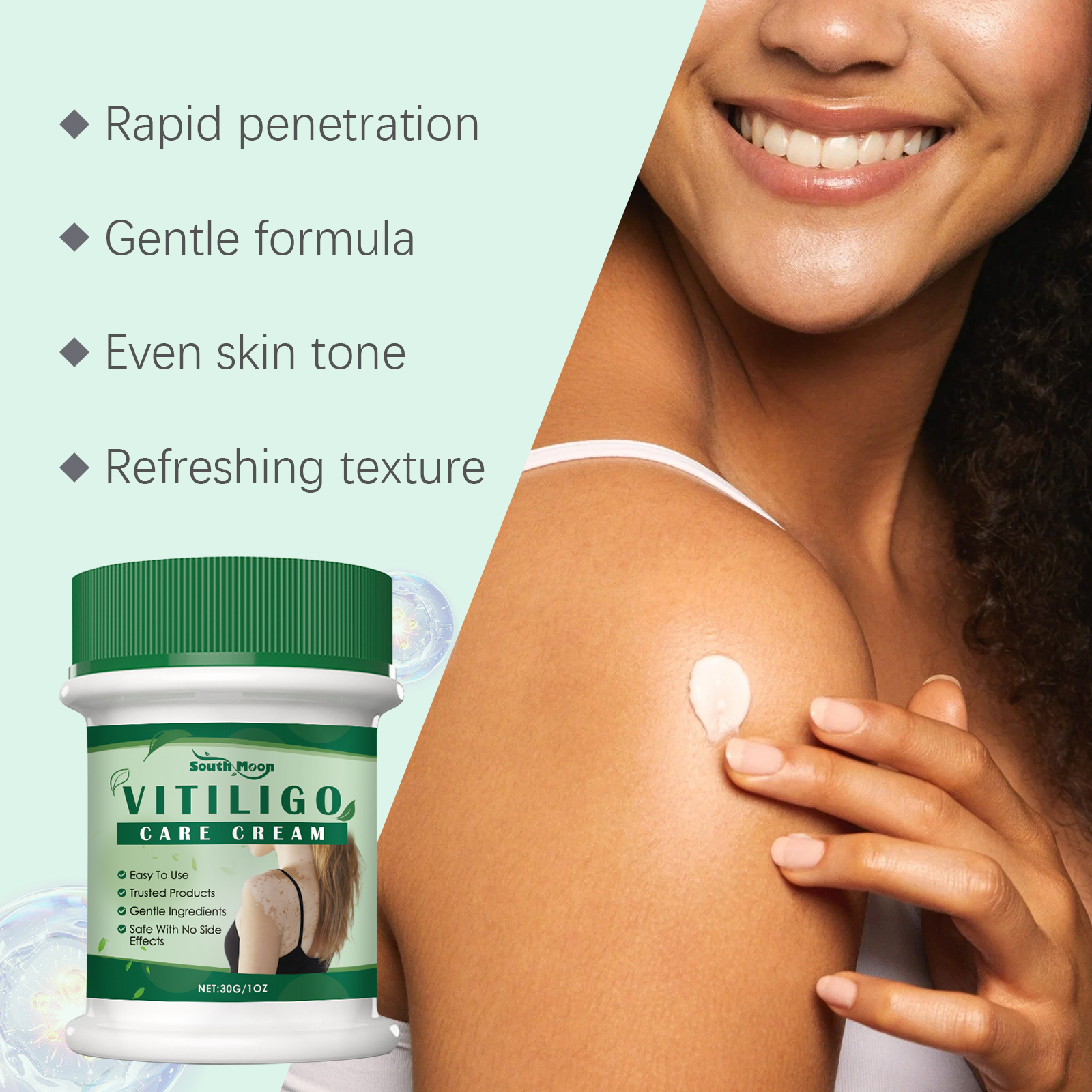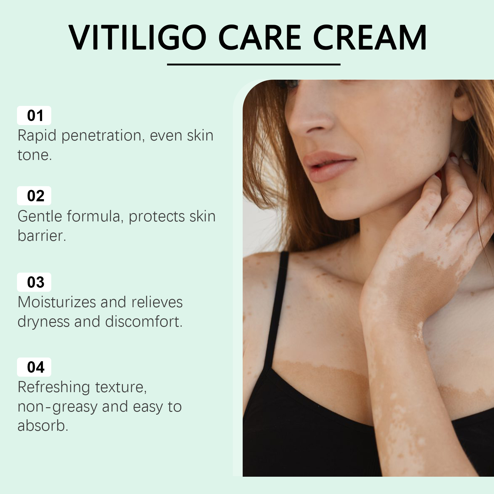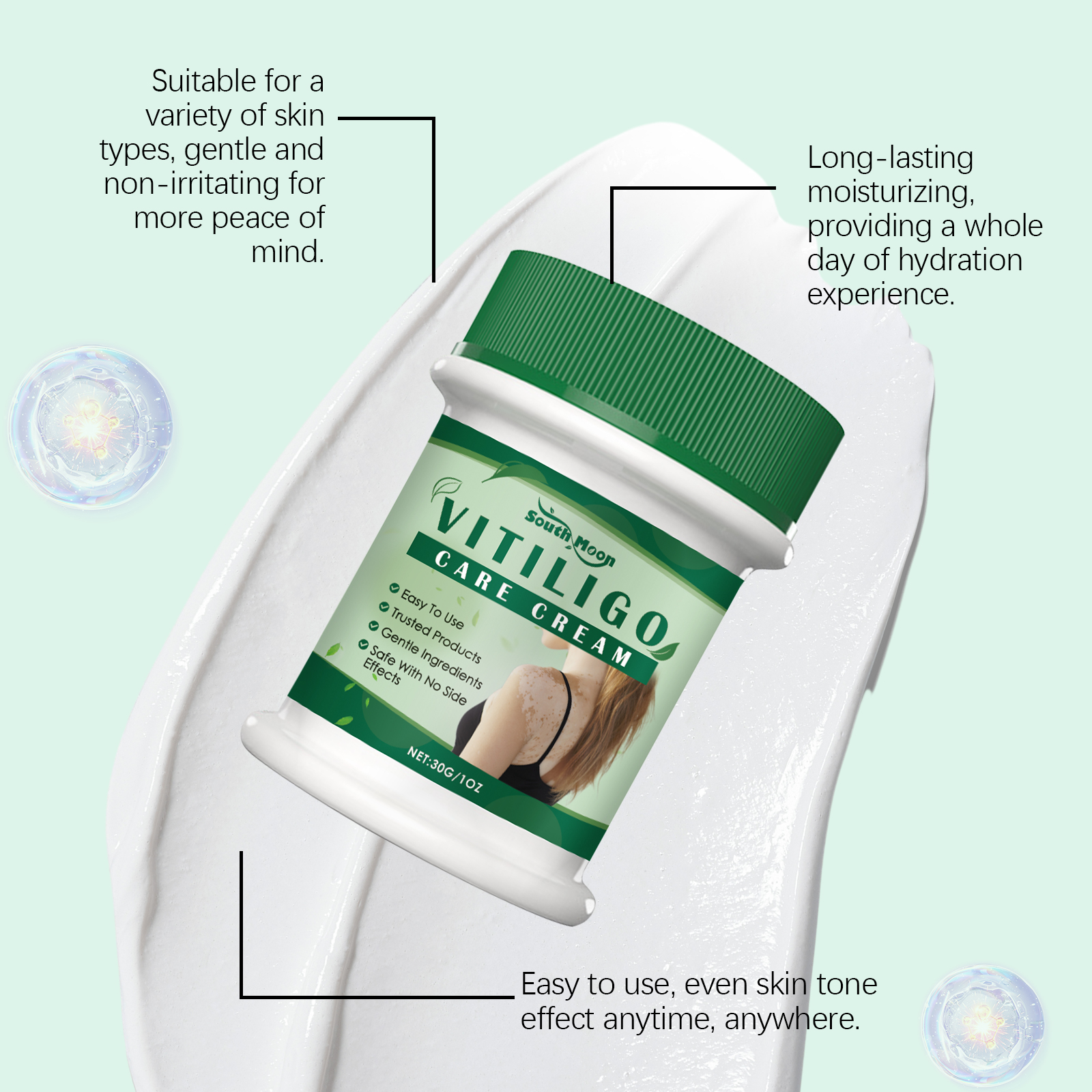 Our skin repair cream contains mint leaves and aloe vera extract. It can be easily absorbed soon after application, keeping a refreshing feeling. Effectively improve uneven skin tone and make skin more even and clean. Its application method is very simple: clean and dry skin, apply appropriate amount of this product to the affected area with white spots, gently massage until absorbed. And can lock moisture, make the skin soft and moisturized for a long time, fine texture, malleable soft, easier to use.