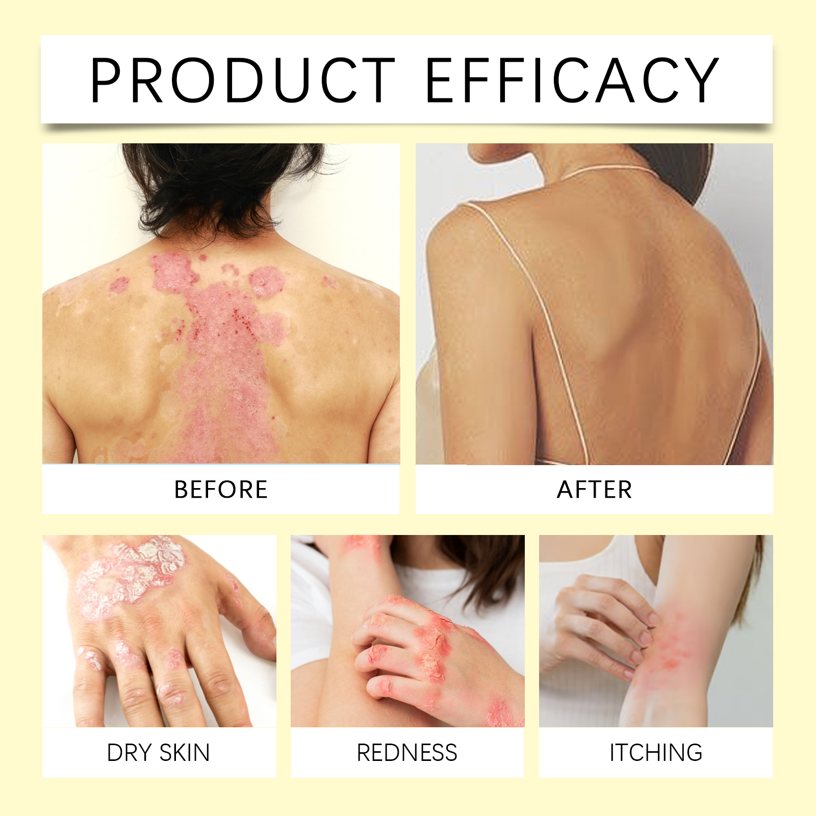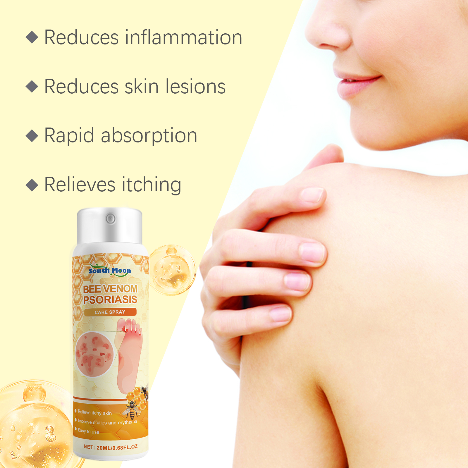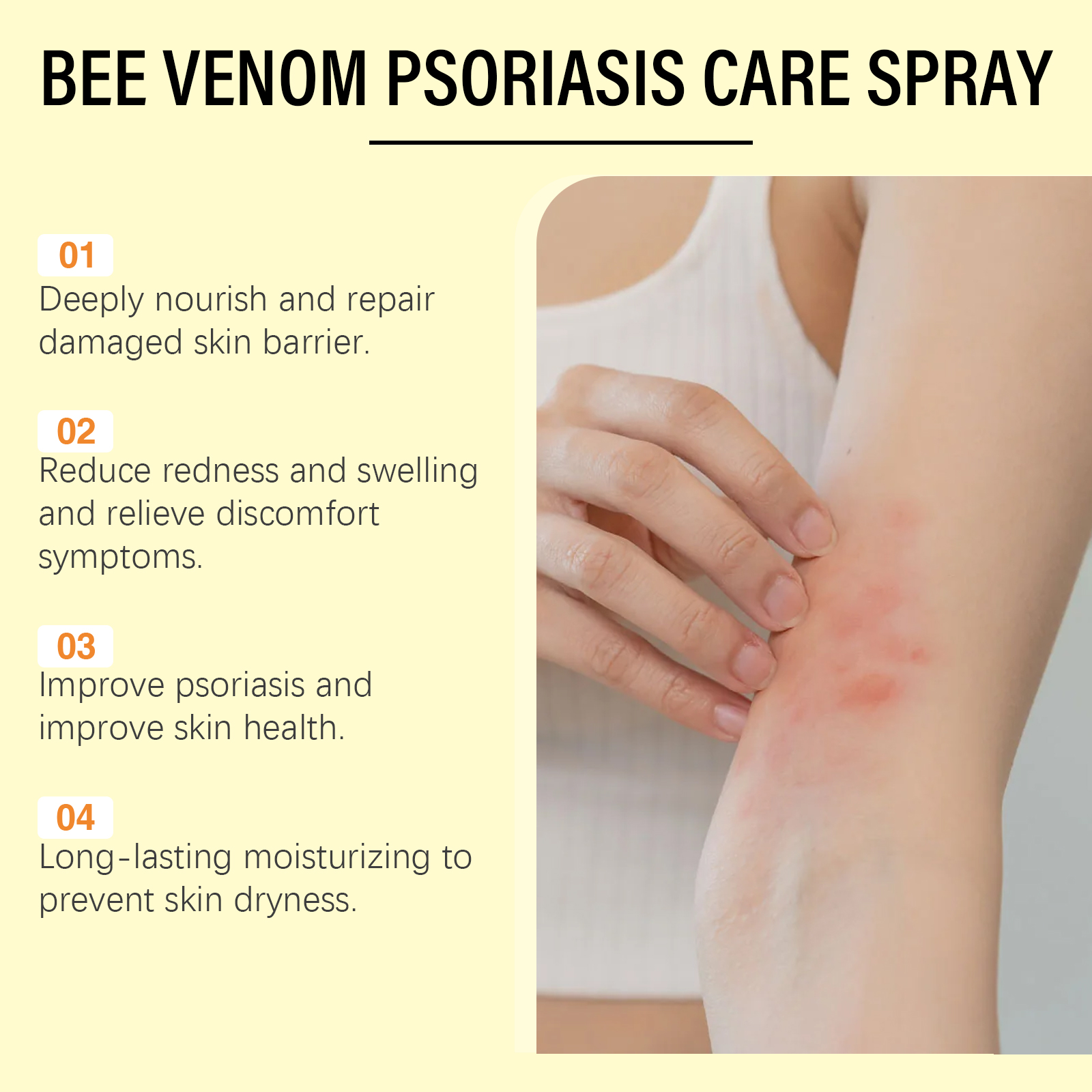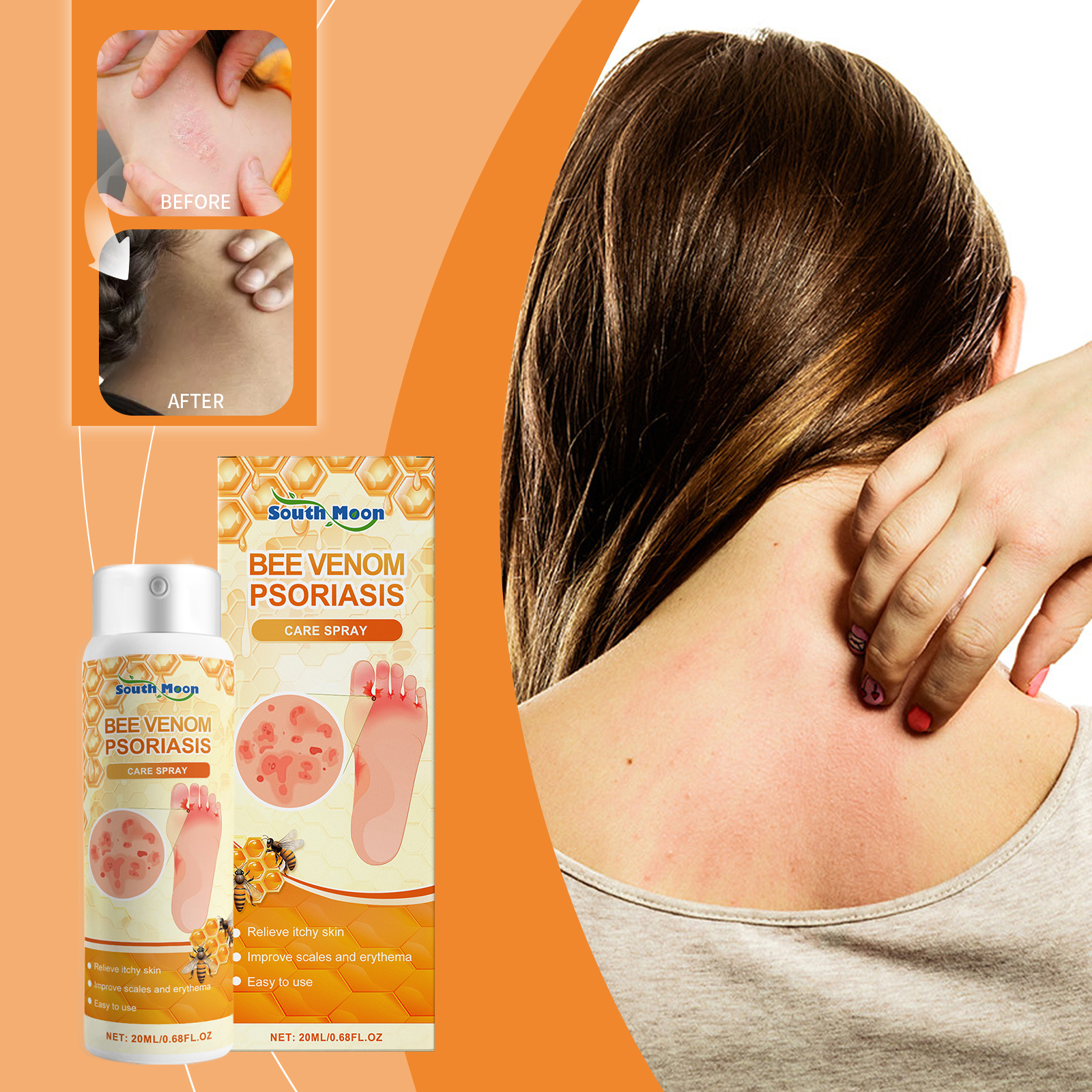 Our skin repair spray contains aloe vera leaf extract and peppermint oil. It reduces skin redness and inflammation and relieves discomfort. The way to apply it is simple: thoroughly clean the skin and dry it first. Apply appropriate amount of this product evenly on the skin of psoriasis growth, gently massage to promote absorption. And rich in nourishing ingredients, deep moisturizing skin to relieve dryness, has improved psoriasis symptoms.