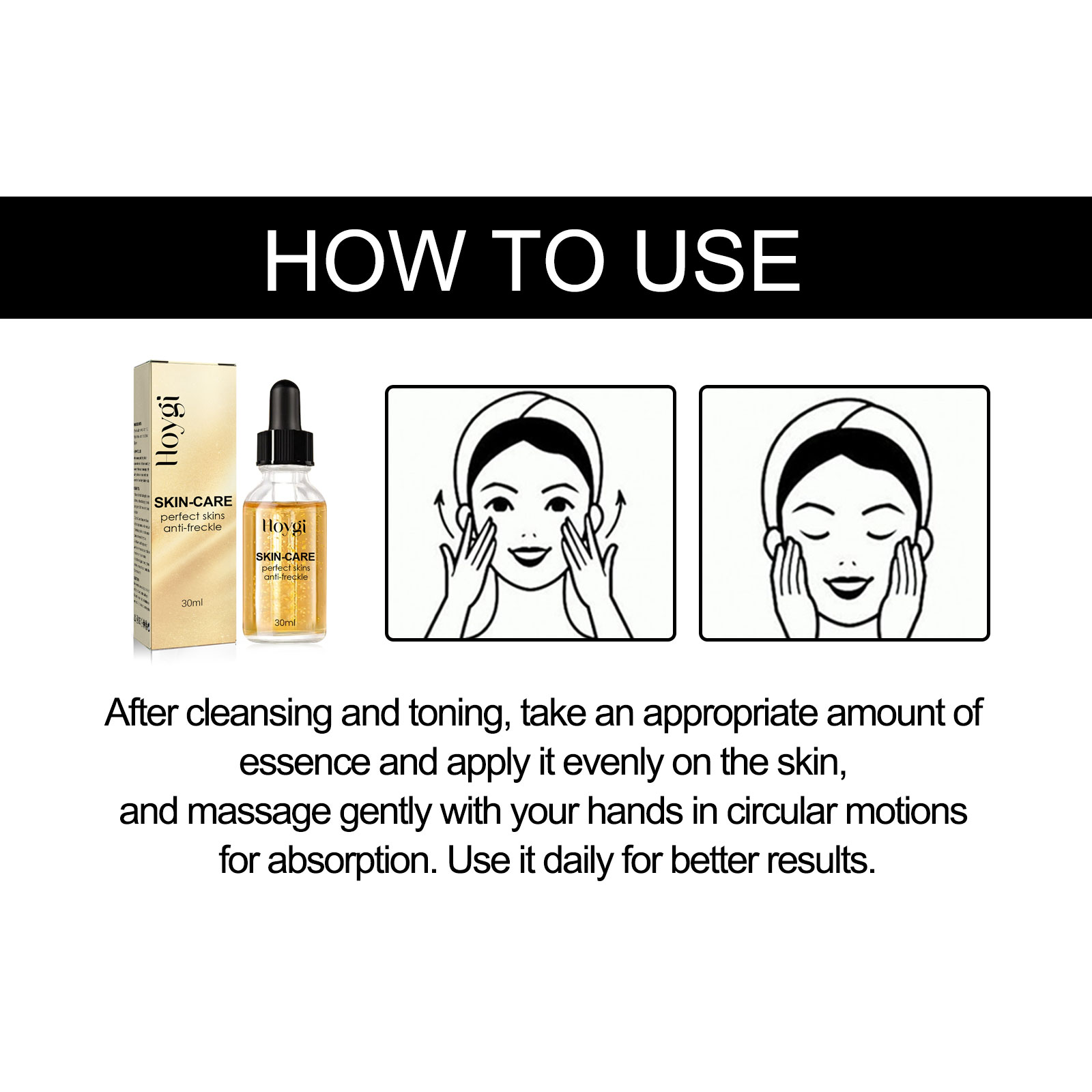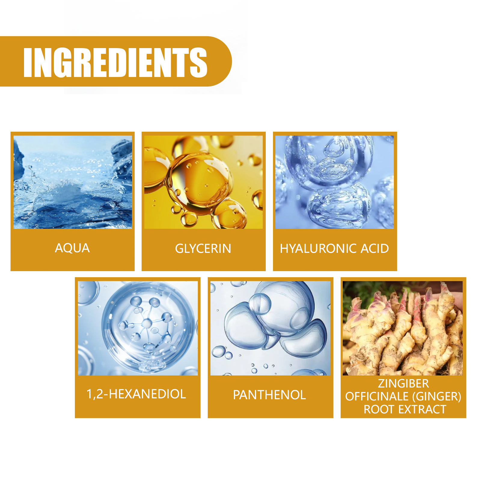 Our skin serum contains hyaluronic acid and ginger root extract. It can replenish water, moisturize and nourish the skin, fade wrinkles and increase skin elasticity. Its use method is very simple: after cleansing and toning, take appropriate amount of essence evenly apply on the face, gently pat with your hand until absorbed. Reduce wrinkles, tighten skin, and make you look younger and more radiant.