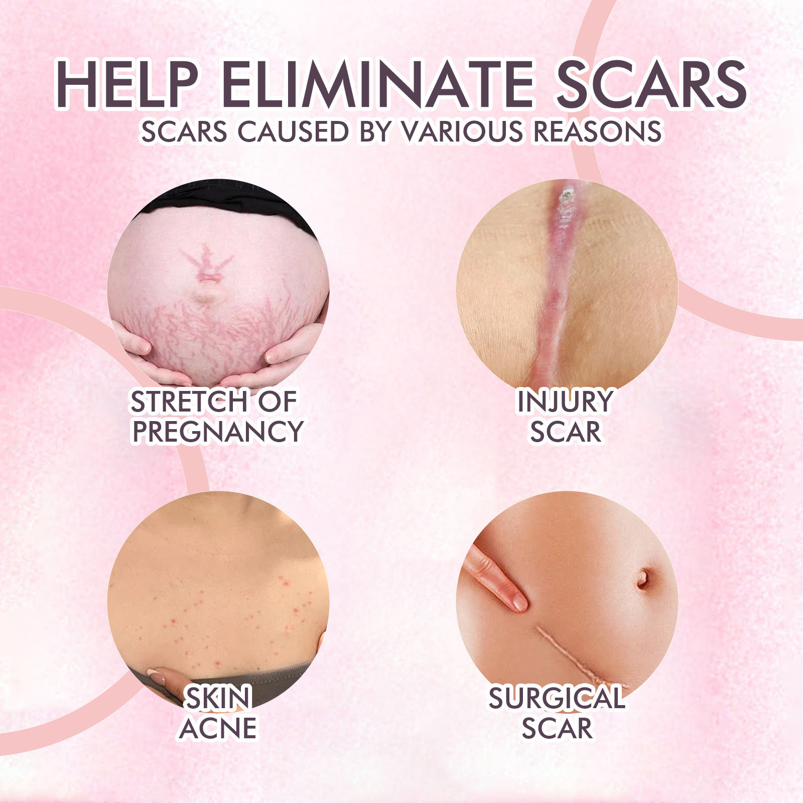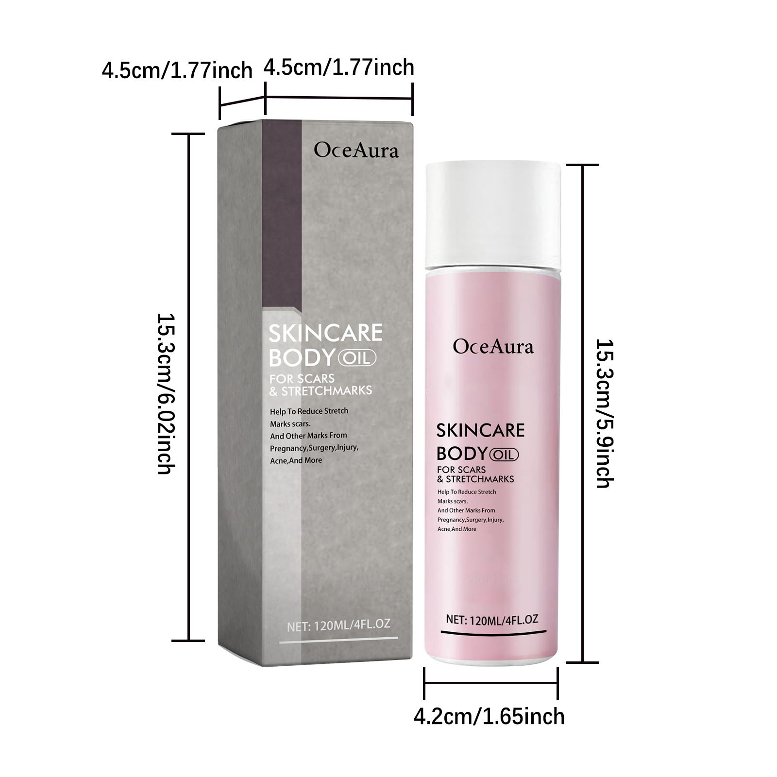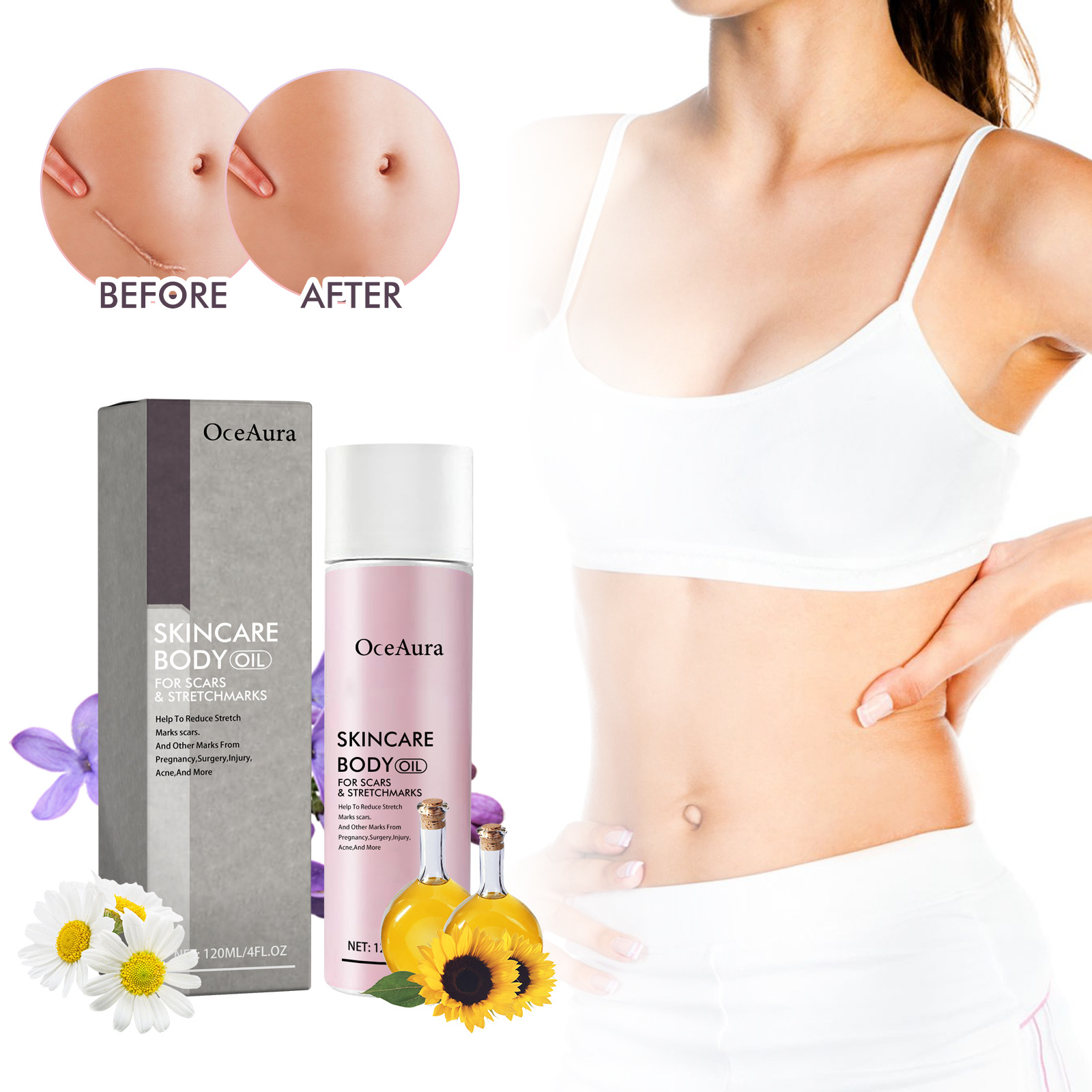 Our Skincare Body Oil contains Retinol, Tocopherol, Chrysanthellum Indicum Extract. It can eliminate scars caused by many causes, increase skin elasticity, and improve skin quality. Its application method is very simple: clean and dry the skin, take appropriate amount of product on the hand, rub with the palm of the hand, slightly heat, evenly apply to the skin, gently massage the skin to absorb. It can repair damaged skin and fade scars.