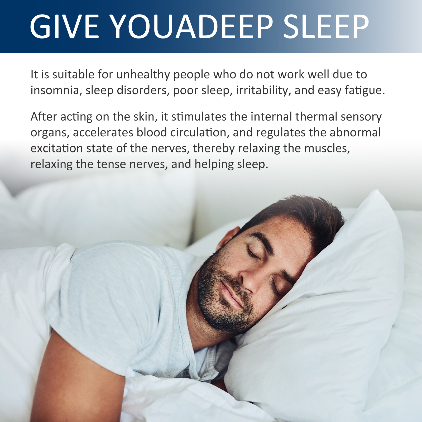 Our sleep aid patch contains codonopsis, Coptis. It can stimulate the heat-sensing organs in the body, accelerate blood circulation, regulate the abnormal excited state of nerves, thereby relaxing muscles, relaxing tense nerves, and helping sleep. The way to use it is simple: wash and dry your belly button before use, put a patch on your belly button before going to bed, and remove it when you get up (about 8-12 hours). And it can help you sleep and fall asleep quickly.