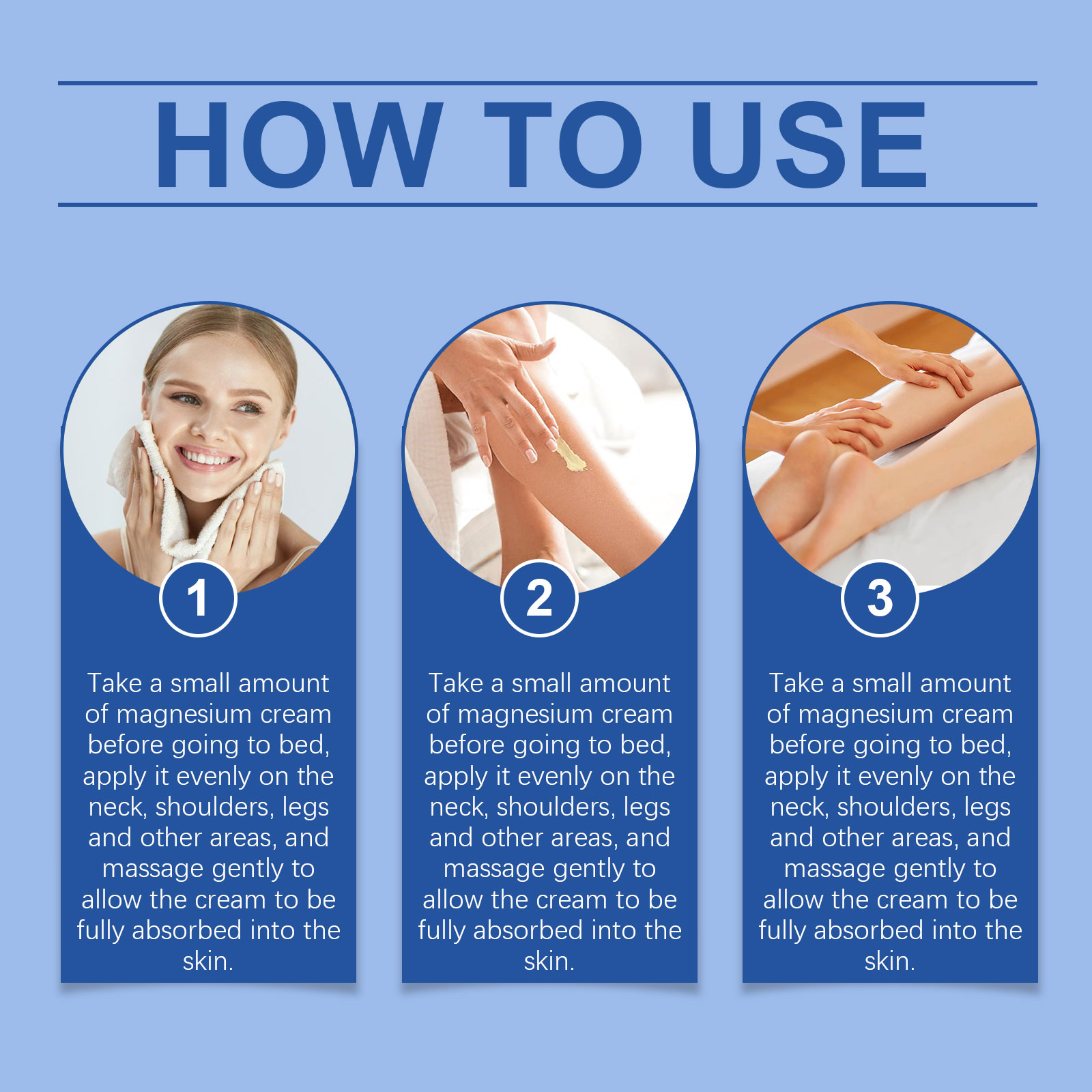 Our sleep magnesium cream contains aloe vera leaf extract, tocopherol (vitamin E). It can help you fall asleep easily and release the stress of the day. Its use is very simple: before going to bed, take a small amount of magnesium cream, evenly apply to the neck, shoulders, legs and other parts, and gently massage, so that the cream fully absorbed into the skin. Take a small amount of magnesium cream before going to bed, evenly apply to the neck, shoulders, legs and other parts, and gently massage, so that the cream fully absorbed into the skin. Take a small amount of magnesium cream before going to bed, evenly apply to the neck, shoulders, legs and other parts, and gently massage, so that the cream fully absorbed into the skin. It can also improve the quality of sleep and help you get a better night's rest.