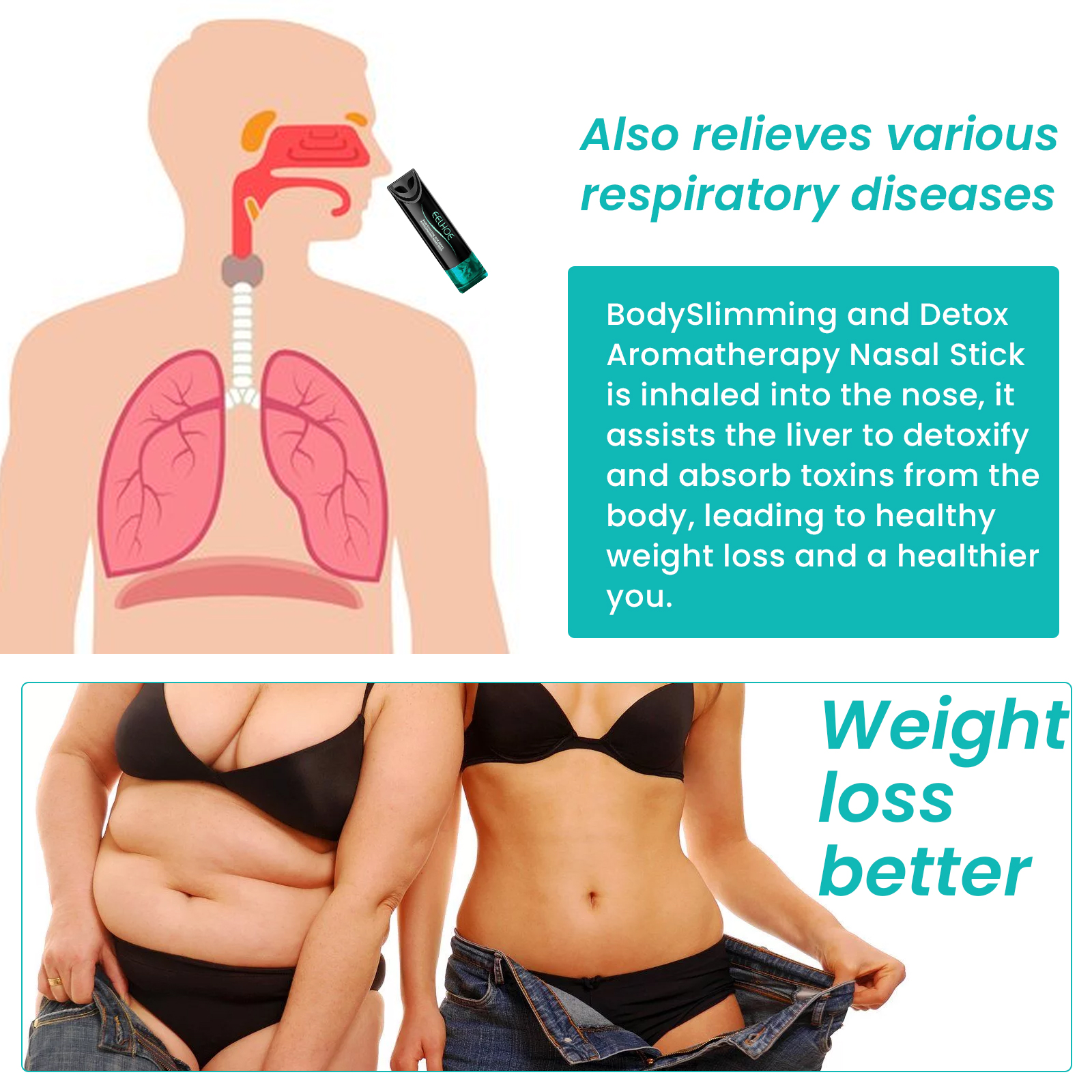 Our body Shaping Aromatherapy nasal cleanser contains borneol extract, black pepper extract and peppermint oil. It helps slim and shape the body. Its use method is very simple: 1. Turn the tube body 180 degrees to open. 2. Place the inhaler next to each nostril and inhale gently for 1 to 2 seconds. After use, it helps to detoxify the liver and absorb endotoxins in the body, thus achieving healthy weight loss.