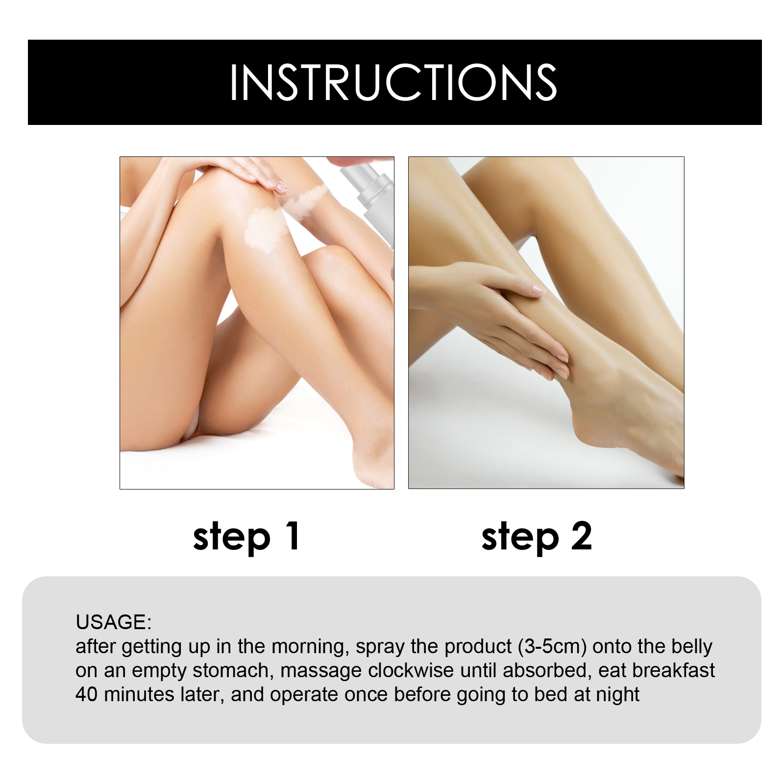 Our body sprays contain peach blossom, Bitincha and licorice. It can improve blood circulation, speed up metabolism, burn calories, activate cells, tighten the skin, and make the skin firm and elastic. Its use method is very simple: after getting up in the morning, spray this product (3-5cm) on the empty stomach, massage clockwise until absorption, eat breakfast 40 minutes later, and operate once before going to bed in the evening. Slimming spray improves blood circulation, speeds up metabolism and burns calories. While consuming excess fat, it activates cells and tightens the skin, making it firm and elastic.