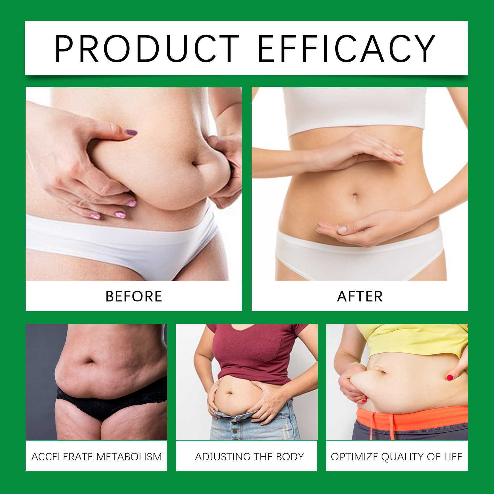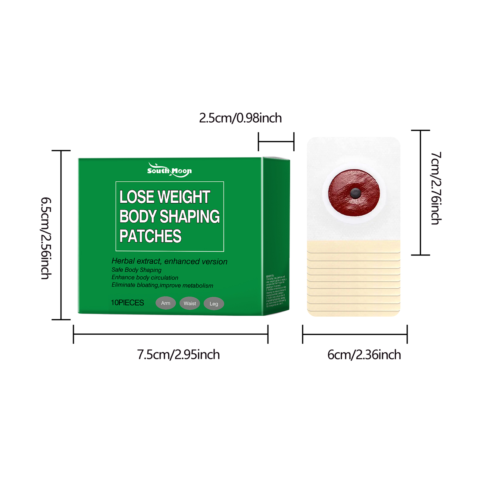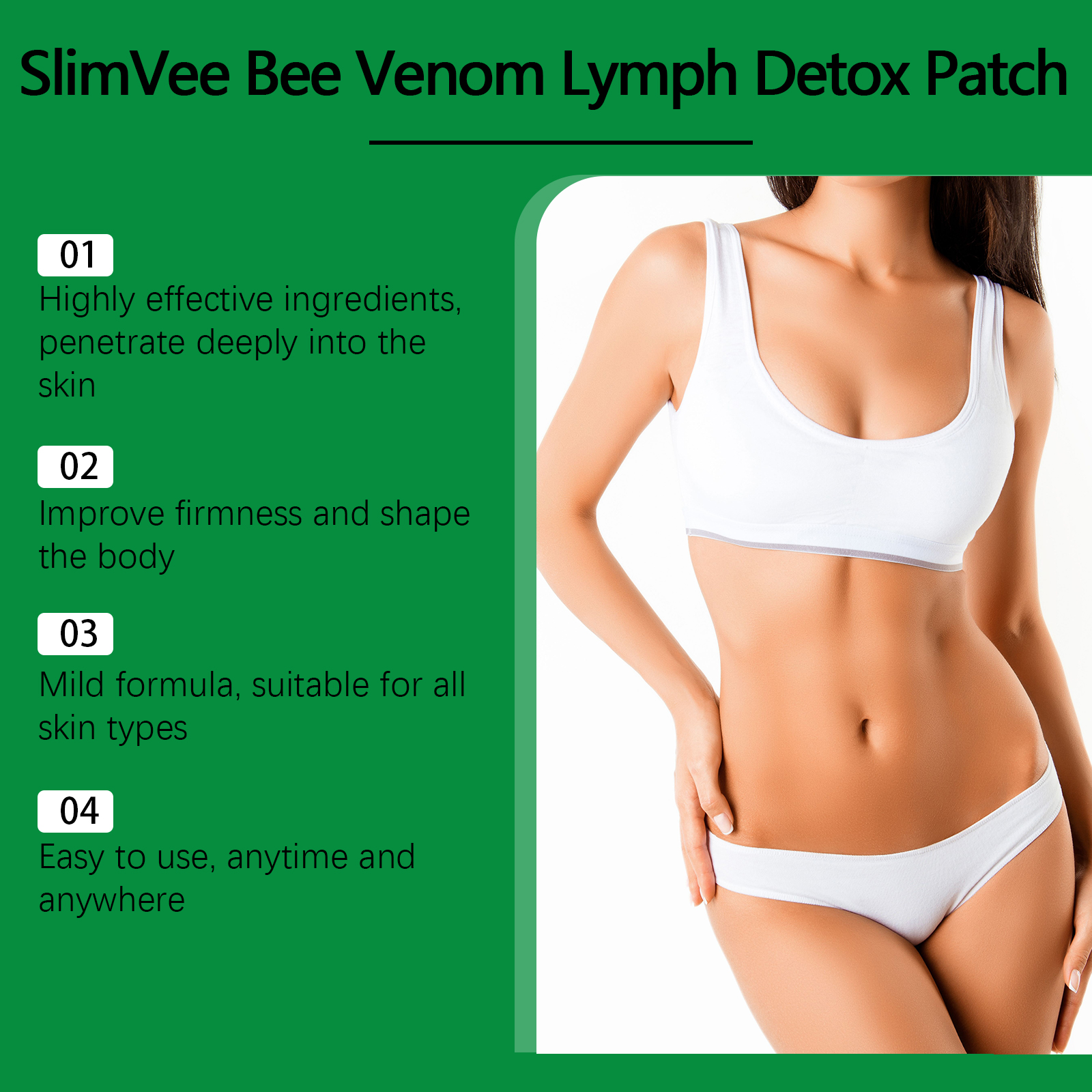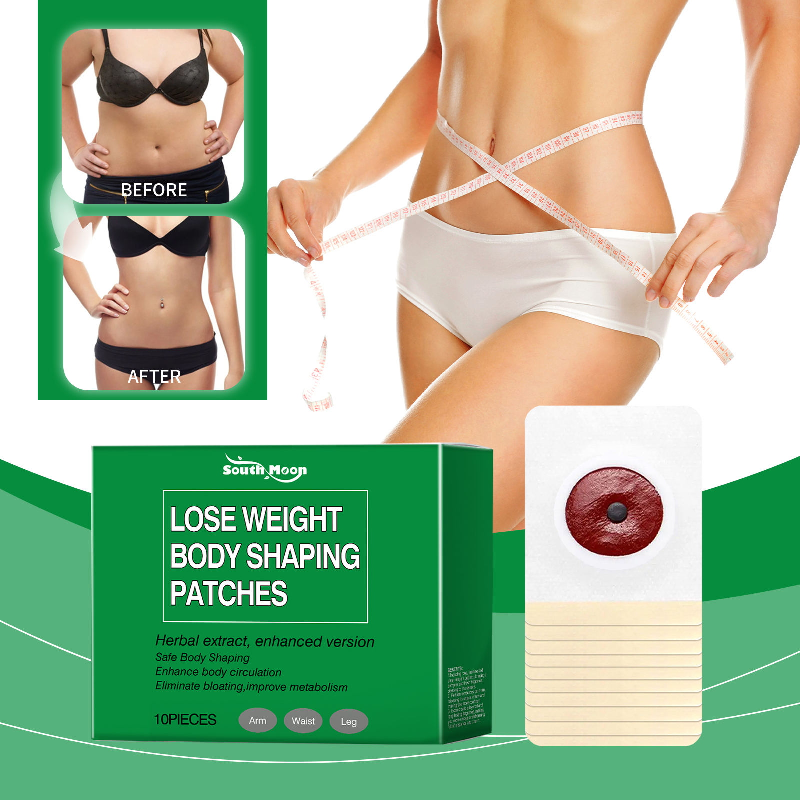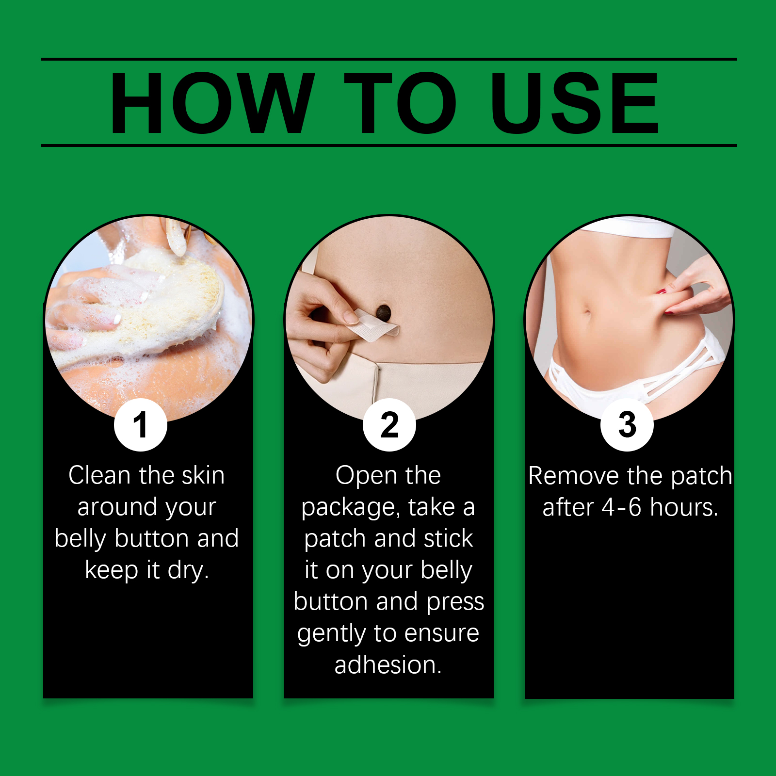Our body shaping patches contain safflower flower extract and ginger root extract. It improves firmness and shapes the body. The way to use it is simple: clean the skin around the belly button and keep it dry. Open the package, take a patch and attach it to your belly button, pressing gently to ensure adhesion. Then wait 6 hours to remove the patch. It can also help to adjust the body condition and increase vitality.