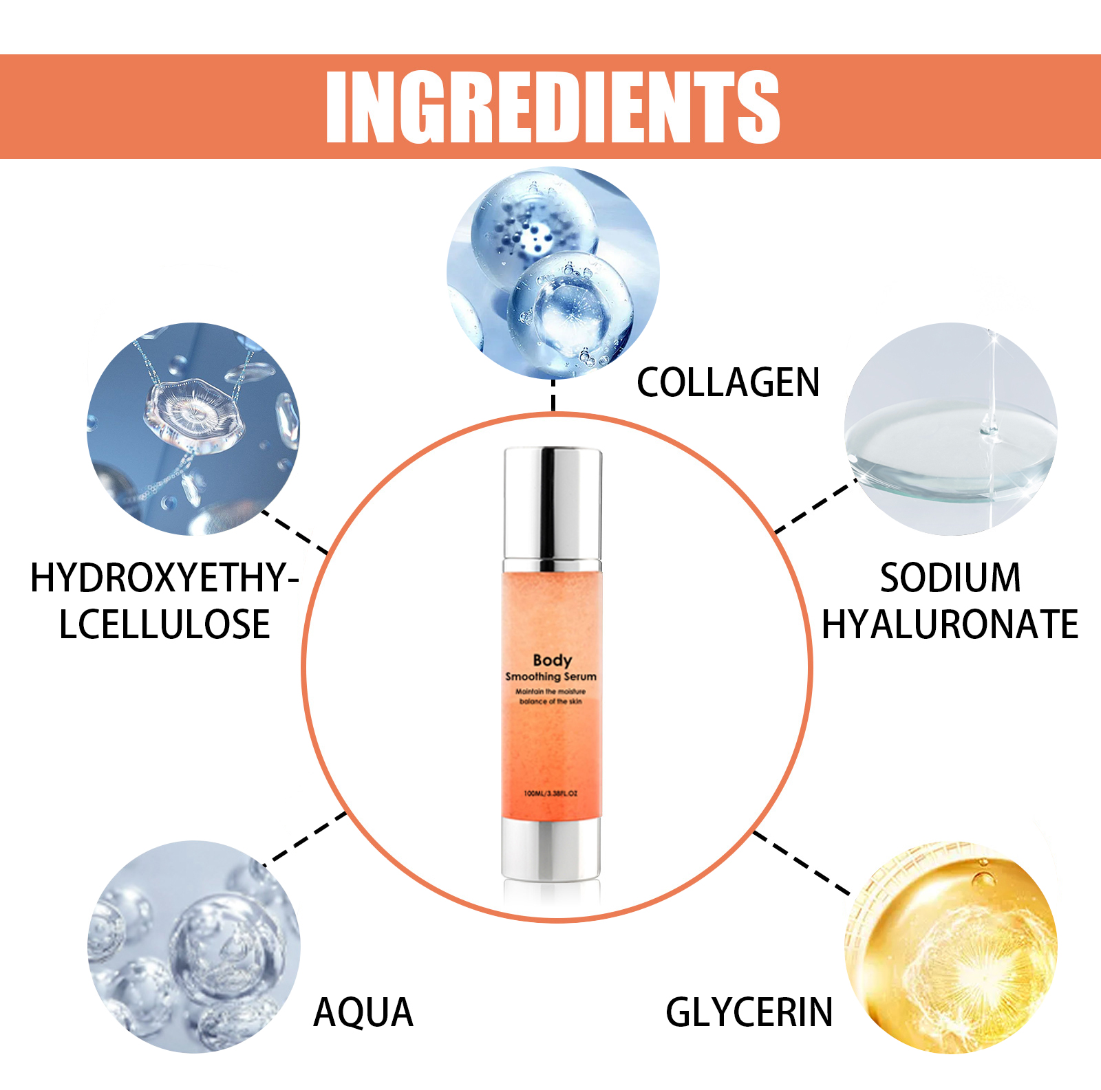 Our smooth body serum contains glycerin and hydroxyethyl cellulose. It can repair dry and aging skin and restore skin vitality. Softening Essence reduces skin wrinkles, smooths and protects your skin, helping to alleviate the obvious signs of aging. Its use method is very simple: 1. Please clean the skin before use; 2. Take 2-3 drops of serum and apply to the whole body skin; 3. Gently knead, massage until completely absorbed (it is recommended to use once in the morning and evening, the effect is better). Smooth Body Essence hydrates dry skin daily, maintaining moisture balance and replenishing natural oils.