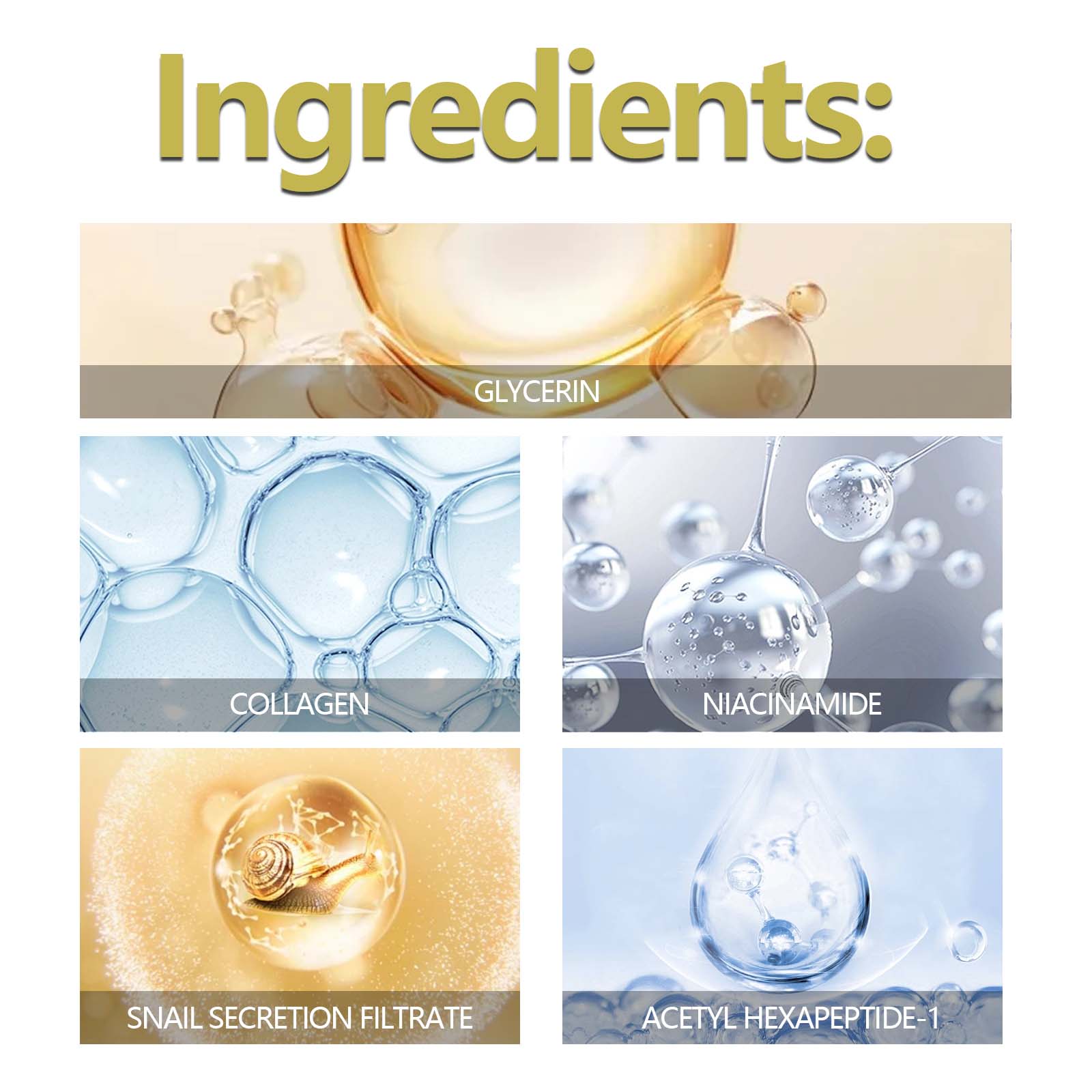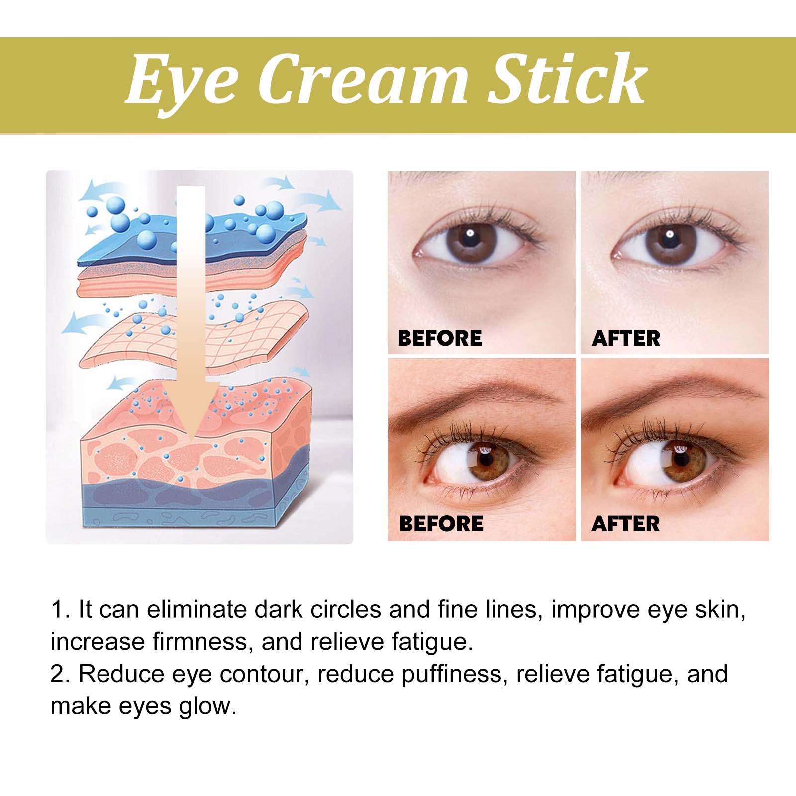 Our lightening Fine grain Snail eye Cream bar contains mineral oil, glycerin stearate, carbomer. It eliminates dark circles and fine lines, improves eye skin, increases firmness, relieves fatigue, reduces puffiness, and makes eyes glow. Its application method is very simple: clean and dry the skin, open the product, rotate the eye cream outward about 5 mm, gently apply the eye cream around the eye in a circular motion, use 2-3 times a day for better results. It can eliminate dark circles and fine lines, improve eye skin, increase firmness and relieve fatigue.