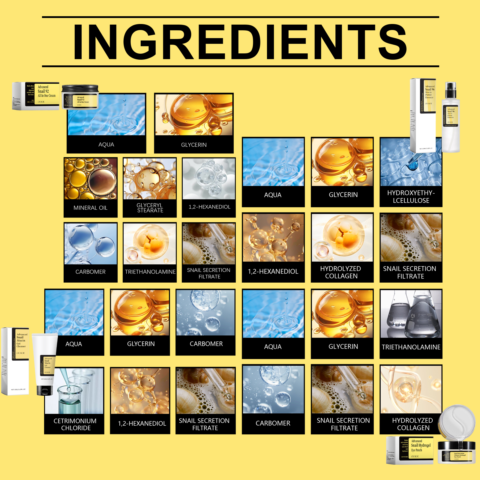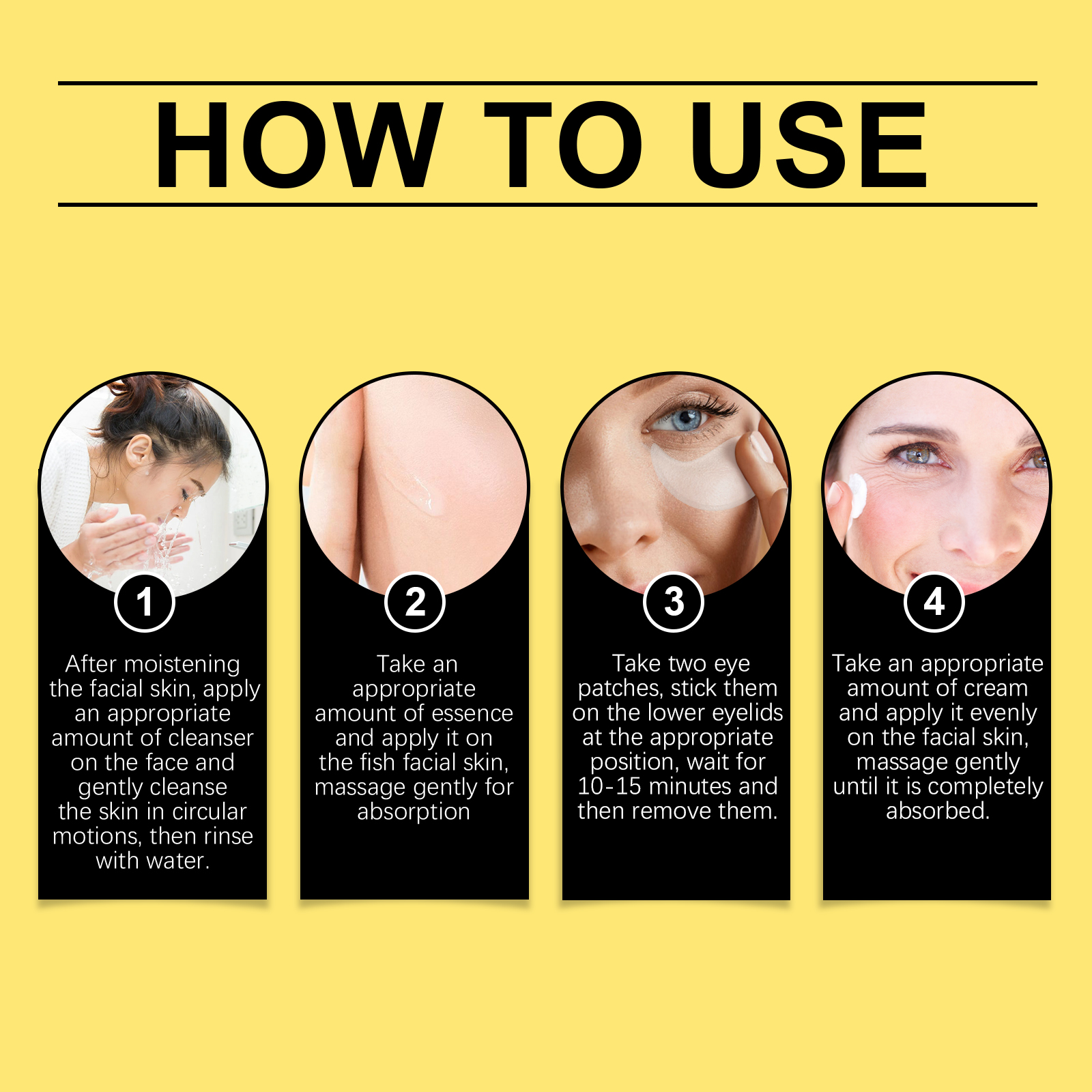 Our Snail Facial gift box contains cream: glycerin, mineral oil; Essence water: glycerin, hydroxyethyl cellulose; Cleansing gel: Glycerin, carbomer; Eye mask: hydrogel, glycerin. It strengthens the skin's natural defenses. Its application method is very simple: after wetting the facial skin, apply an appropriate amount of cleanser to the face and gently clean the skin in a circular manner, and then rinse off with clear water. Apply appropriate amount of serum to fish face skin, gently massage until absorbed, take two eye patches, stick to the appropriate position of the lower eyelid for 10-15 minutes and then remove. Apply appropriate amount of the cream evenly on the face and gently massage until completely absorbed. And can lock in moisture deep, long-term moisturizing.