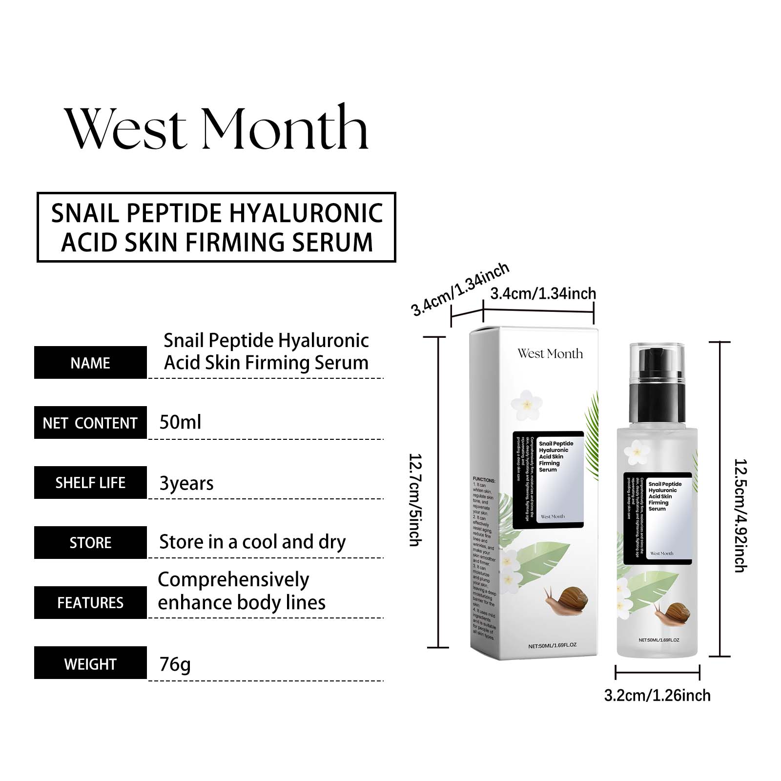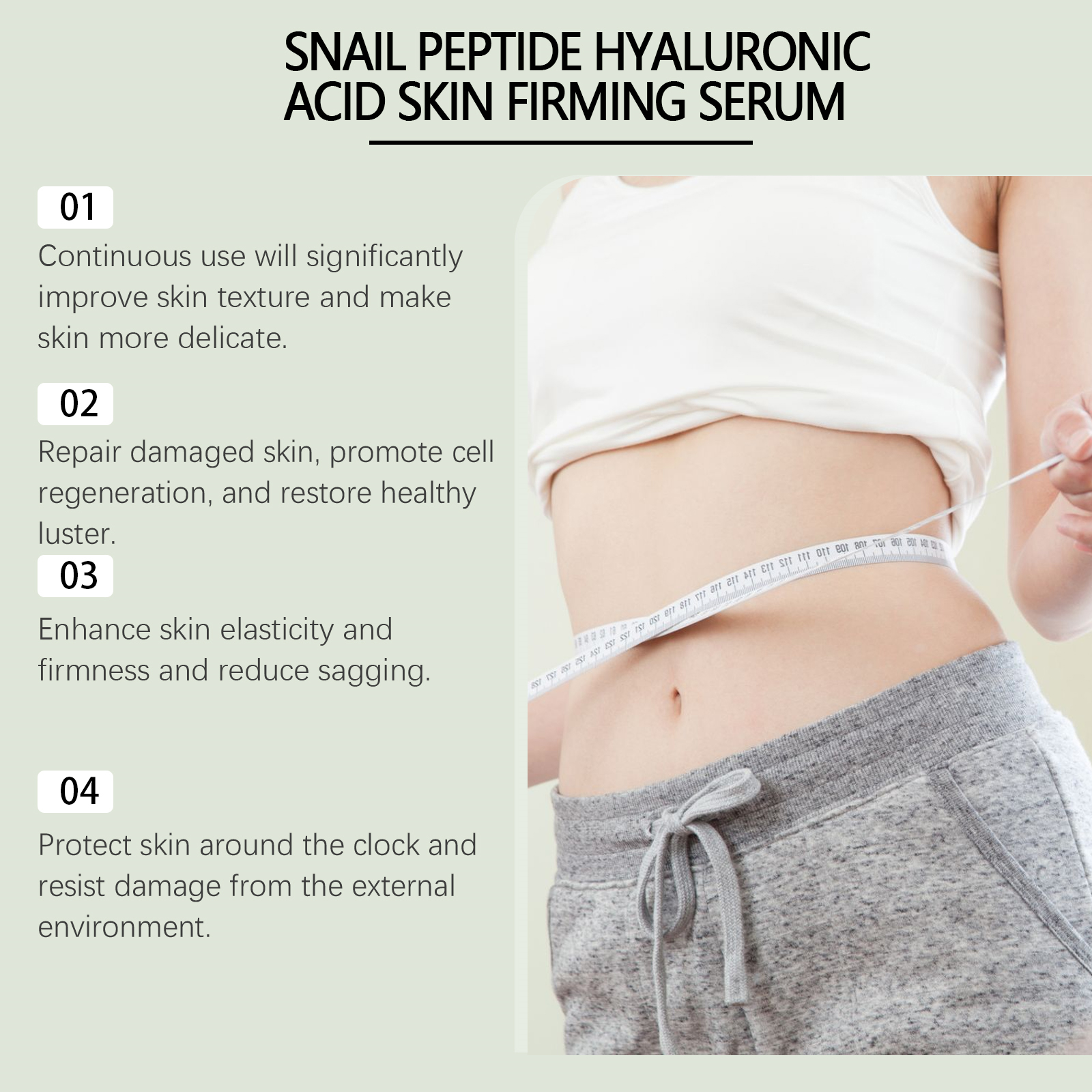 Our snail peptide hyaluronic acid firming serum contains hyaluronic acid and niacinamide. It can adjust the skin tone and restore skin vitality. Its application method is very simple: thoroughly clean and dry the skin, apply an appropriate amount of this product evenly on the neck, legs, abdomen, arms or other parts of the body, gently massage to promote better absorption. And it can protect the skin all day long and resist the damage of the external environment.